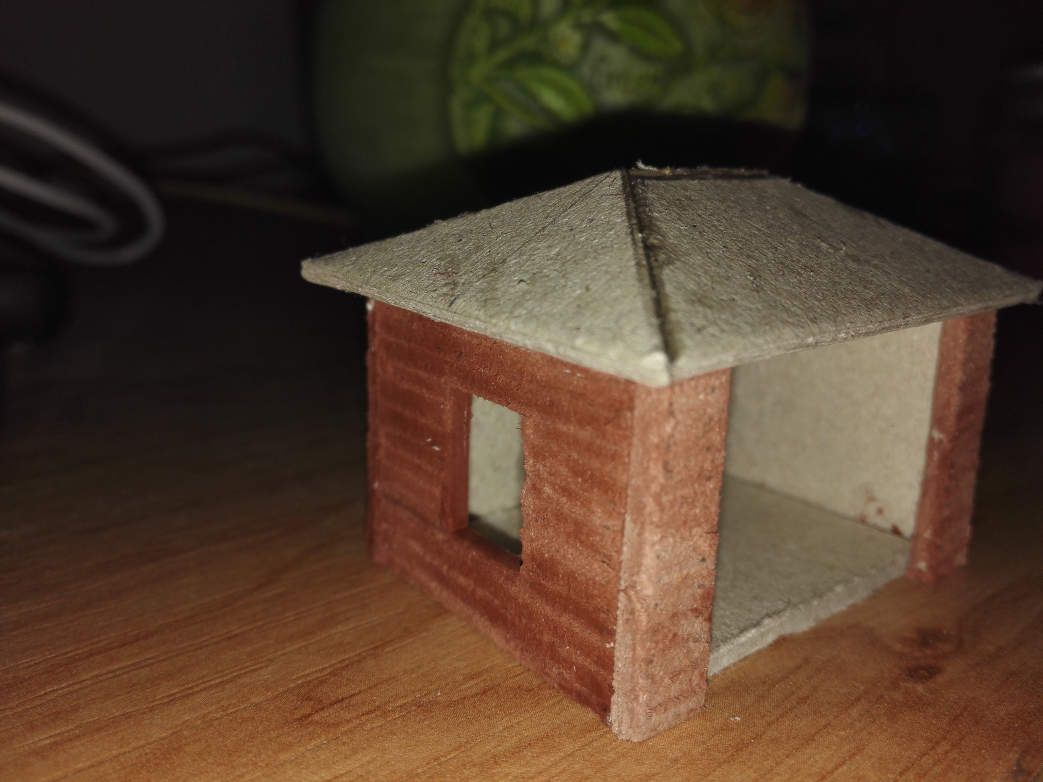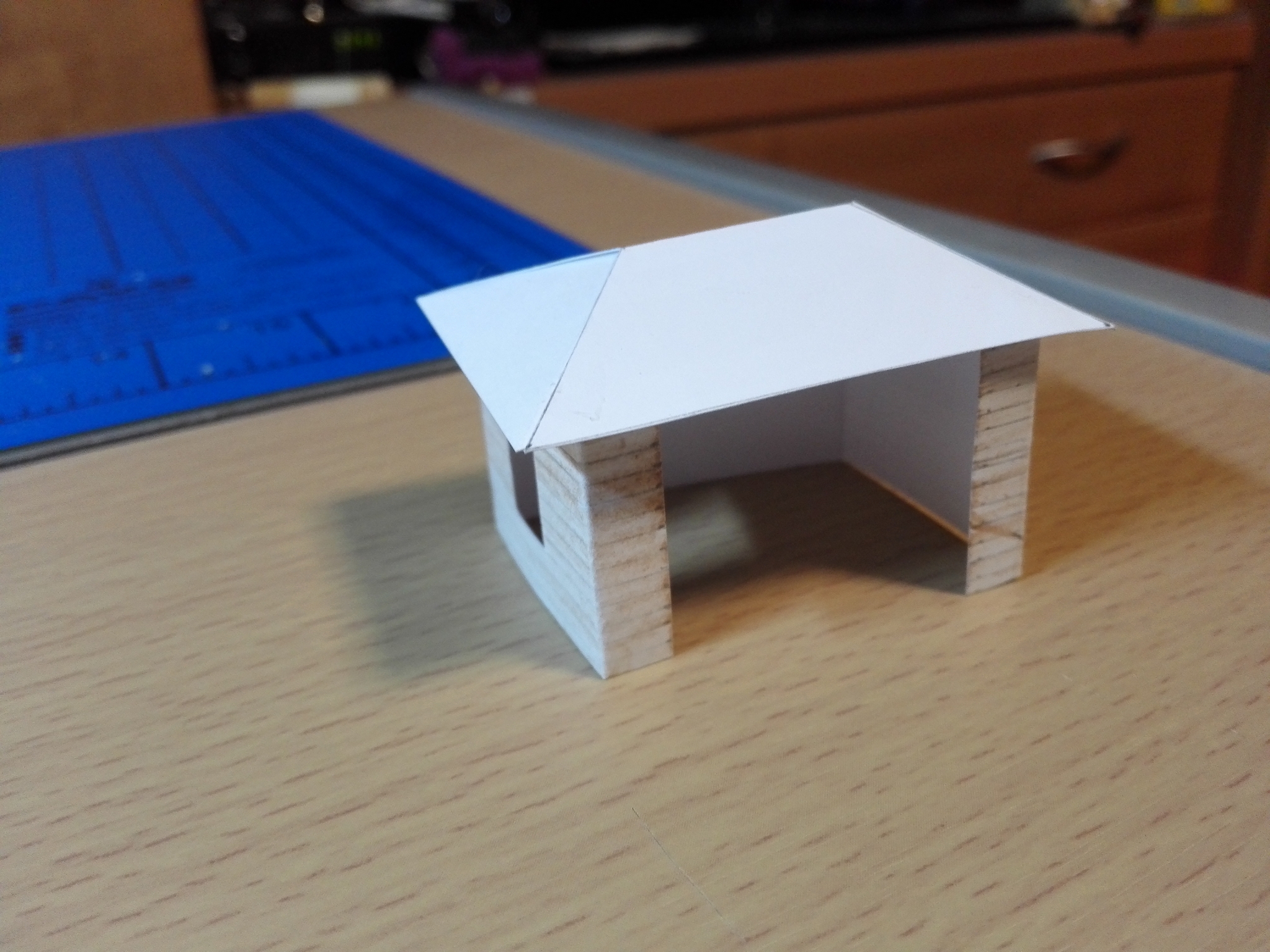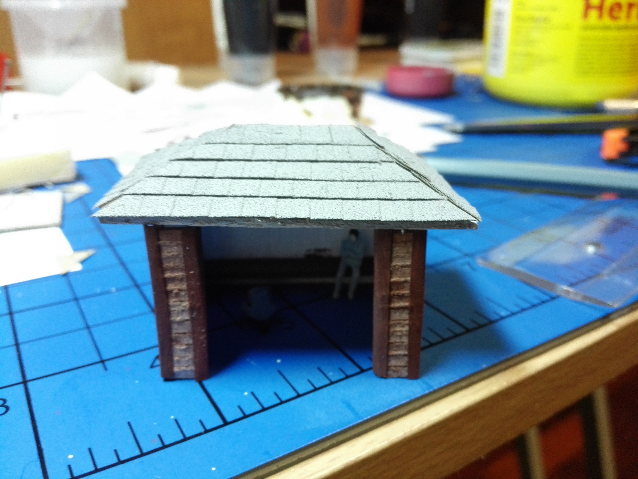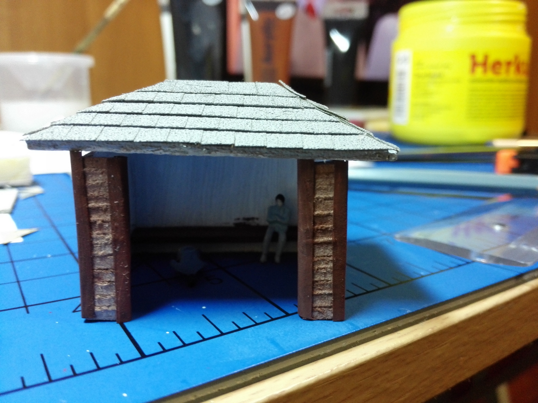 Na závěr slepíme střechu a zdi dohromady. Dále můžeme vybavit uvnitř lavičkou a nějakýma lidičkama.