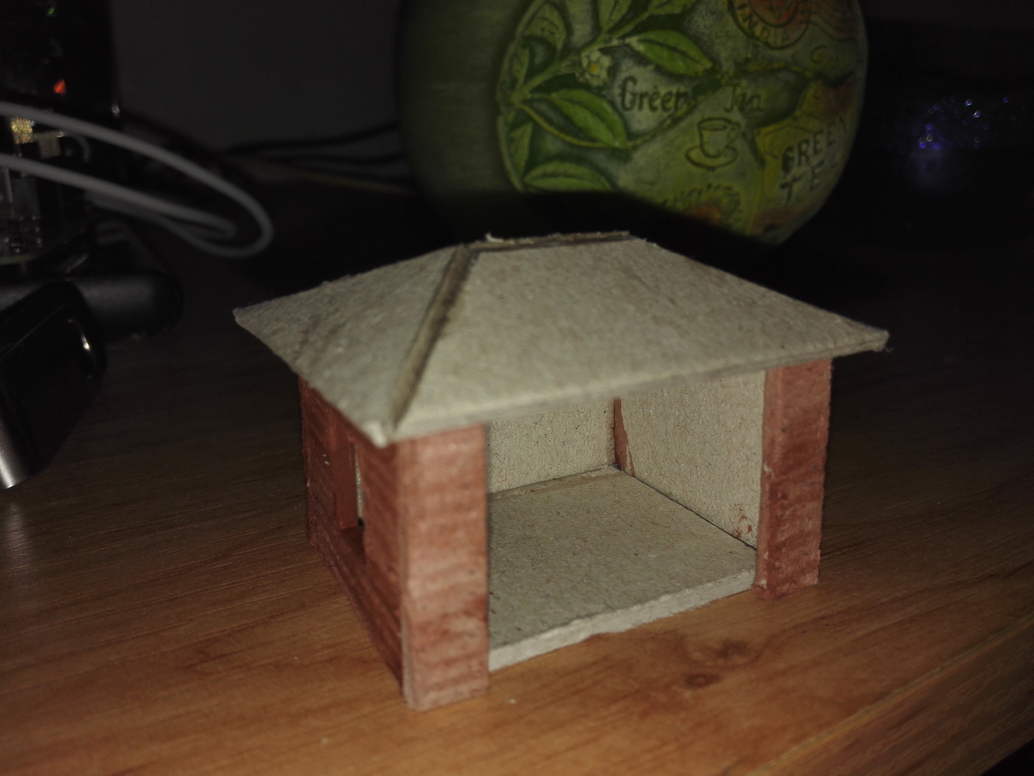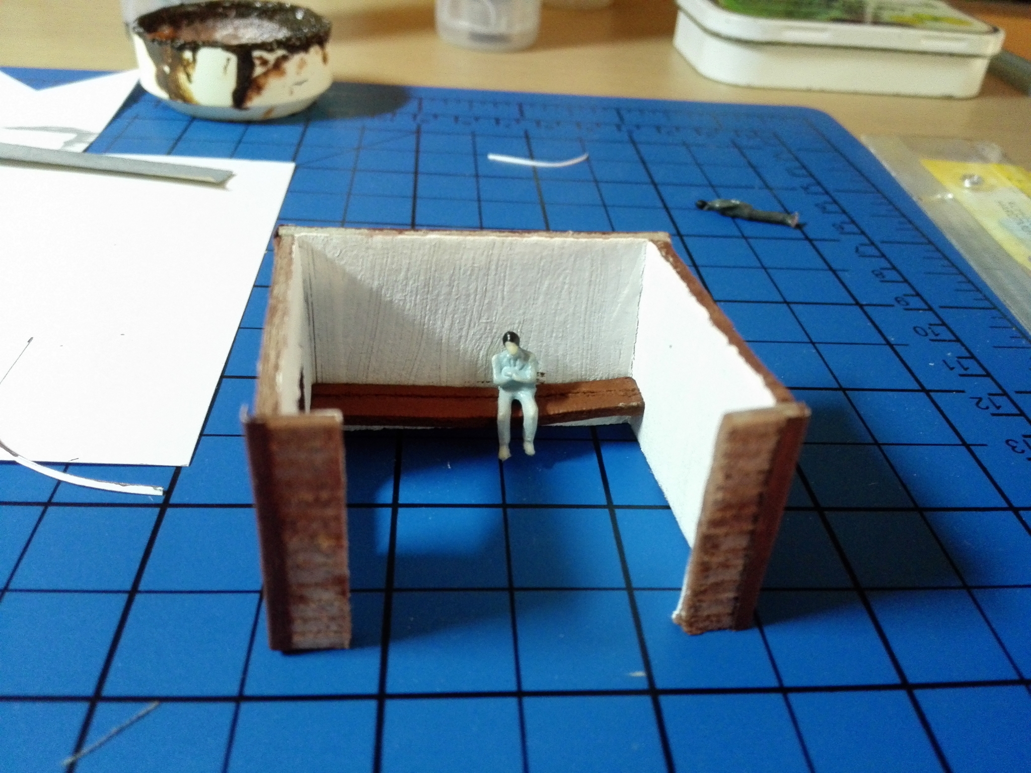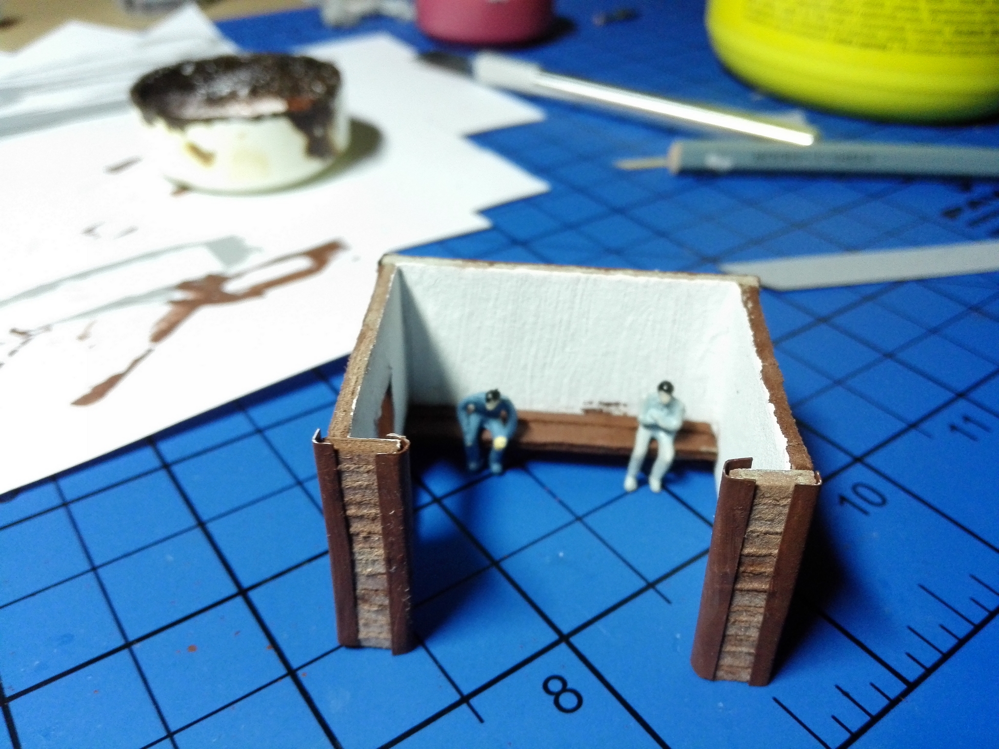 Na závěr slepíme střechu a zdi dohromady. Dále můžeme vybavit uvnitř lavičkou a nějakýma lidičkama.
