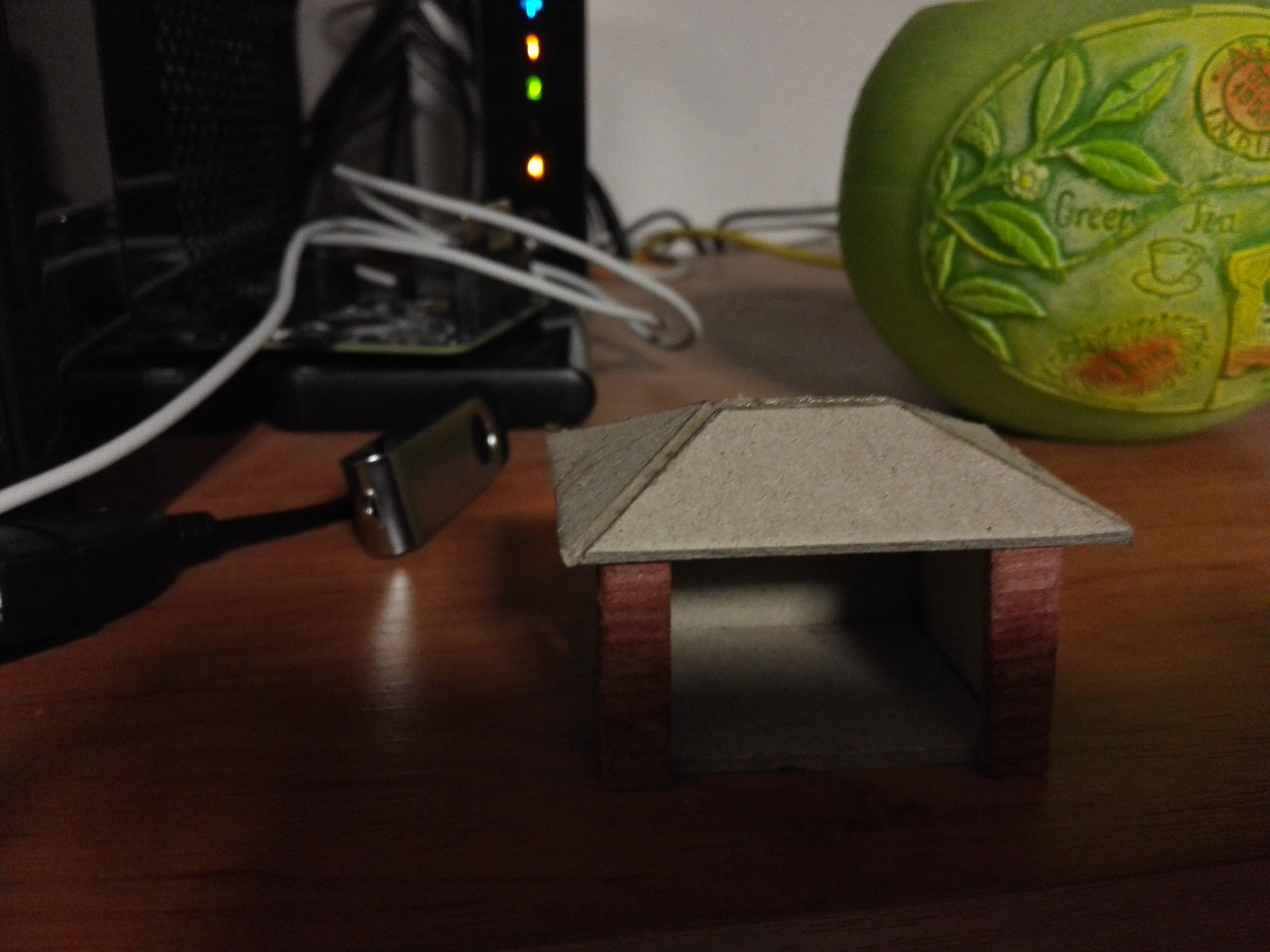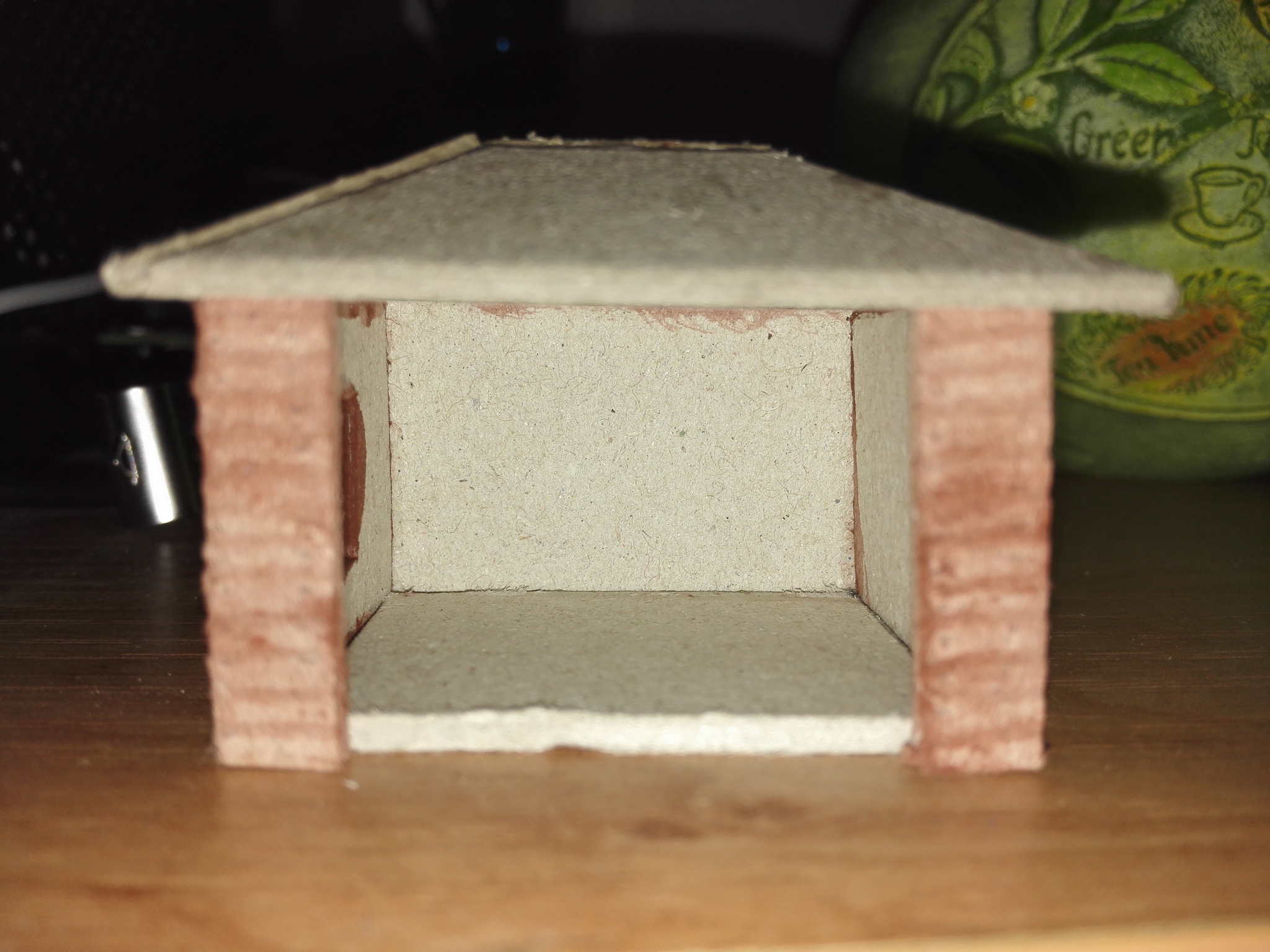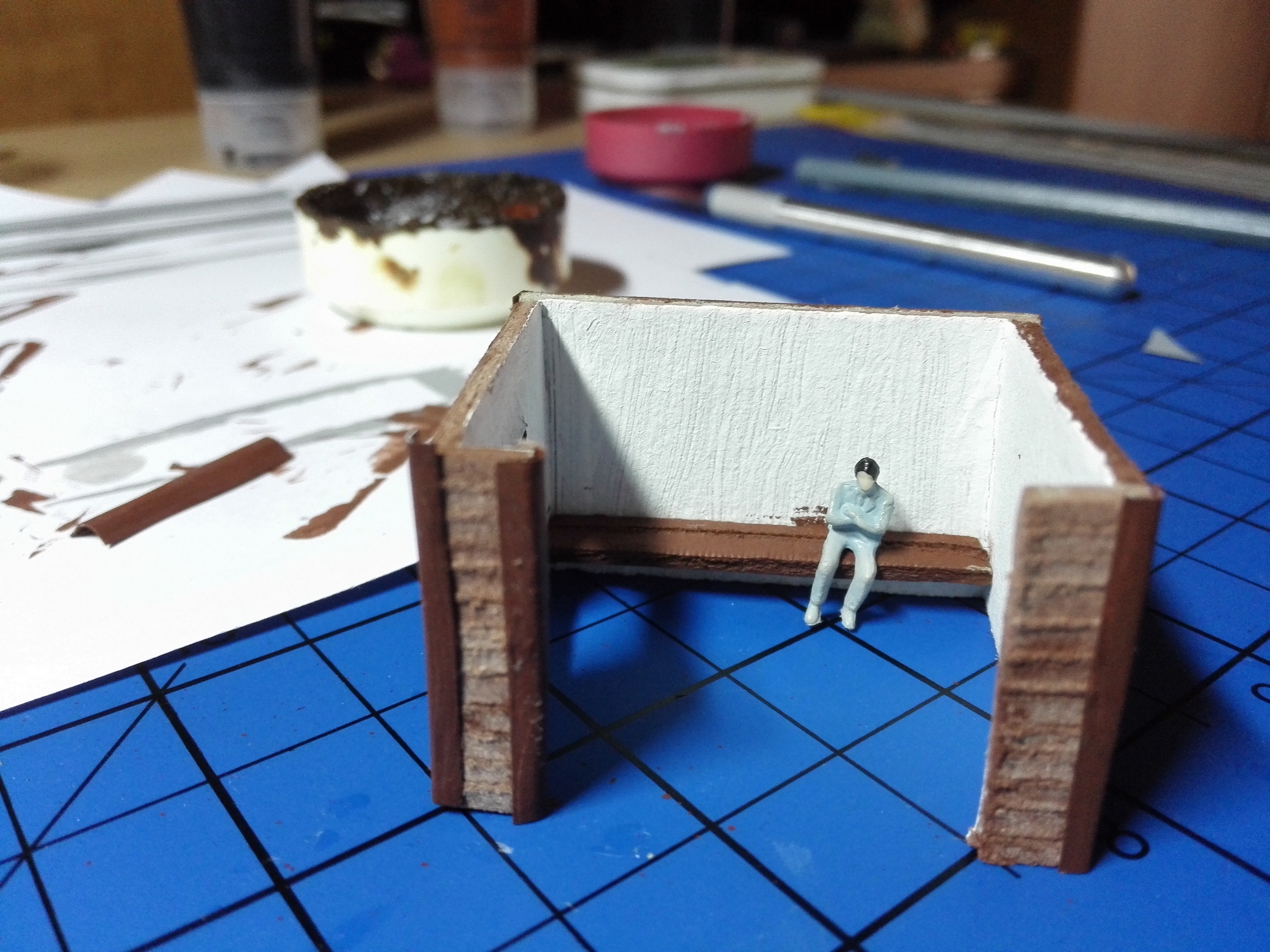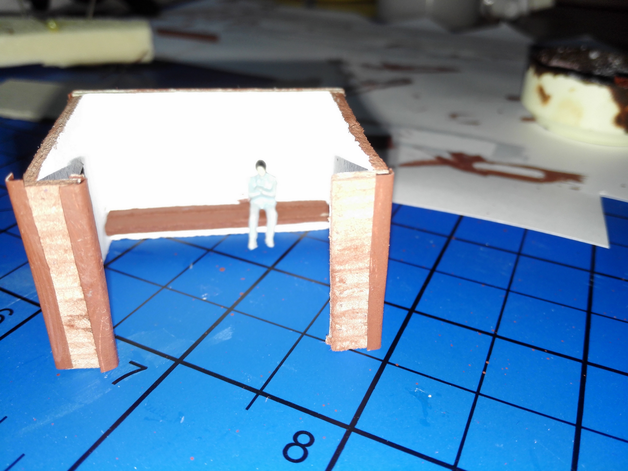 Na závěr slepíme střechu a zdi dohromady. Dále můžeme vybavit uvnitř lavičkou a nějakýma lidičkama.