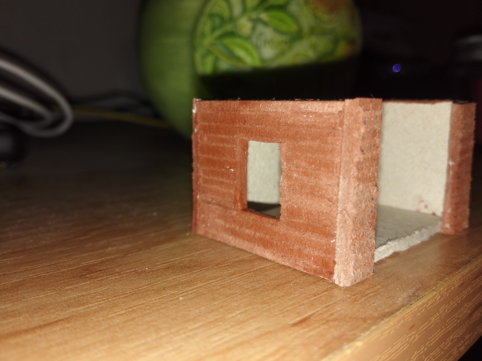 Po vyřezání všech dílů je na řadě struktura prken. Na díly stěn jsem z venku narýsoval čáry podélně s odstupem 2mm a každou čáru několikrát projel tupou tužkou, aby se vyryla do lepenky. Tím se začala tvořit struktura prken. Poté jsem ještě na jednu stranu vyřezal okno (je možné udělat i před strukturalizací stěn).