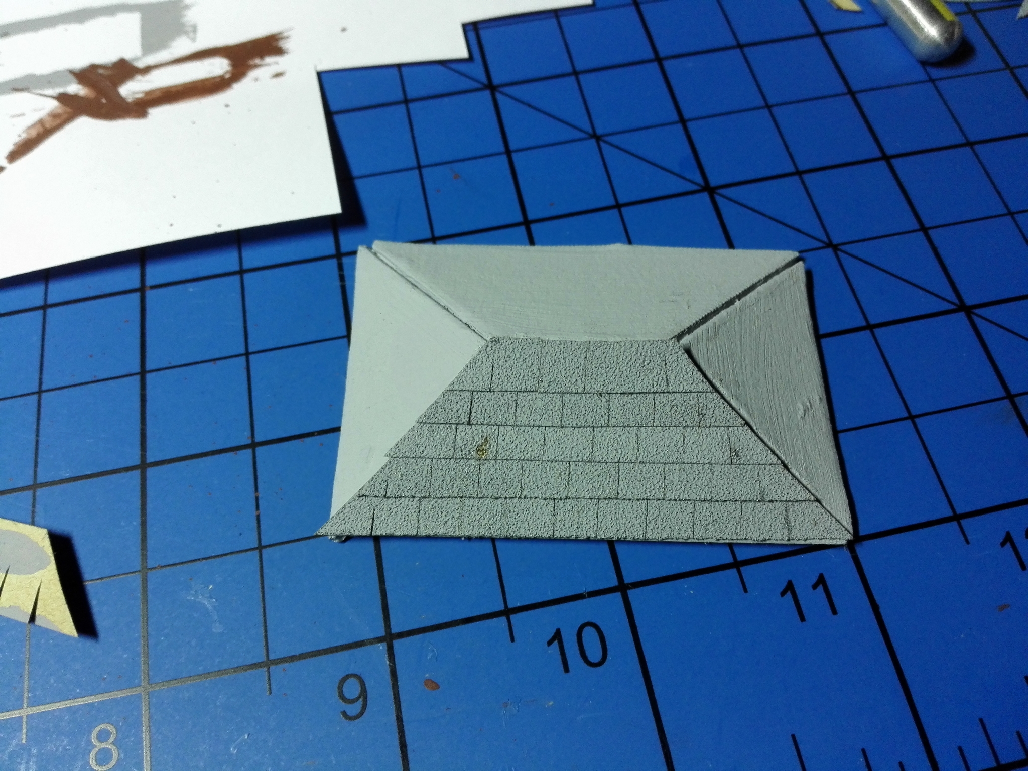 Poslední důležitou částí je vytvoření střešní krytiny. Na to jsem použil smirkový papír nabarvený na šedo. Ale ještě před barvením jsem si nastříhal pásky o tloušťce 5mm. Tyto pásky jsem pak ještě nastřihnul do půlky po 5mm. Pak jsem pásky pokládal přes sebe na střechu a každý druhý je o polovinu posunutý, aby se jednotlivé “tašky” překrývaly. Vše je vidět na obrázcích níže.