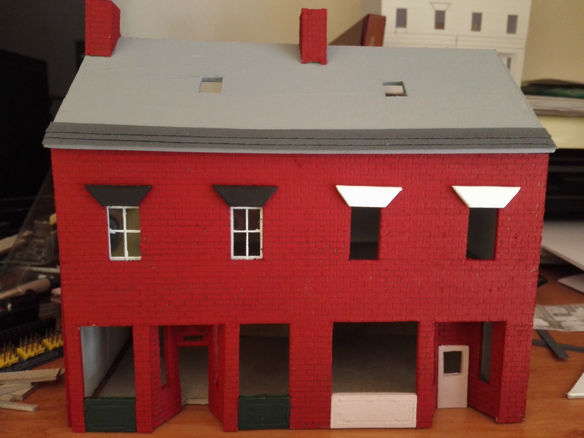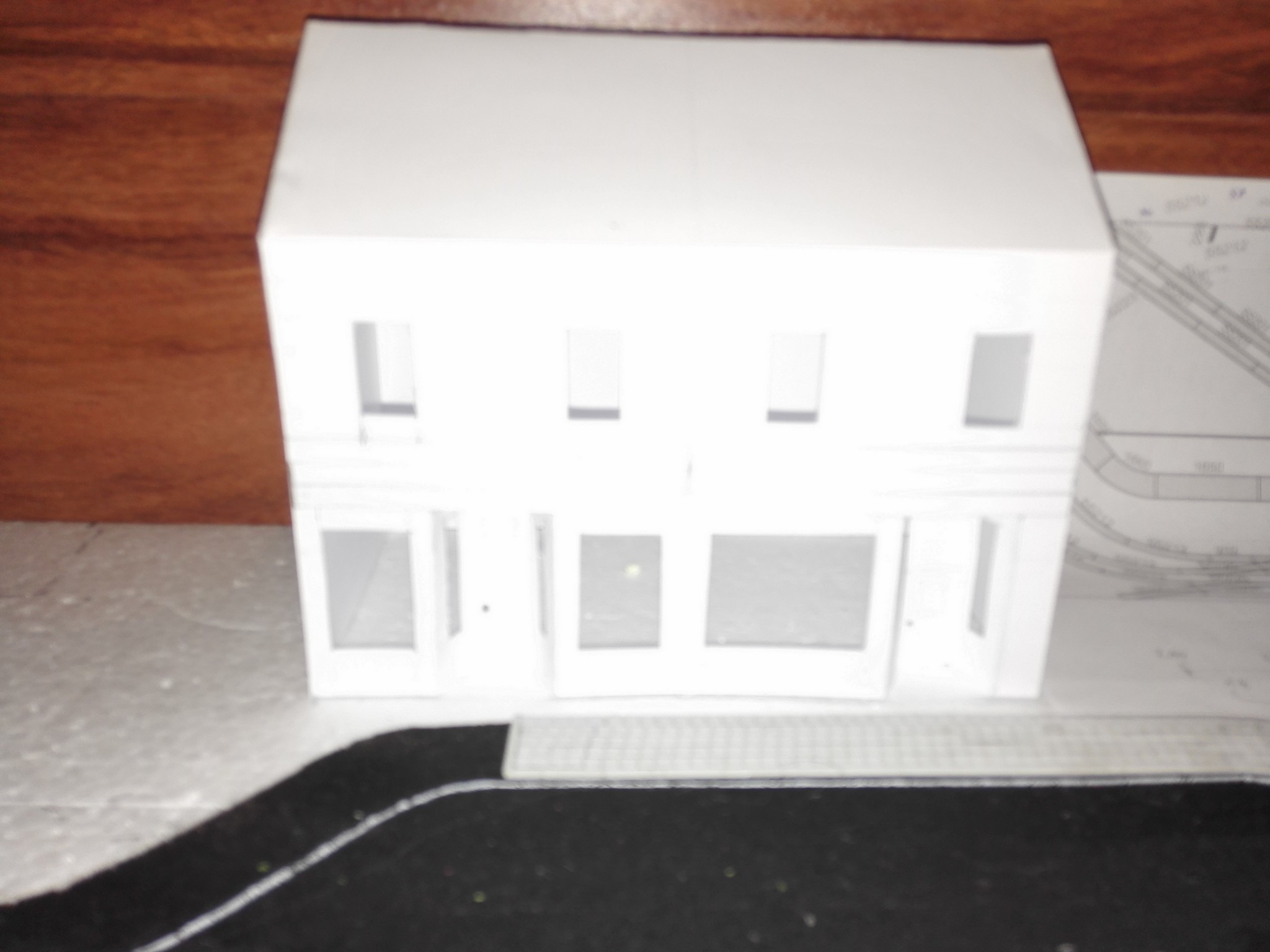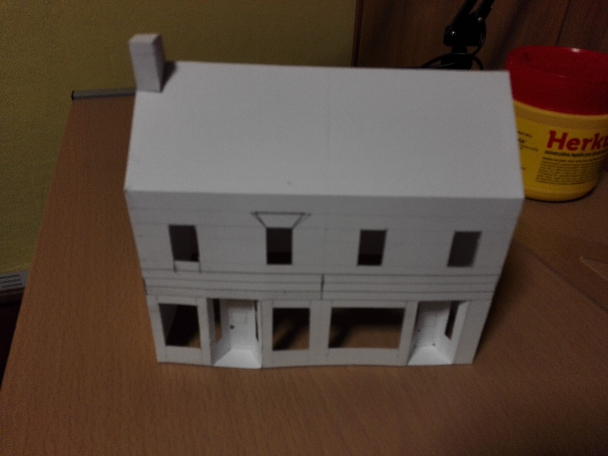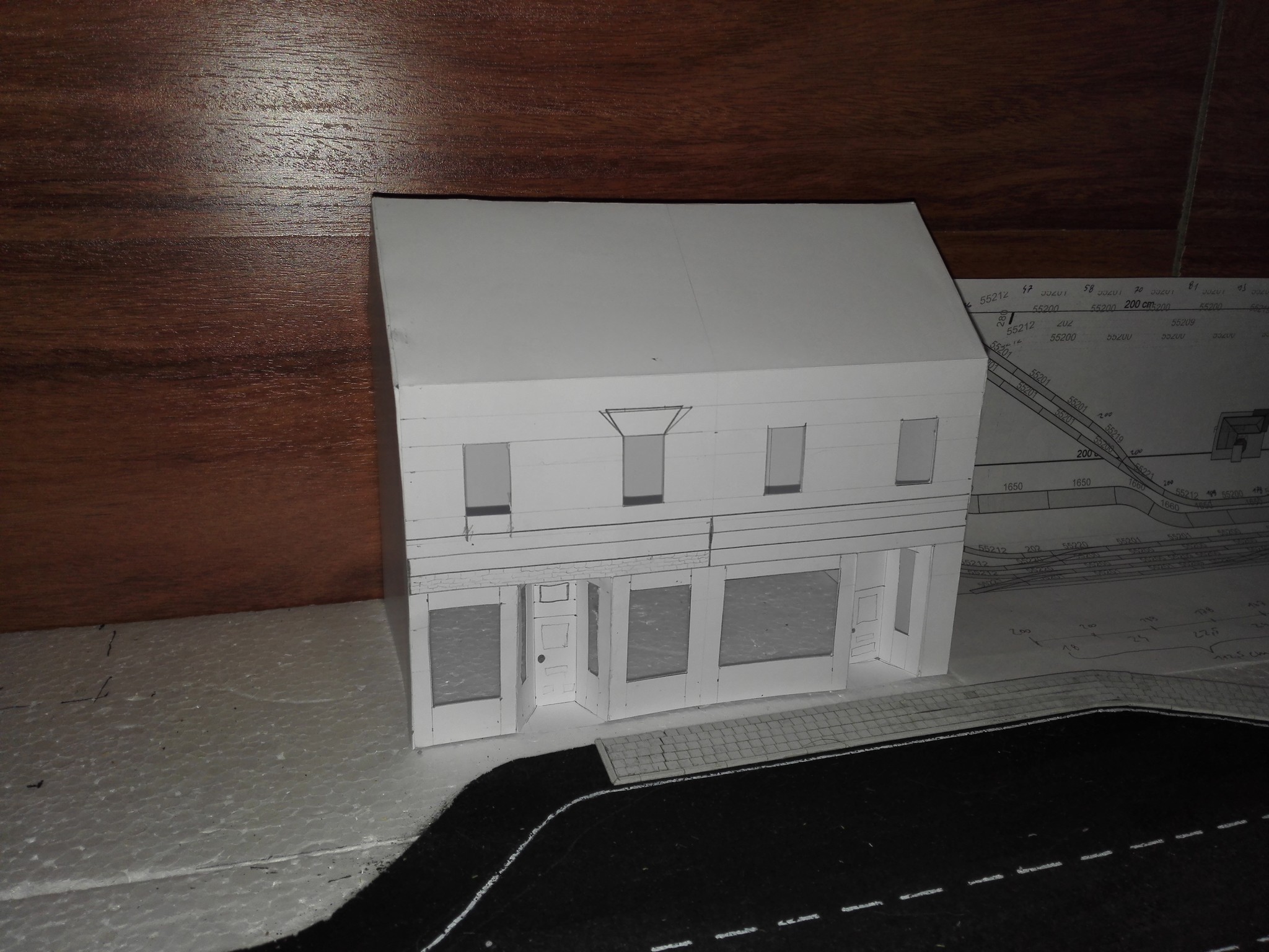 Vytvoření vchodu do obchodů bylo velkým oříškem. Je potřeba si všechno dobře naměřit a počítat vždy s tloušťkou lepenky. V tomto případě jsem dělal několik pokusů, než mi tam díl pasoval. Nakonec se však podařilo. Dveře jsem do vchodového dílu vyřezal zvlášť a také zvlášť natíral. Stejně tak díly pod okny v přízemí.