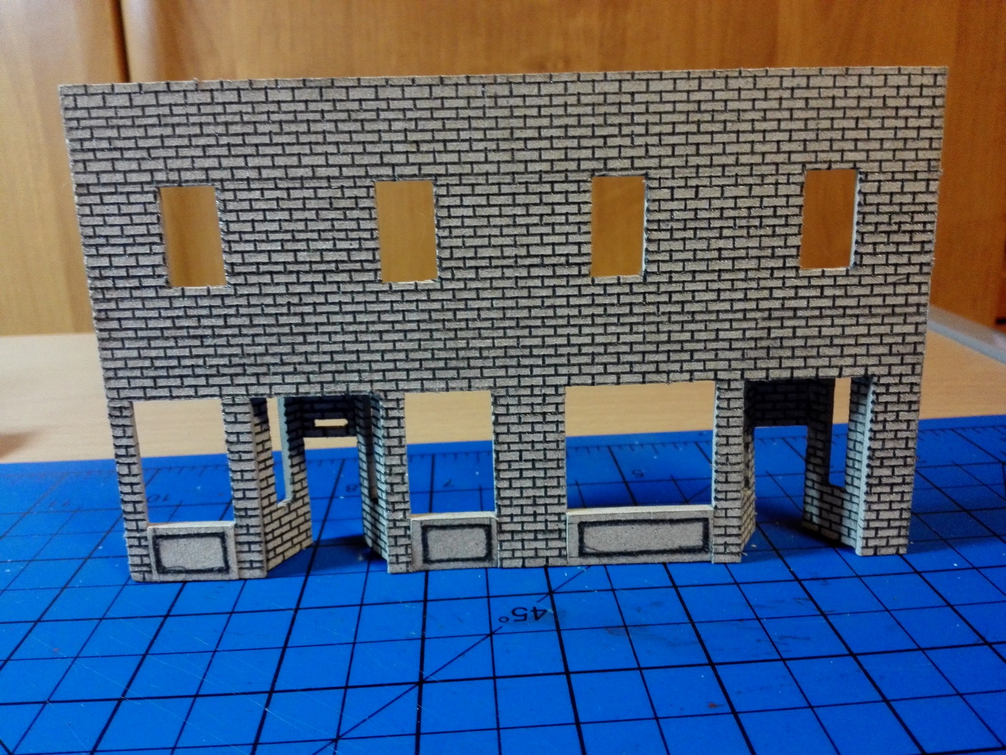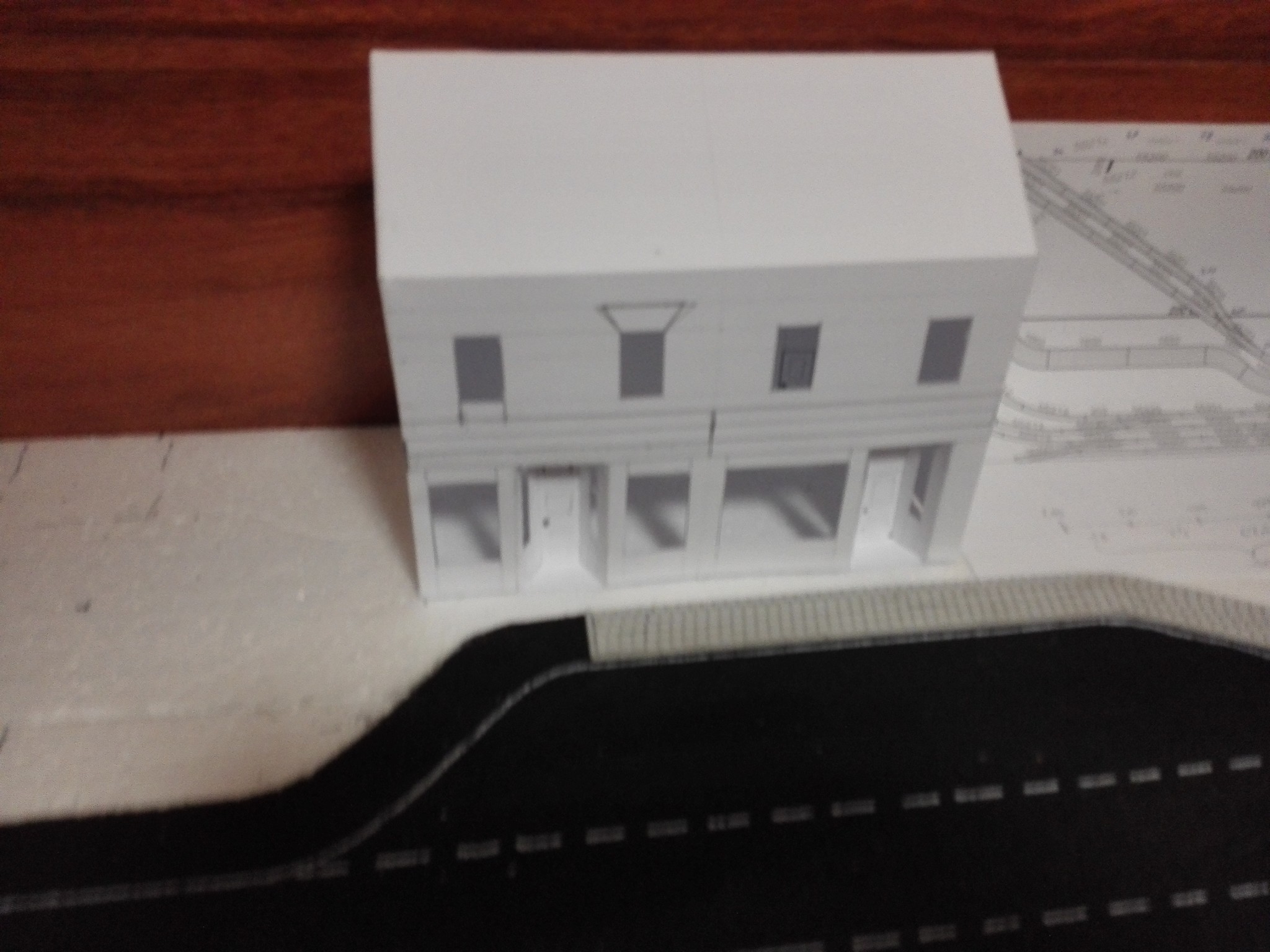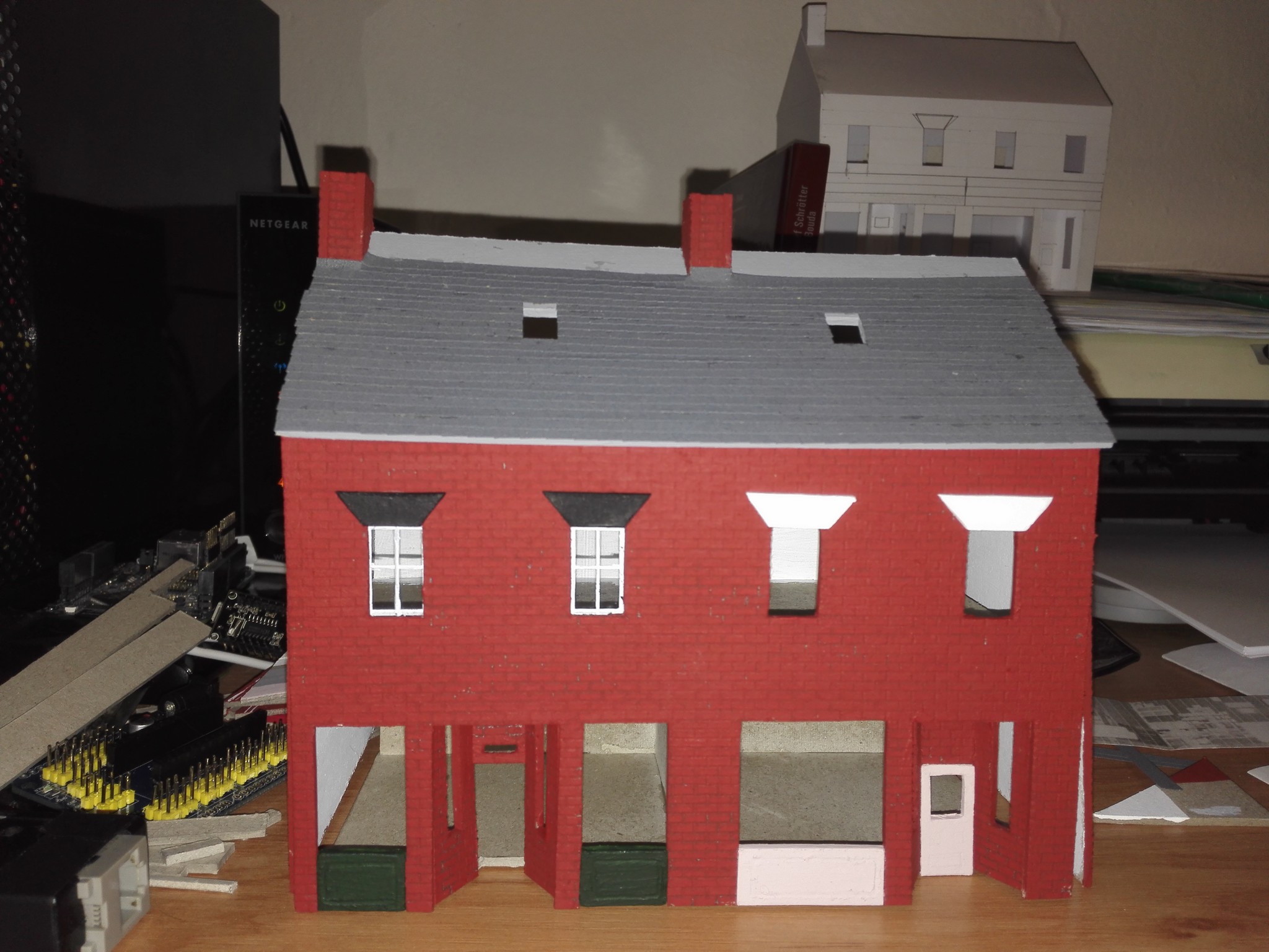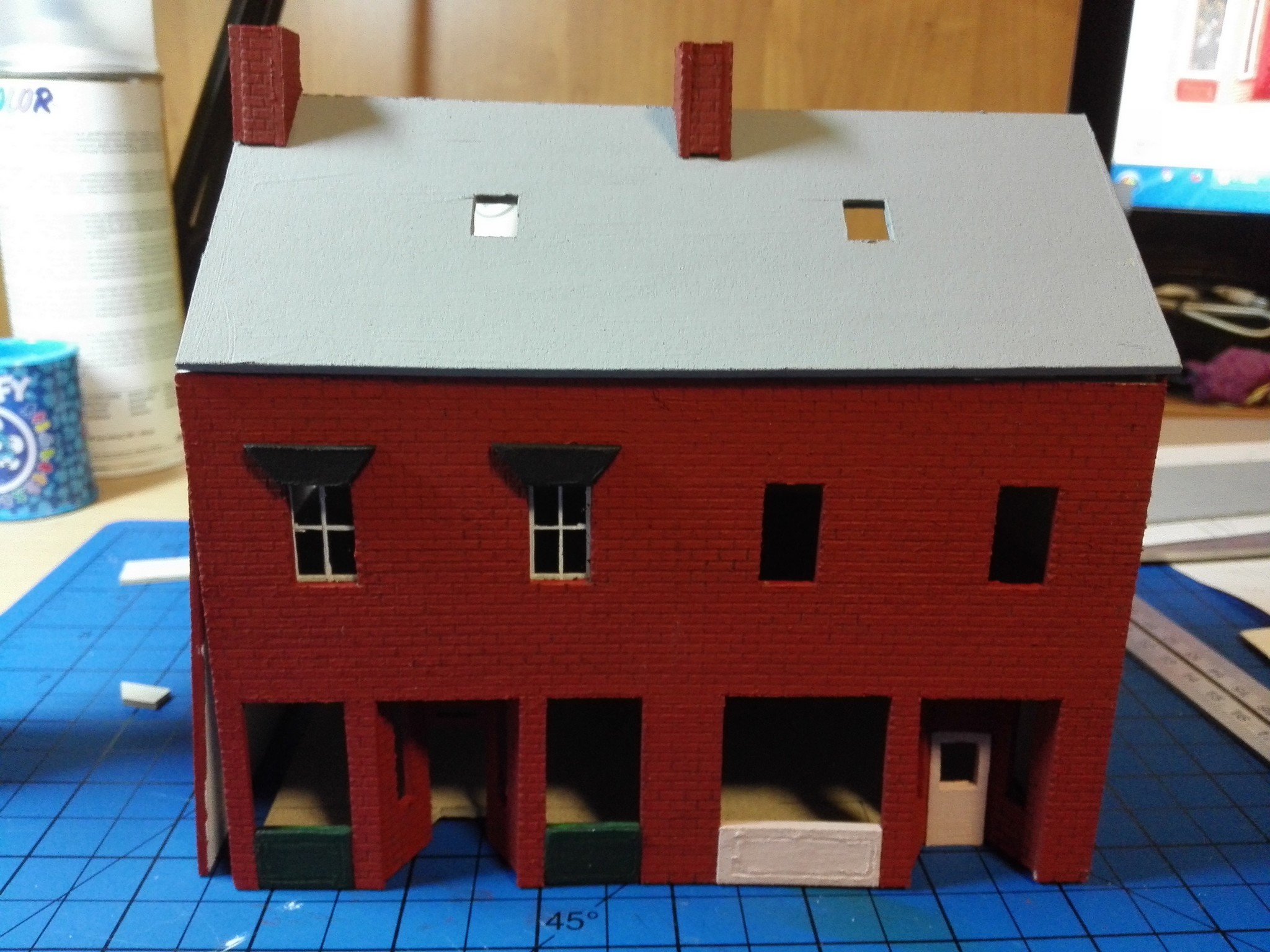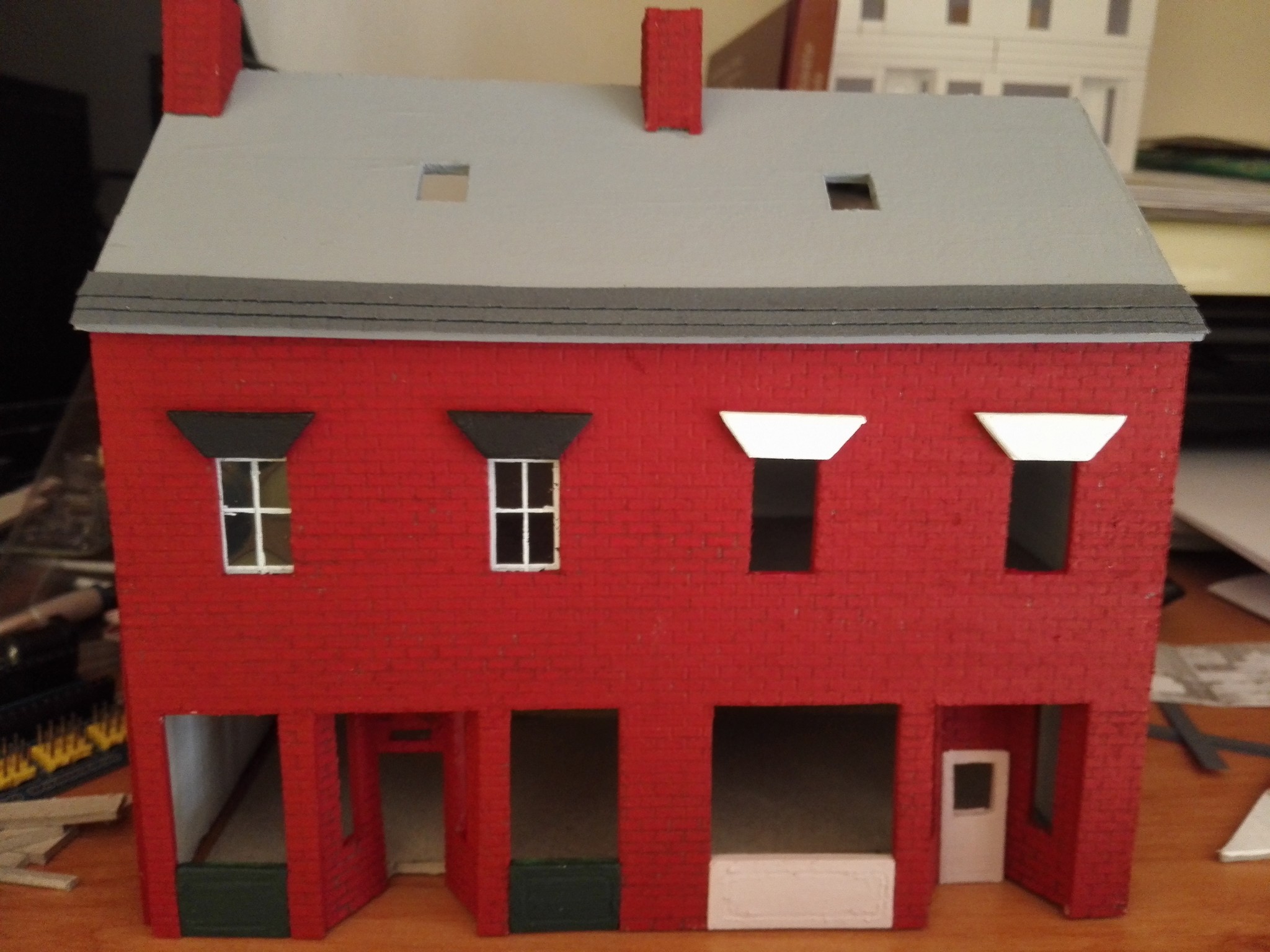 Vytvoření vchodu do obchodů bylo velkým oříškem. Je potřeba si všechno dobře naměřit a počítat vždy s tloušťkou lepenky. V tomto případě jsem dělal několik pokusů, než mi tam díl pasoval. Nakonec se však podařilo. Dveře jsem do vchodového dílu vyřezal zvlášť a také zvlášť natíral. Stejně tak díly pod okny v přízemí.
