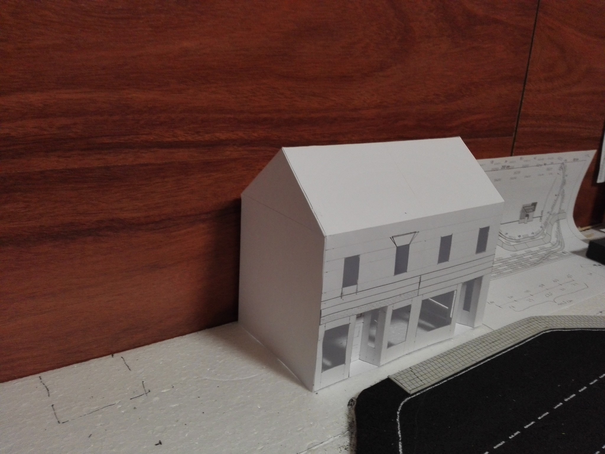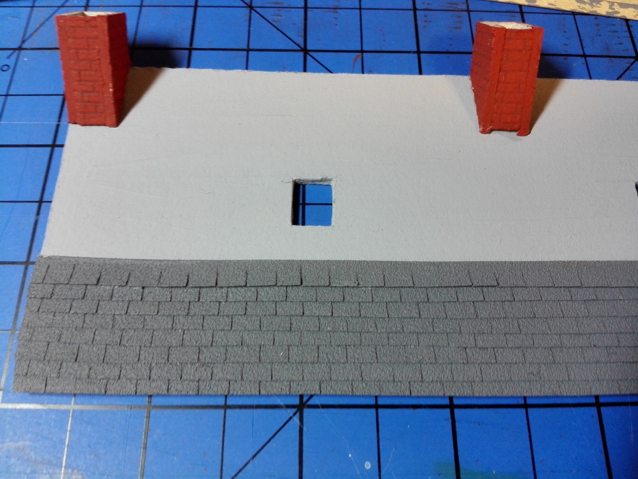Posledním stavebním činem byla střecha. Chtěl jsem, aby to nebyl jen tištěný vzor. Tak jsem se inspiroval již postavenou autobusovou zastávkou a použil zase smirkový papír natřený na šedou barvu. Smirkový papír je nastříhaný na pásky o tloušťce asi 2mm a po každých 5mm nastřižený. Tyto pásky se pak lepí přes sebe. Vše je vidět z fotografií níže.