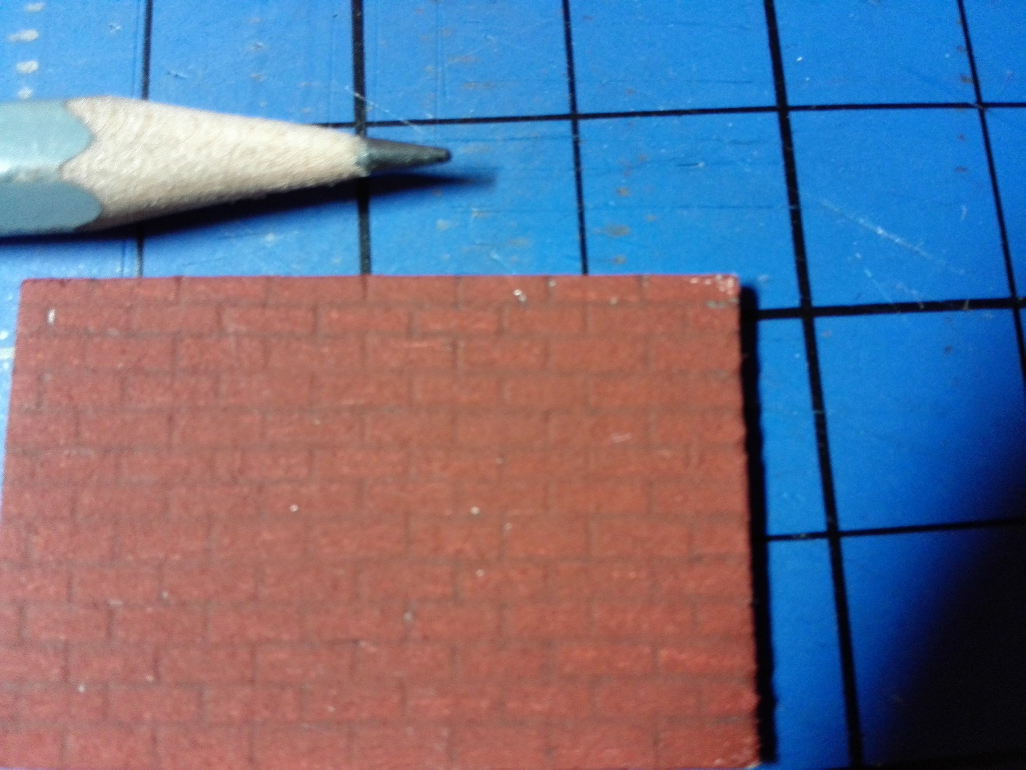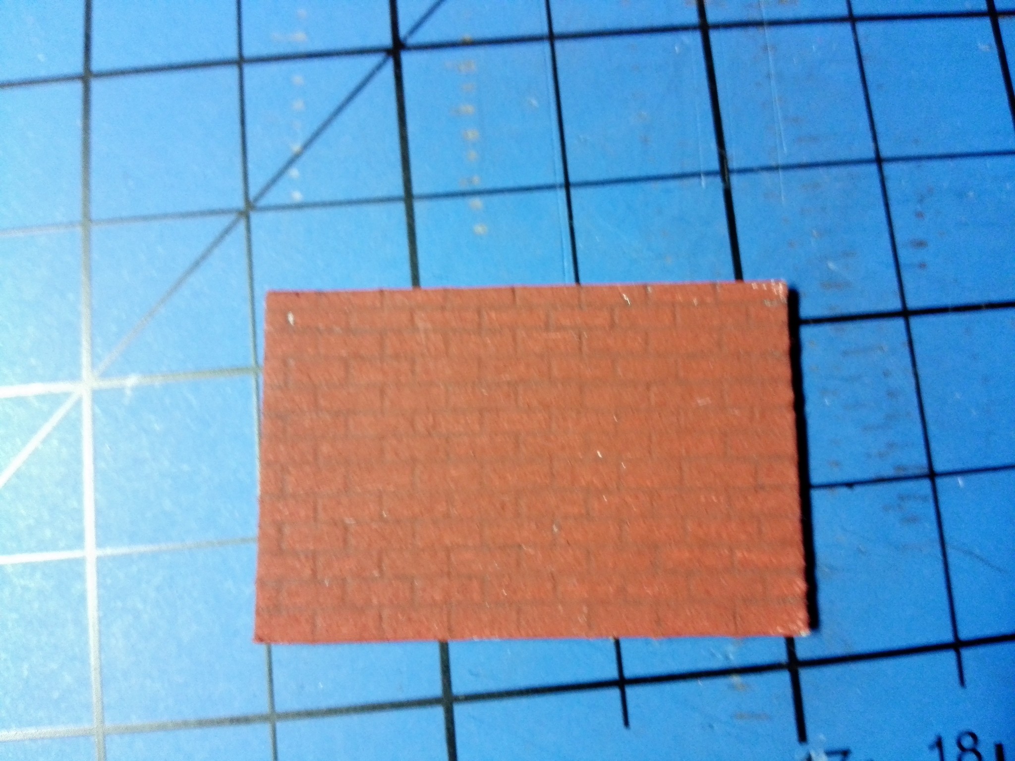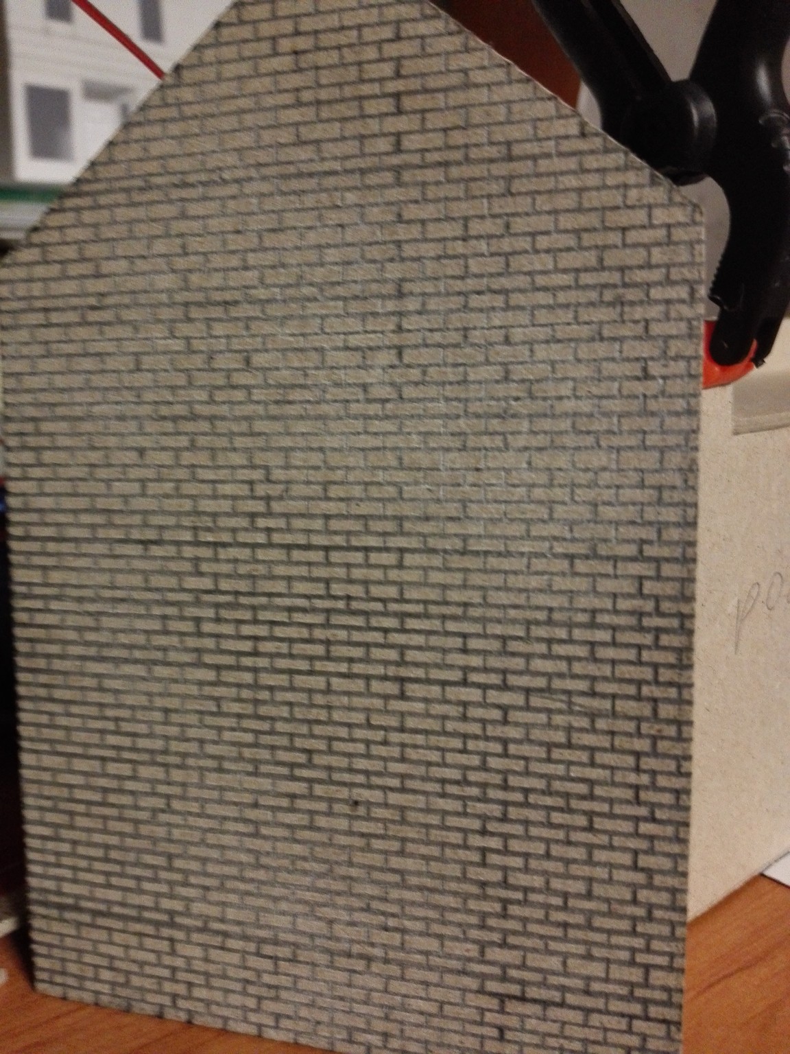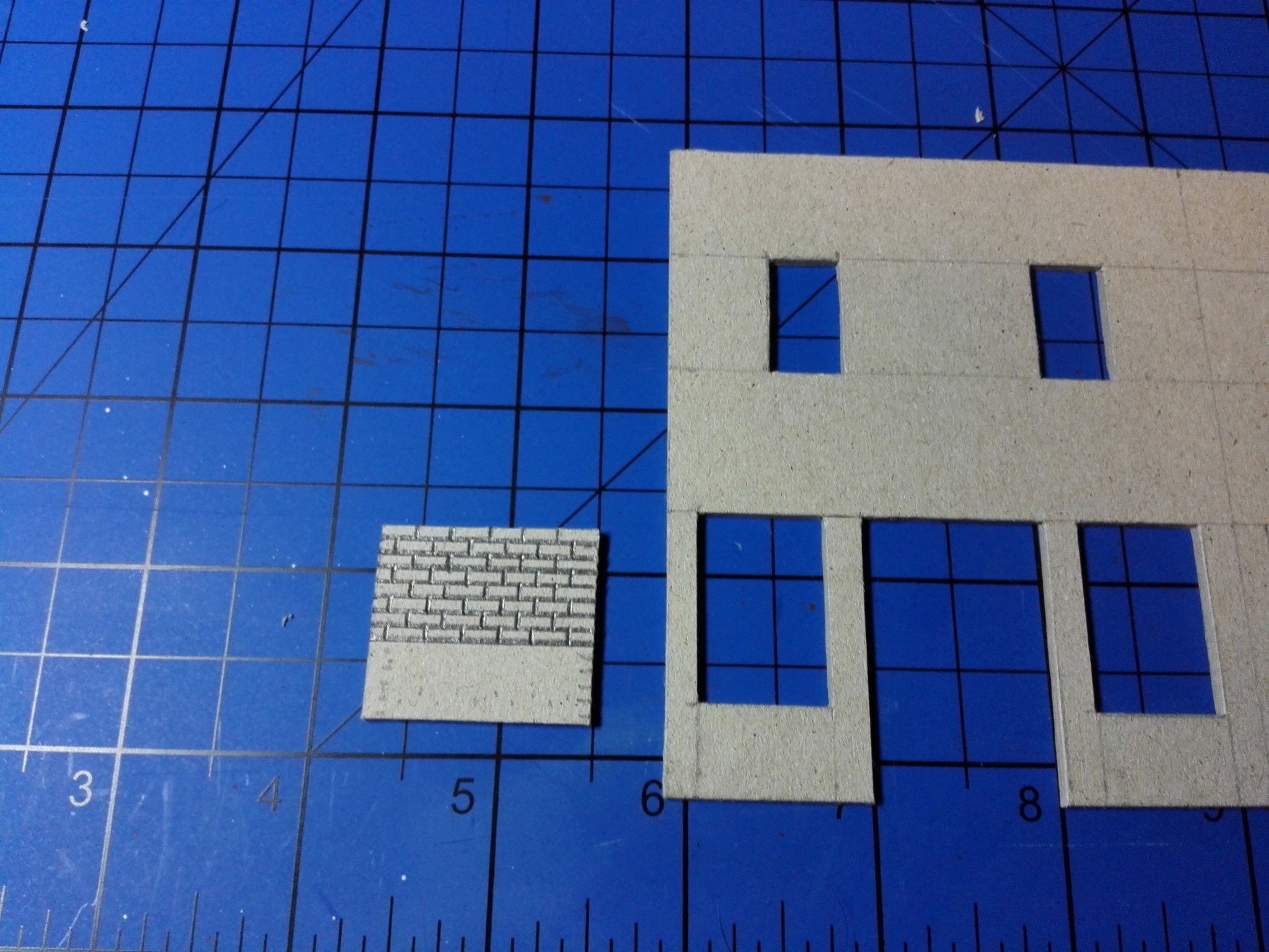 Mezitím, co usychaly vnitřní zdi, jsem se pomalu pustil do vlastního modelu zvenku. Nejnáročnější bylo udělat motiv cihel na celém domě. Zvolil jsem obyčejnou tužku a “zarýval” jsem do lepenky obdélníčky o velikosti 2×4 mm. Jak je vidět, tak jsem se snažil je dělat pravidelně podle pravítka. Vůbec nevadilo, že tužka je na lepence vidět, tvoří to velice zajímavý dojem. Motiv cihel jsem si nejprve ale vyzkoušel na kousku lepenky mimo dům, abych něco nepokazil. Jak pokusy cihel, tak i vlastní namalované cihly jsou na obrázcích níže. Některé díly na fotografiích jsou už i natřené. Zase byly použity akrylové barvy. Míchal jsem červenou s trochou černé, aby byla tmavší. Pro motiv různých odstínů jsem si pohrával s více a méně ředěnou barvou vodou. Není to sice tolik patrné, ale místy je to vidět.