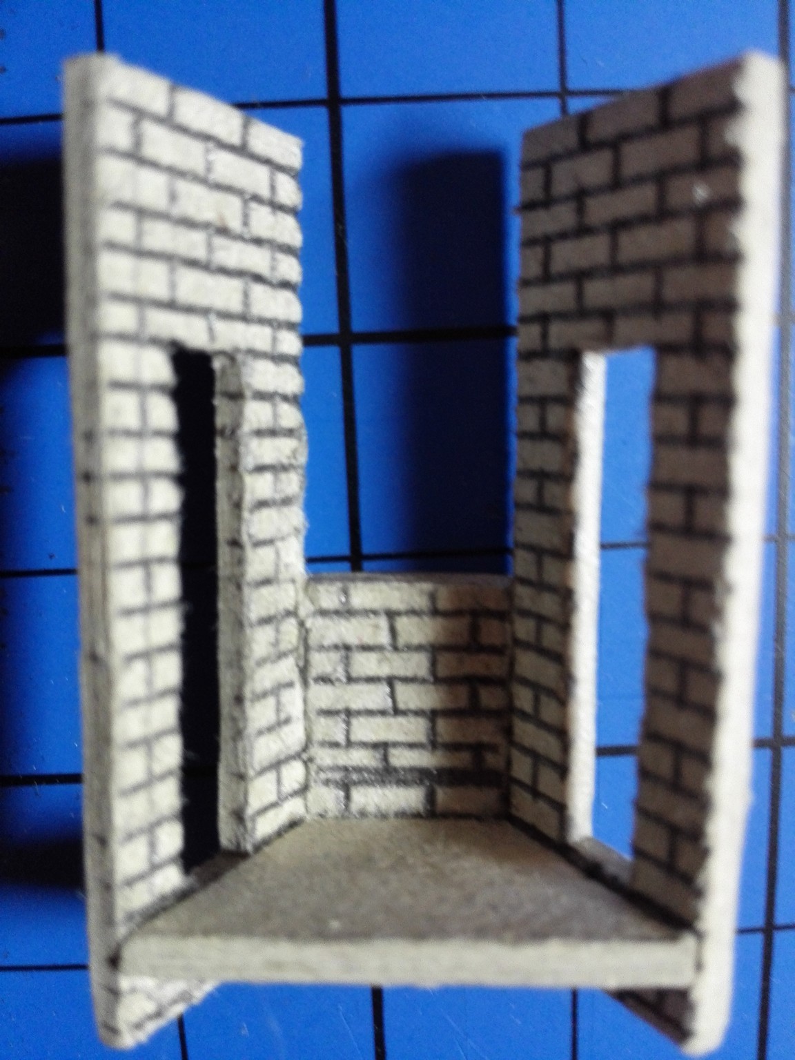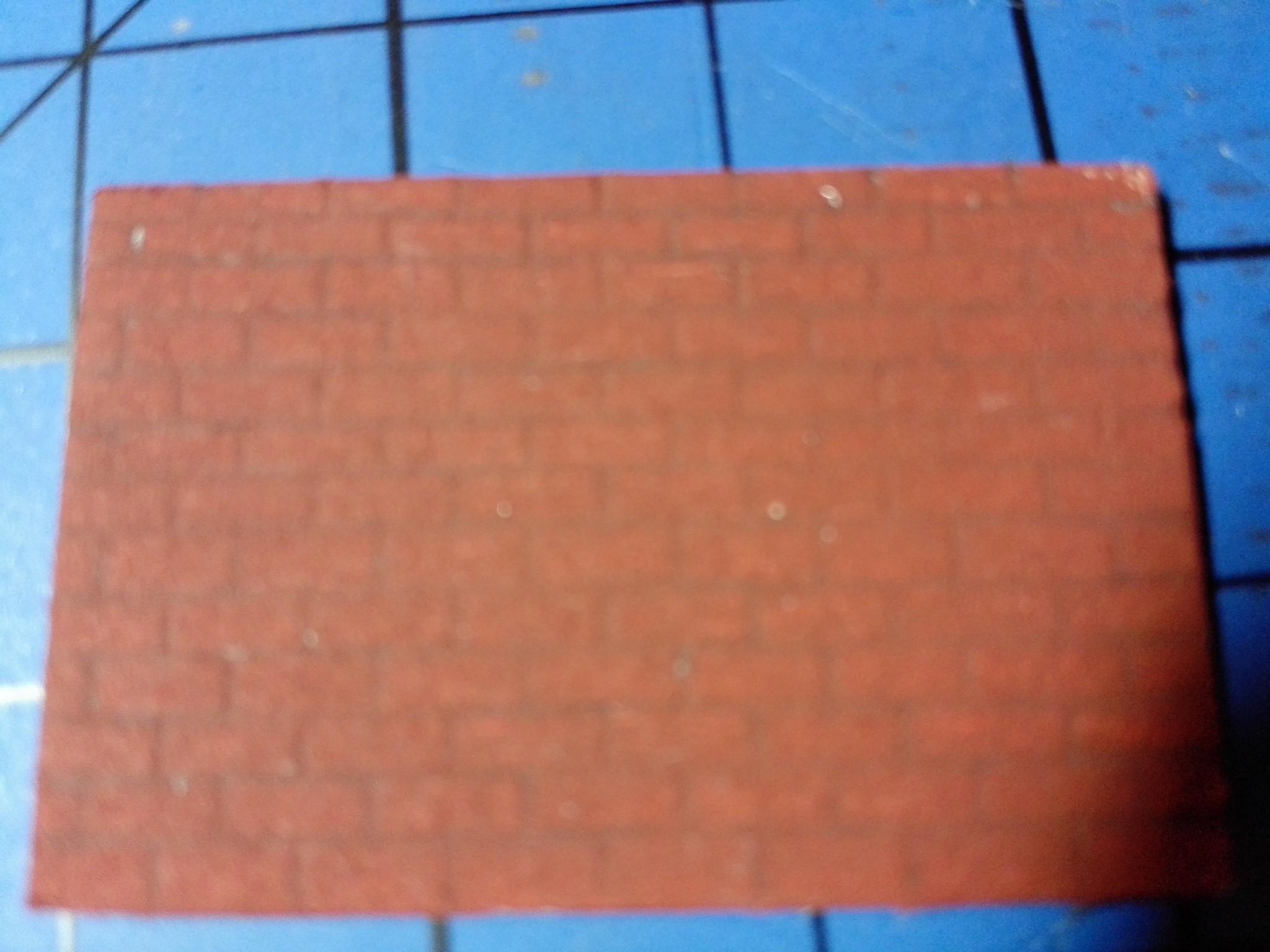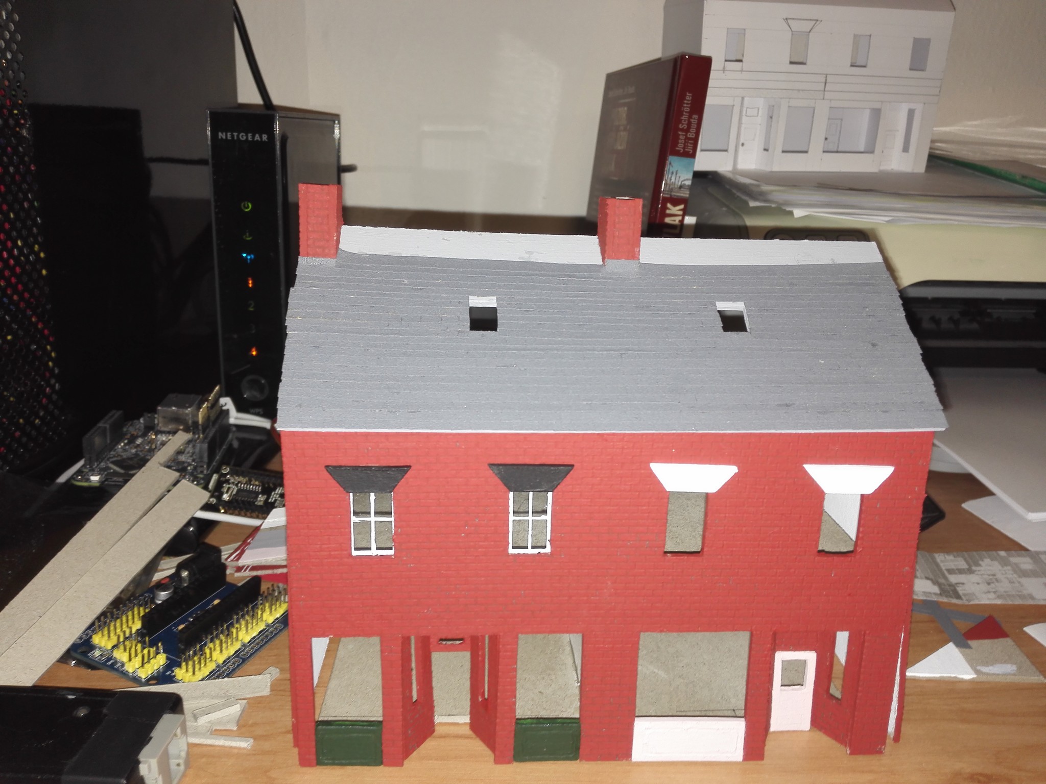 Mezitím, co usychaly vnitřní zdi, jsem se pomalu pustil do vlastního modelu zvenku. Nejnáročnější bylo udělat motiv cihel na celém domě. Zvolil jsem obyčejnou tužku a “zarýval” jsem do lepenky obdélníčky o velikosti 2×4 mm. Jak je vidět, tak jsem se snažil je dělat pravidelně podle pravítka. Vůbec nevadilo, že tužka je na lepence vidět, tvoří to velice zajímavý dojem. Motiv cihel jsem si nejprve ale vyzkoušel na kousku lepenky mimo dům, abych něco nepokazil. Jak pokusy cihel, tak i vlastní namalované cihly jsou na obrázcích níže. Některé díly na fotografiích jsou už i natřené. Zase byly použity akrylové barvy. Míchal jsem červenou s trochou černé, aby byla tmavší. Pro motiv různých odstínů jsem si pohrával s více a méně ředěnou barvou vodou. Není to sice tolik patrné, ale místy je to vidět.