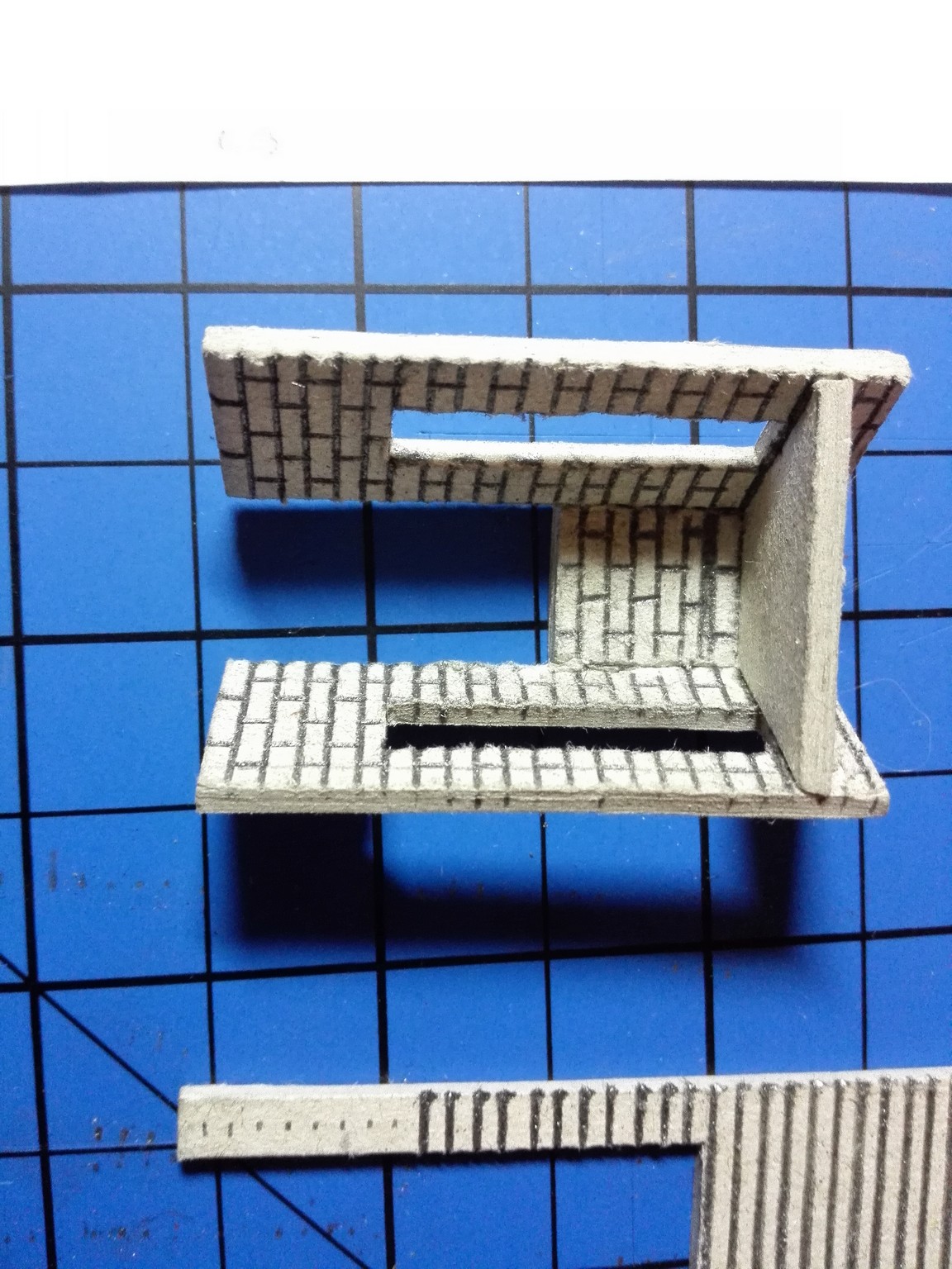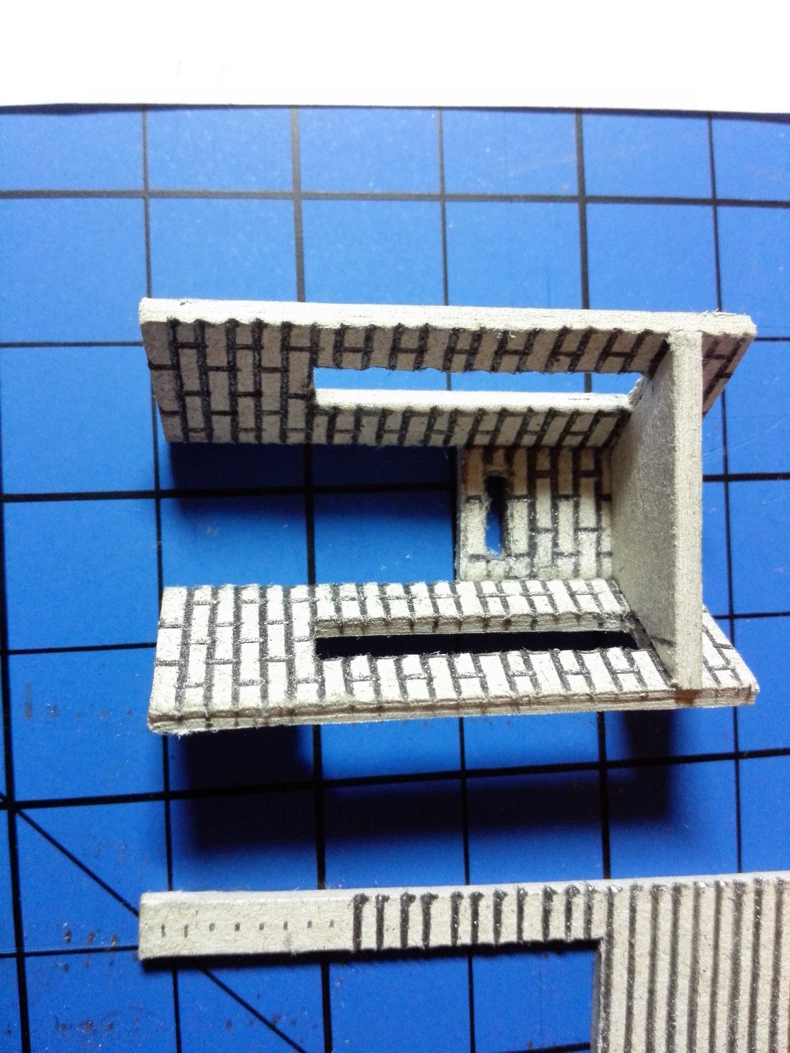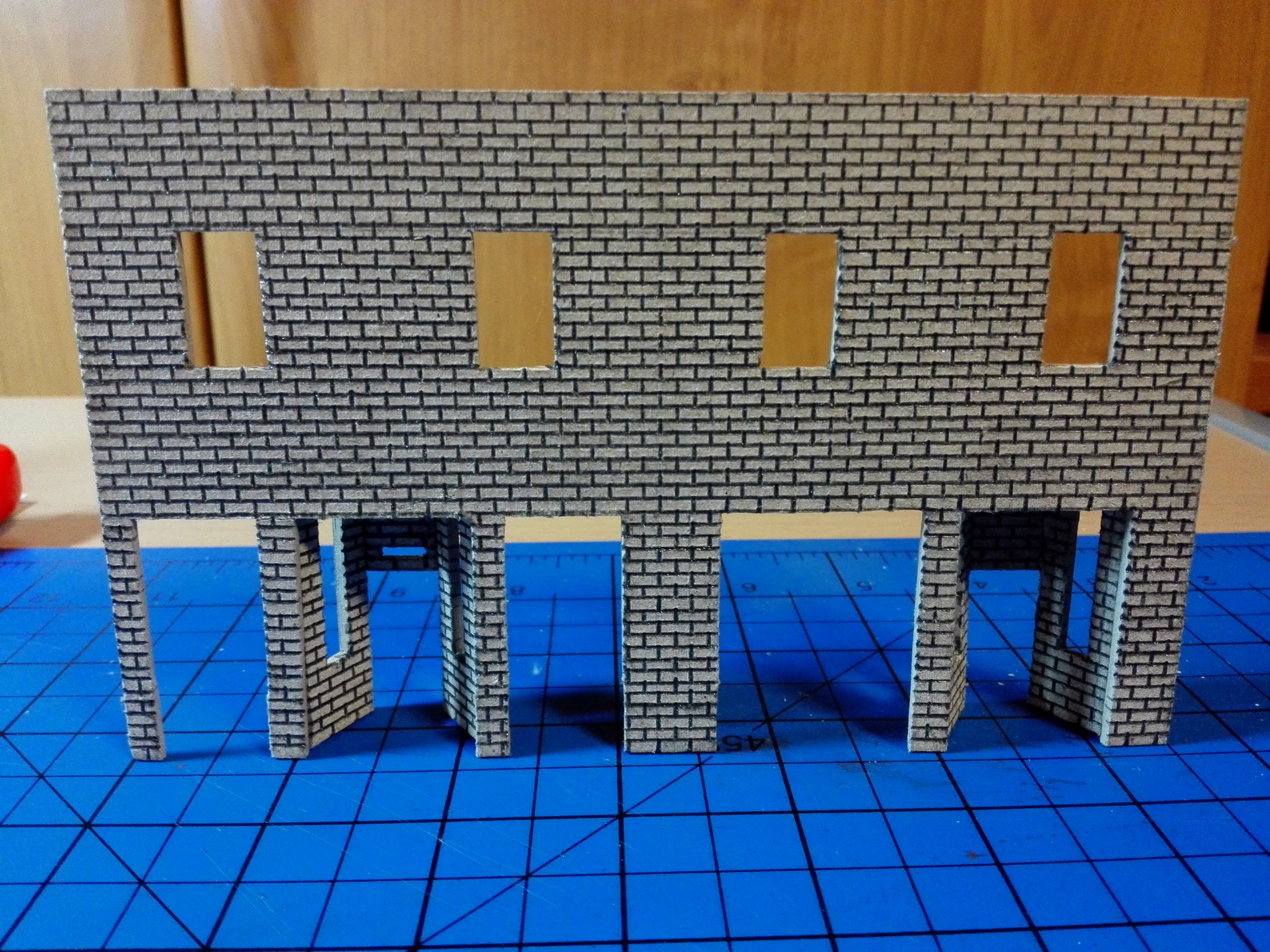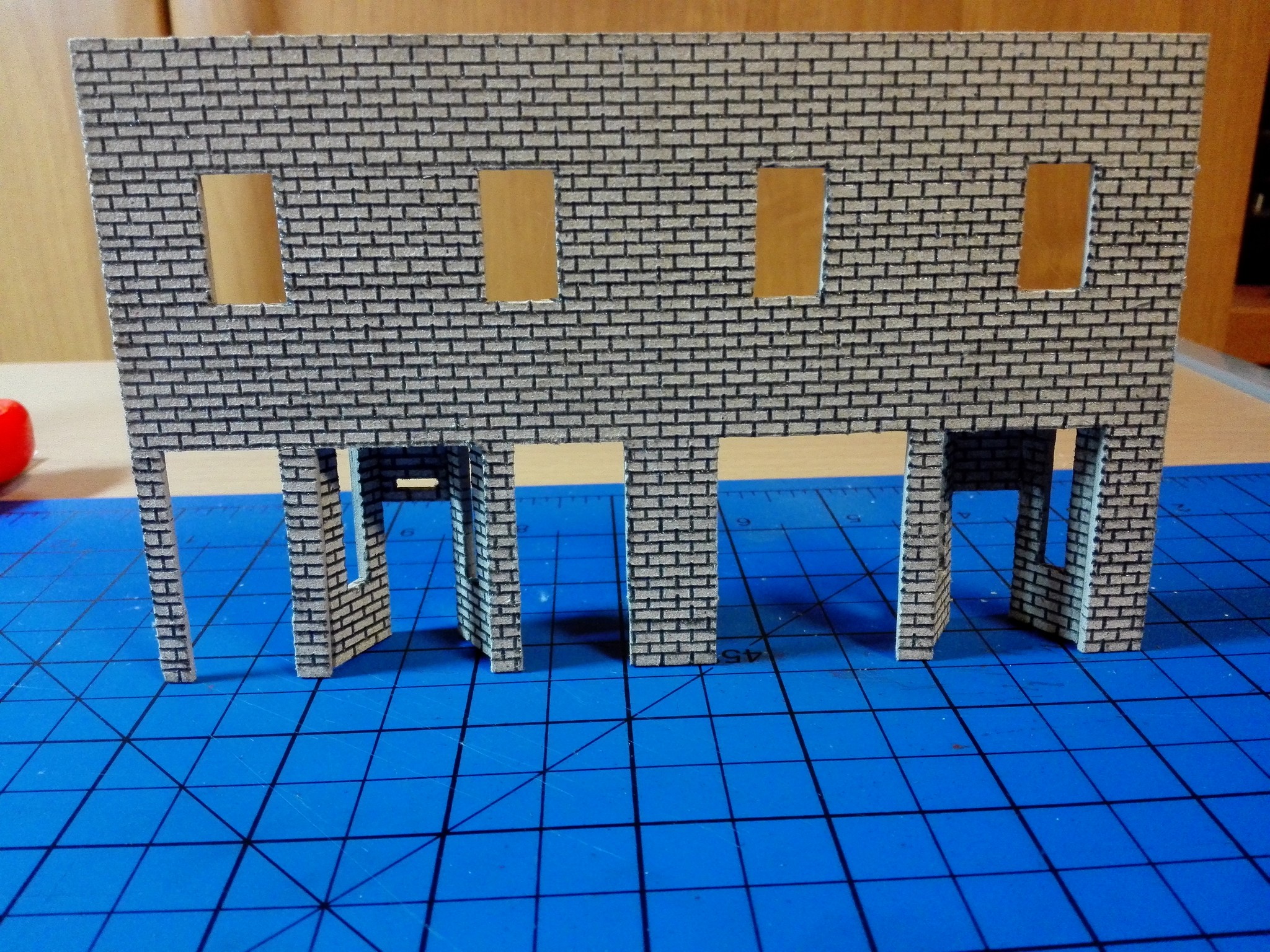 Mezitím, co usychaly vnitřní zdi, jsem se pomalu pustil do vlastního modelu zvenku. Nejnáročnější bylo udělat motiv cihel na celém domě. Zvolil jsem obyčejnou tužku a “zarýval” jsem do lepenky obdélníčky o velikosti 2×4 mm. Jak je vidět, tak jsem se snažil je dělat pravidelně podle pravítka. Vůbec nevadilo, že tužka je na lepence vidět, tvoří to velice zajímavý dojem. Motiv cihel jsem si nejprve ale vyzkoušel na kousku lepenky mimo dům, abych něco nepokazil. Jak pokusy cihel, tak i vlastní namalované cihly jsou na obrázcích níže. Některé díly na fotografiích jsou už i natřené. Zase byly použity akrylové barvy. Míchal jsem červenou s trochou černé, aby byla tmavší. Pro motiv různých odstínů jsem si pohrával s více a méně ředěnou barvou vodou. Není to sice tolik patrné, ale místy je to vidět.