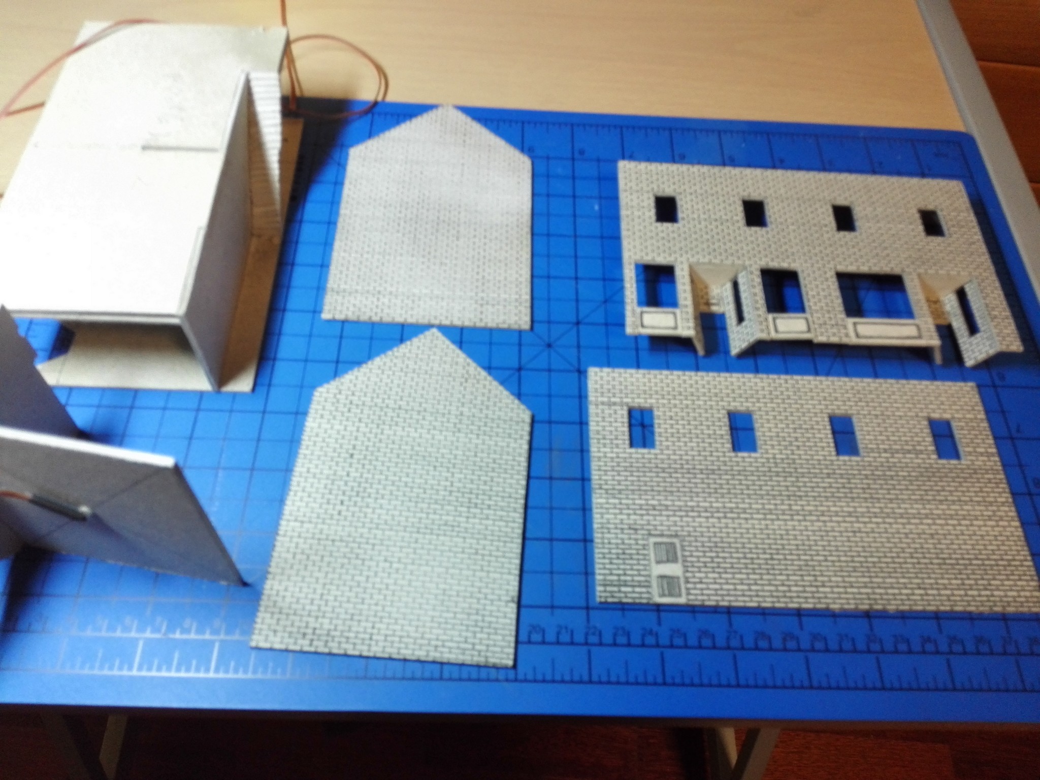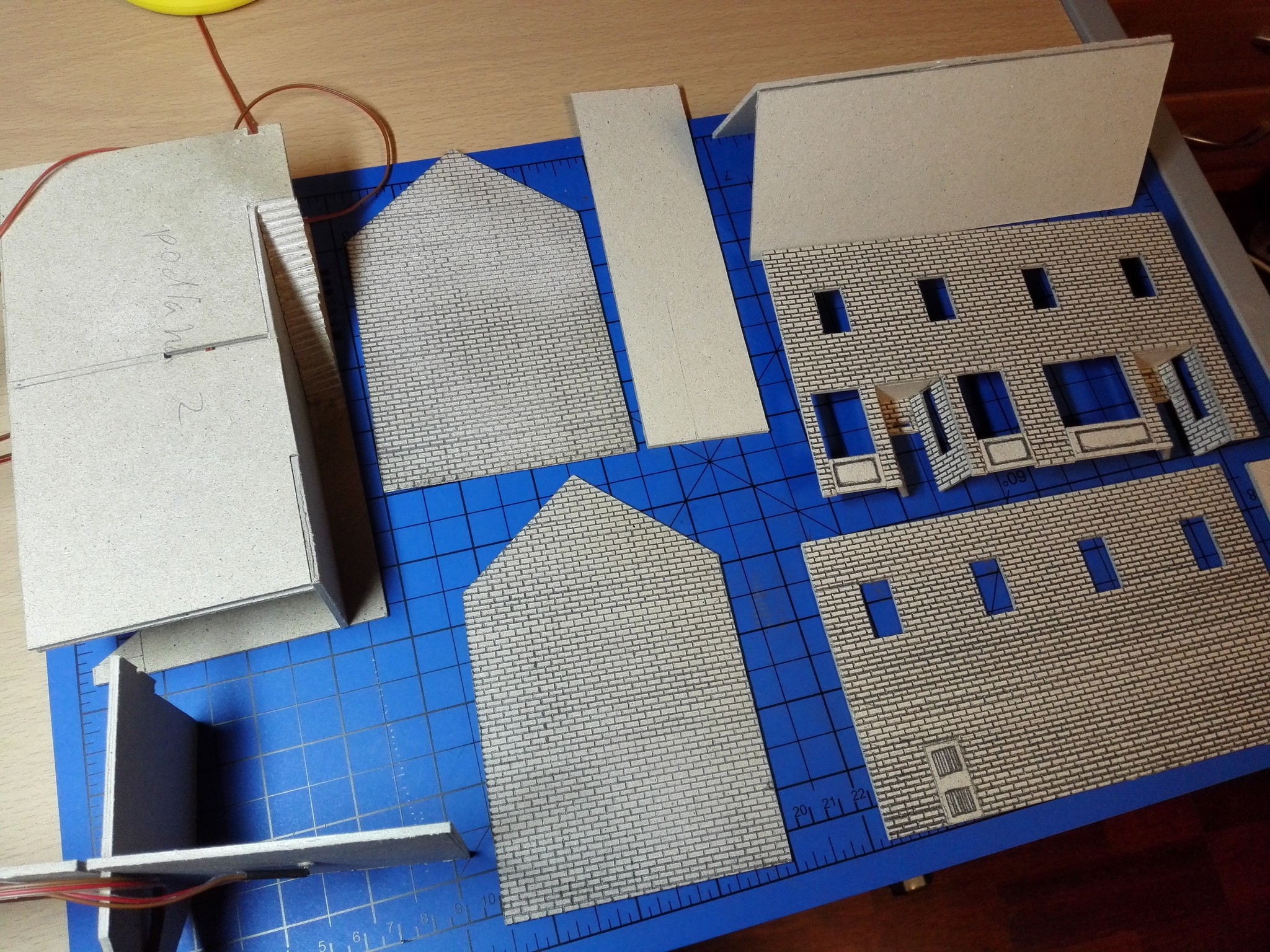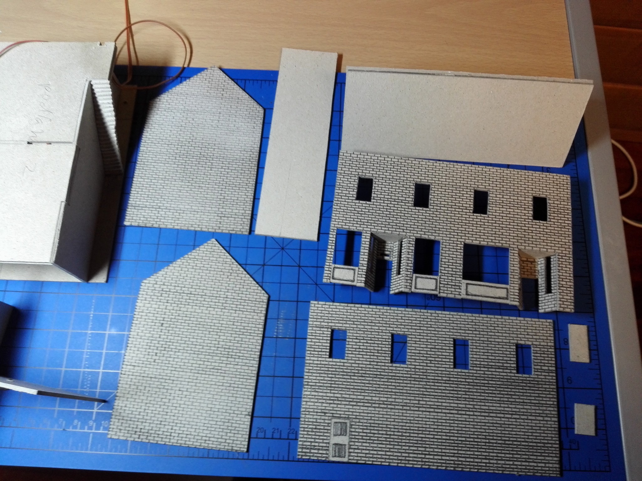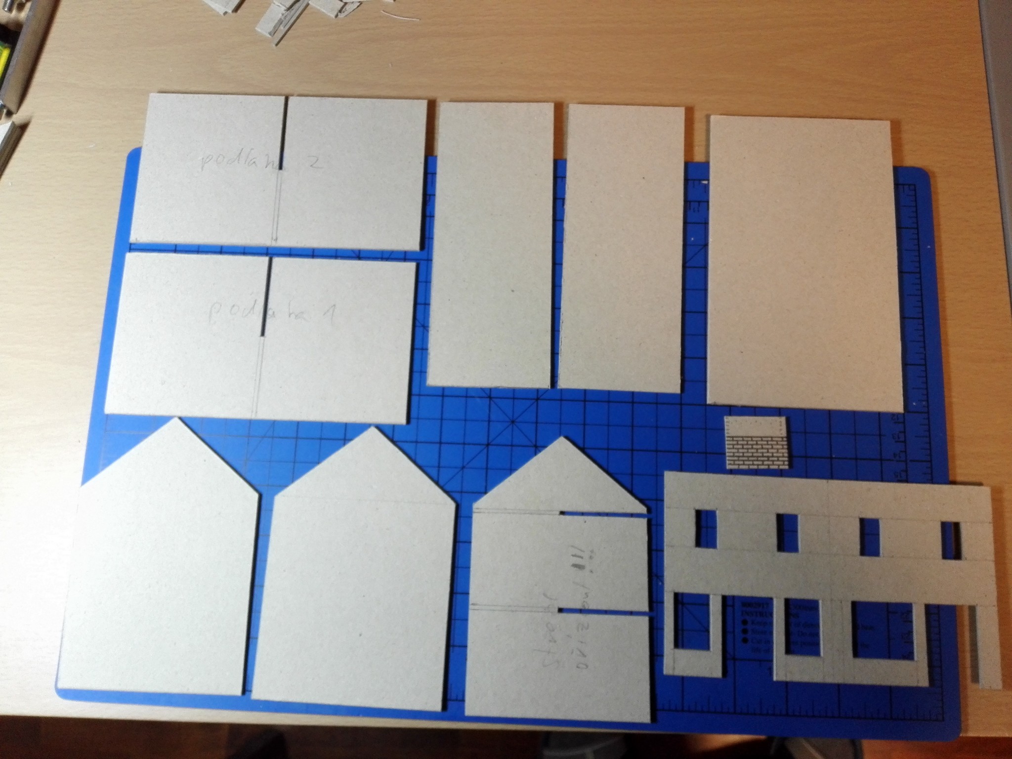 Po dokončení papírového modelu začala stavba modelu z lepenky. Nejdříve jsem vyřezal všechny obvodové zdi, vnitřní zdi, stropy a střechu. Prostě všechny díly potřebné ke stavbě. Řezal jsem kobercovým nožem na řezací podložce podle ocelového pravítka. Do nařezaných dílů jsem poté vyřezal otvory na okna, dveře a také otvory na poskládání vnitřních stěn tak, aby držely. Většina připravených dílů je na obrázku níže.