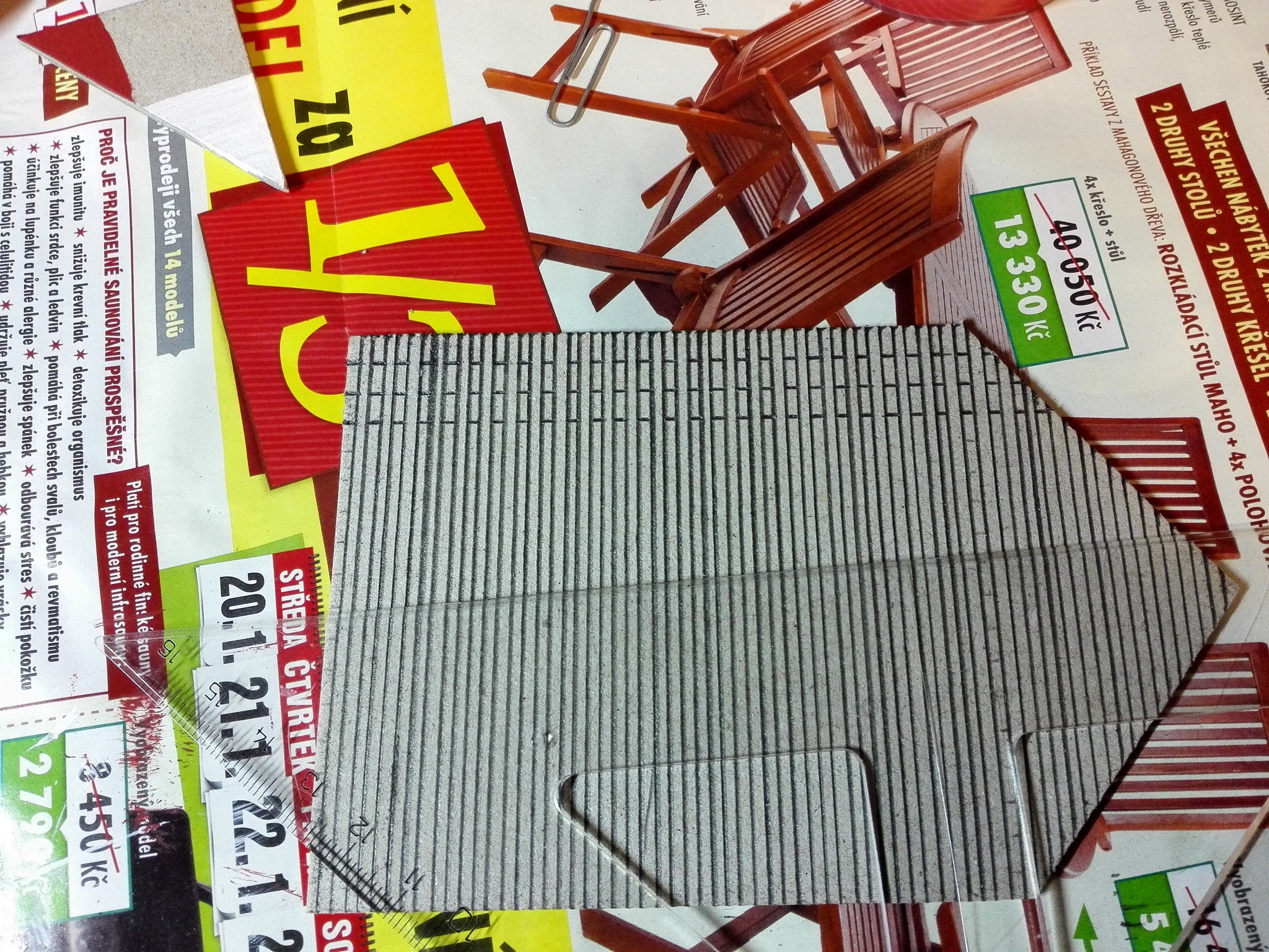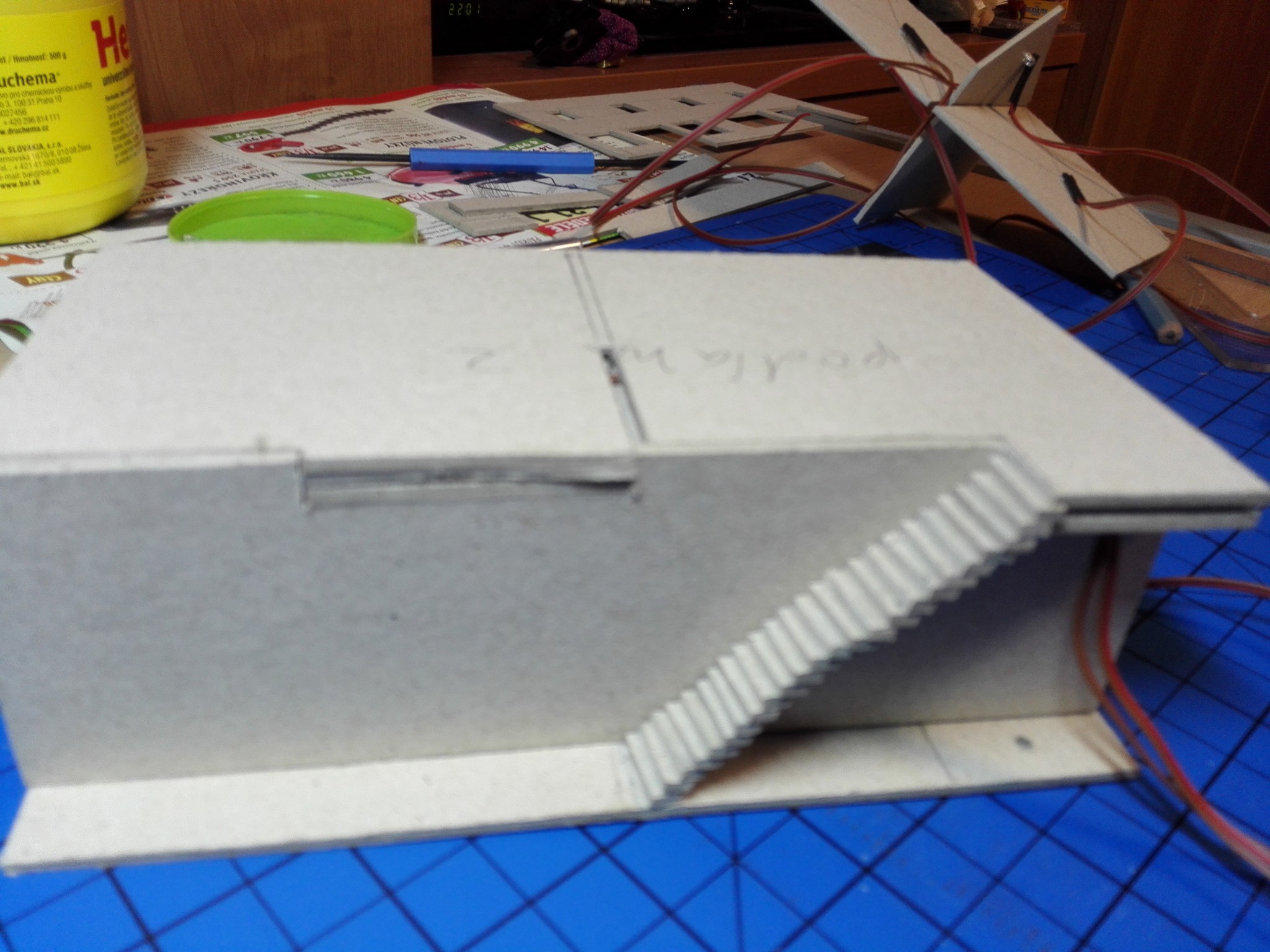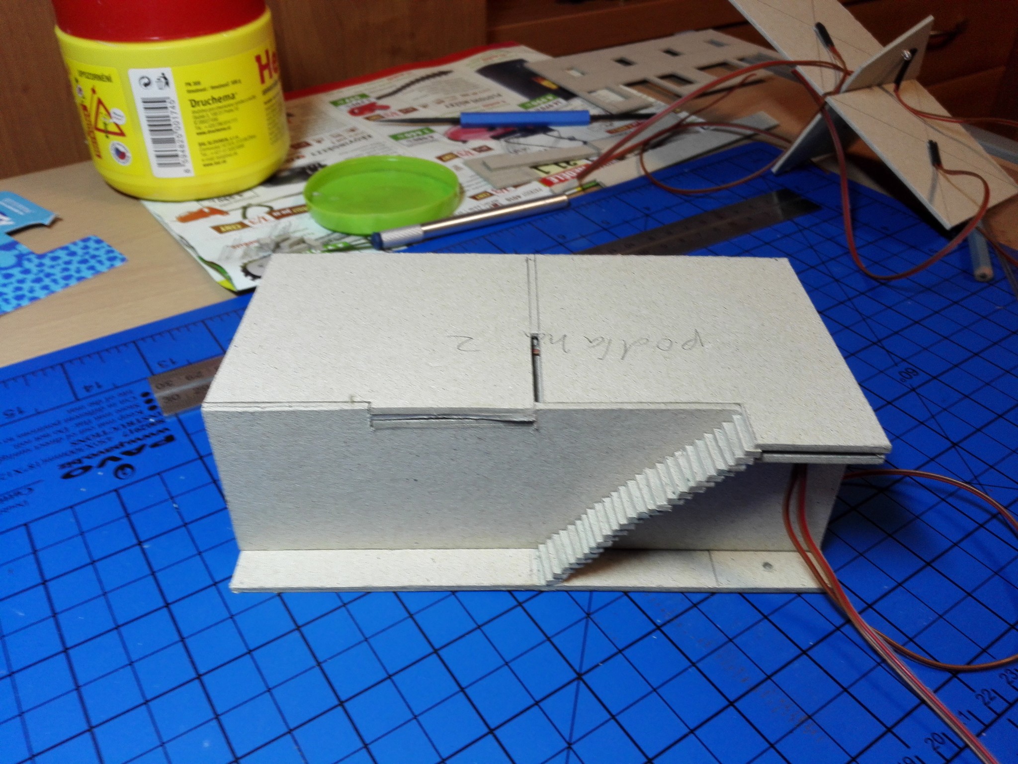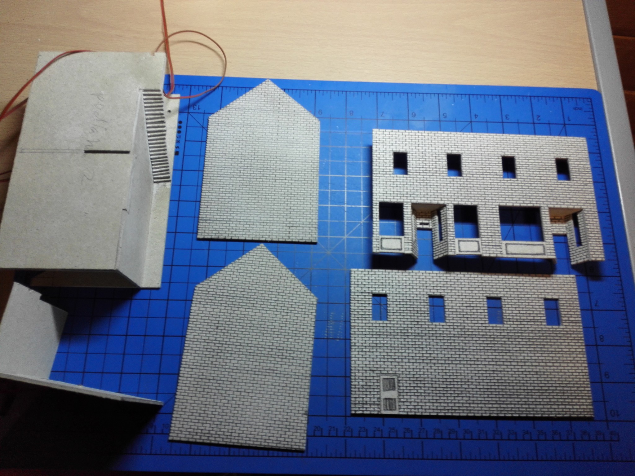 Po dokončení papírového modelu začala stavba modelu z lepenky. Nejdříve jsem vyřezal všechny obvodové zdi, vnitřní zdi, stropy a střechu. Prostě všechny díly potřebné ke stavbě. Řezal jsem kobercovým nožem na řezací podložce podle ocelového pravítka. Do nařezaných dílů jsem poté vyřezal otvory na okna, dveře a také otvory na poskládání vnitřních stěn tak, aby držely. Většina připravených dílů je na obrázku níže.