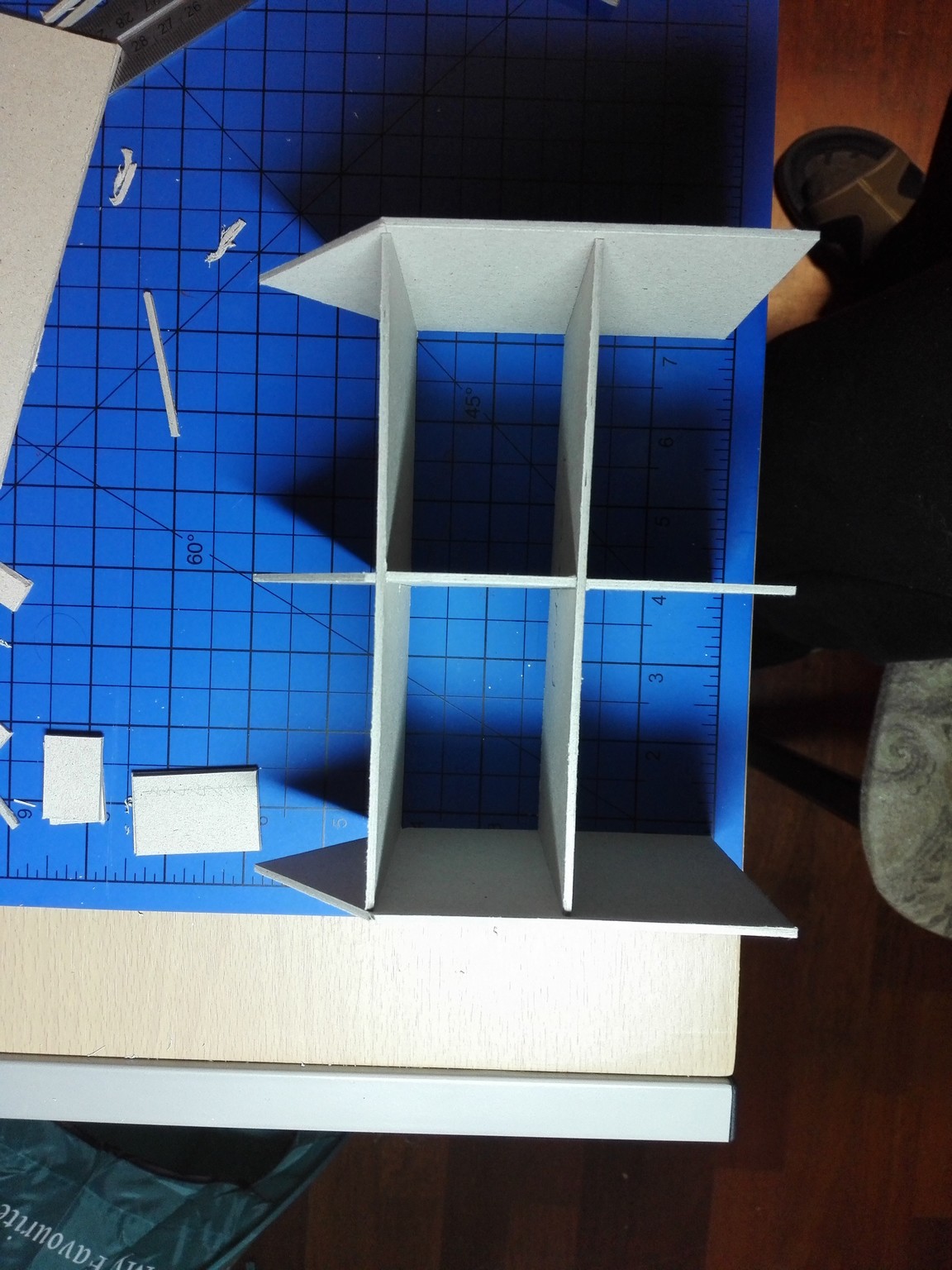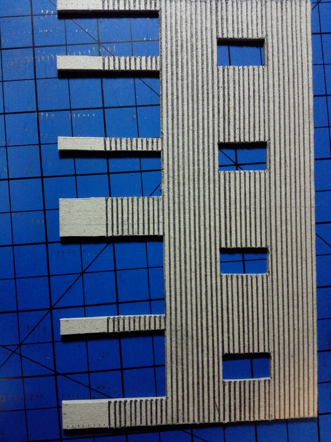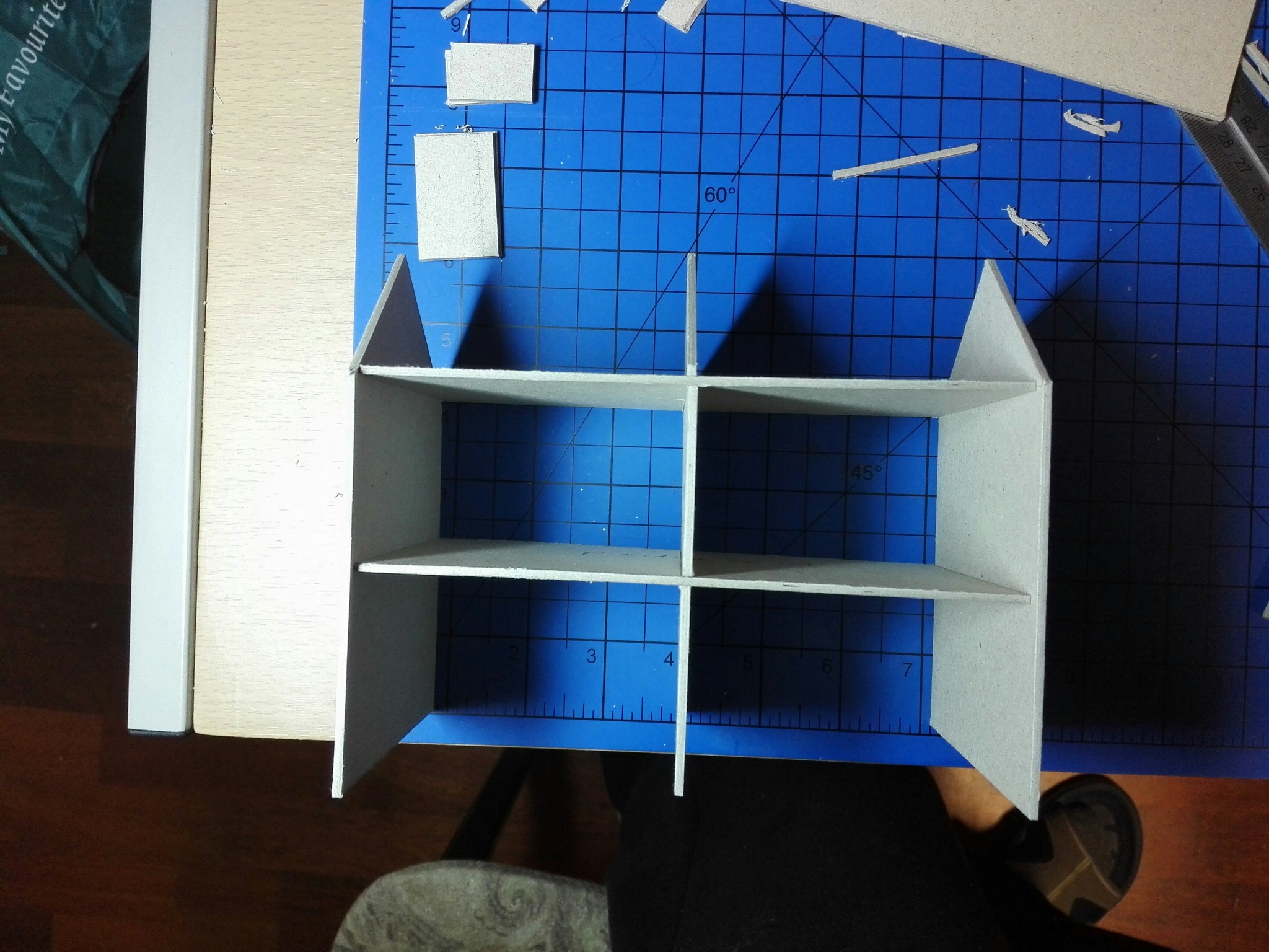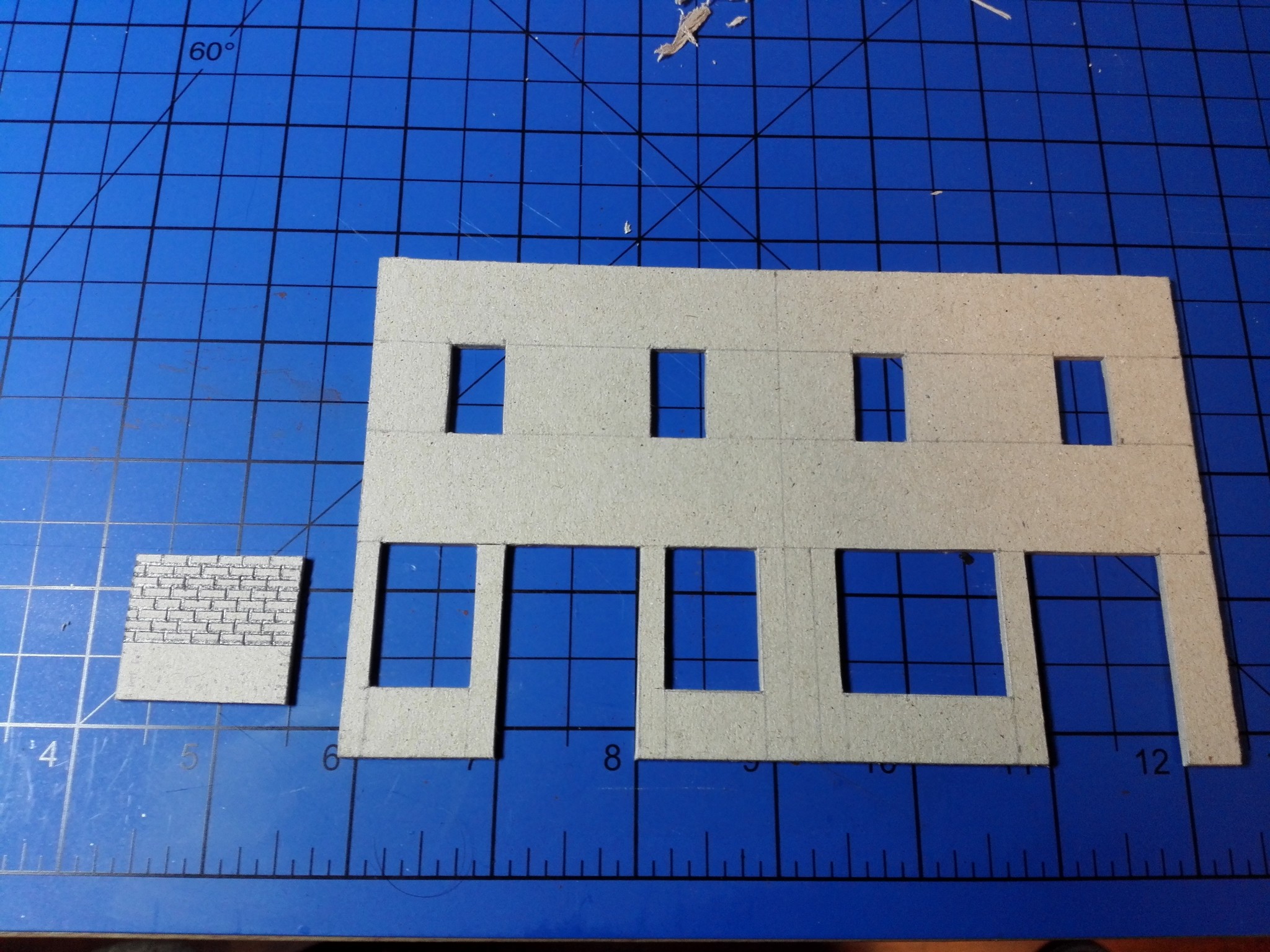 Po dokončení papírového modelu začala stavba modelu z lepenky. Nejdříve jsem vyřezal všechny obvodové zdi, vnitřní zdi, stropy a střechu. Prostě všechny díly potřebné ke stavbě. Řezal jsem kobercovým nožem na řezací podložce podle ocelového pravítka. Do nařezaných dílů jsem poté vyřezal otvory na okna, dveře a také otvory na poskládání vnitřních stěn tak, aby držely. Většina připravených dílů je na obrázku níže.