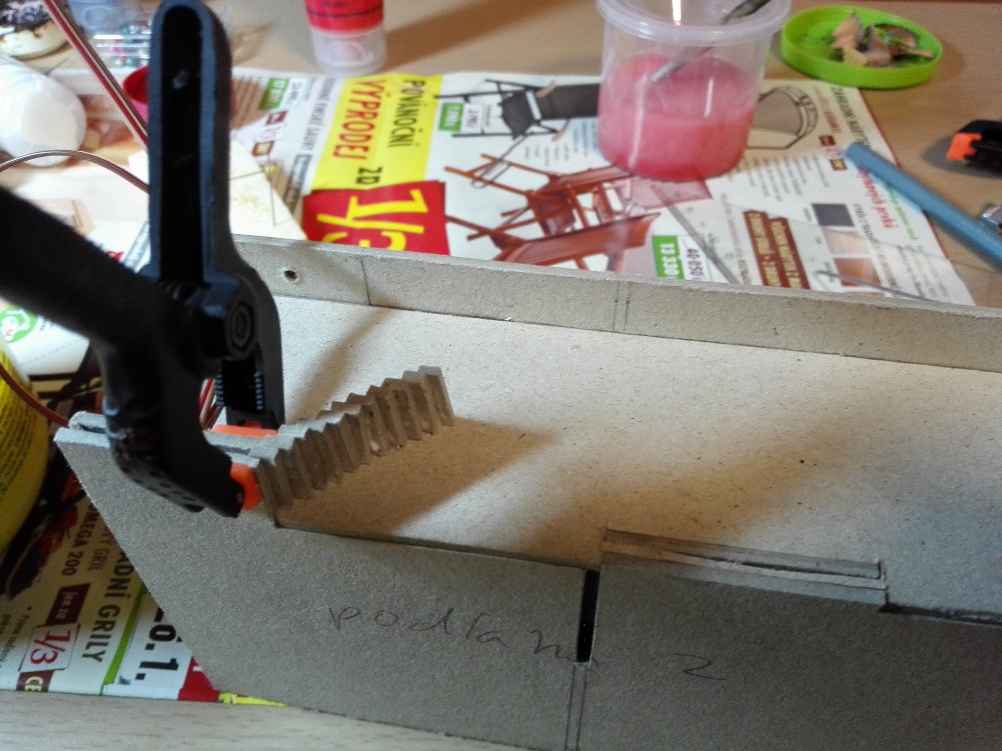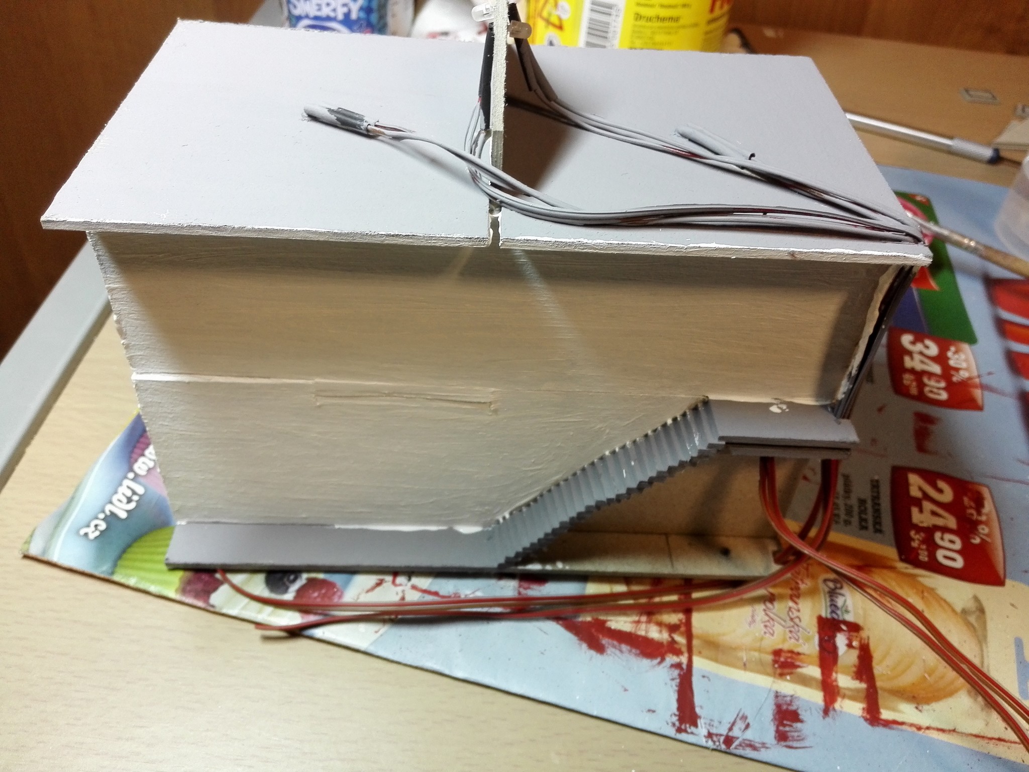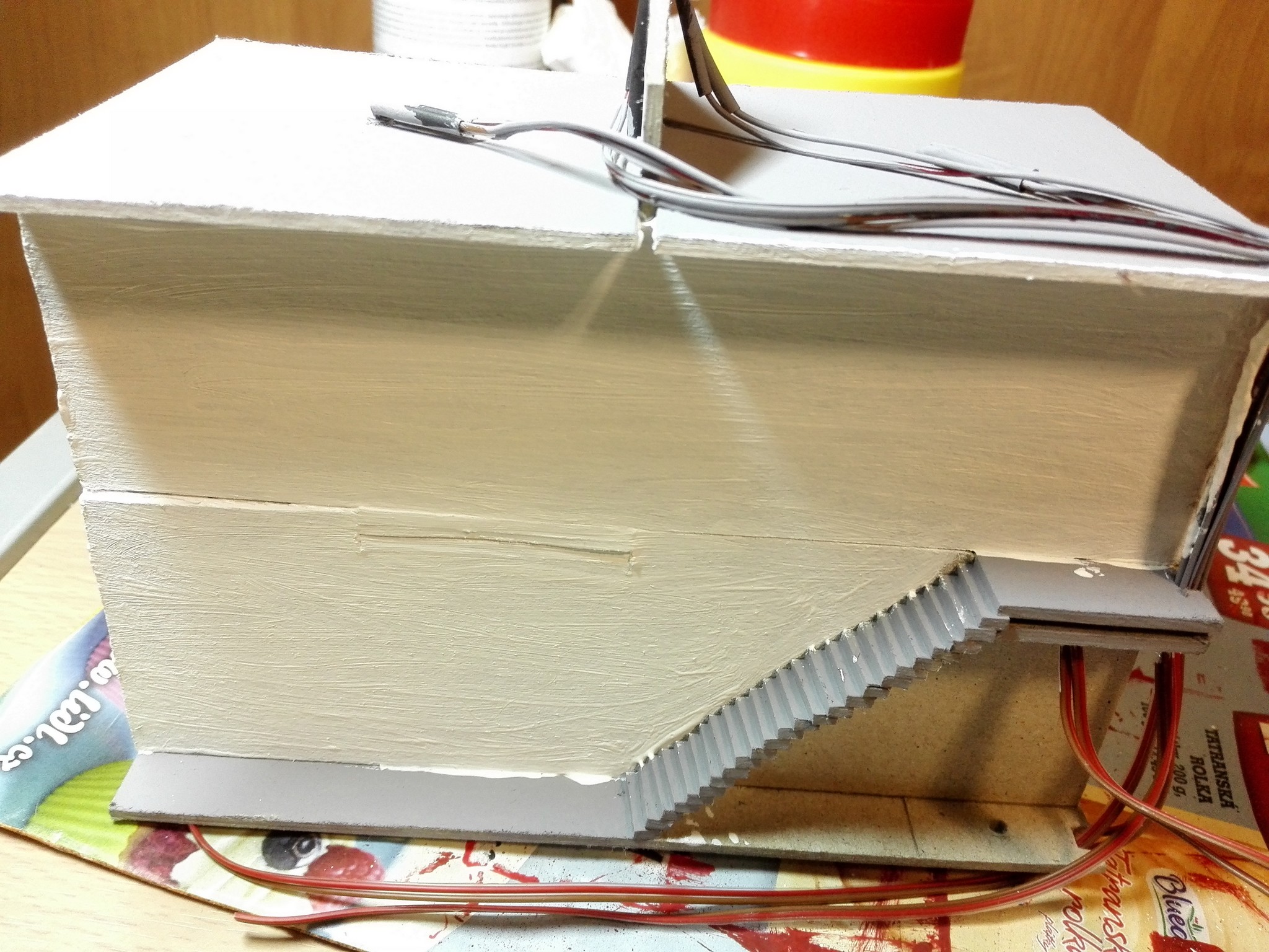 Také jsem si vytvořil uvnitř schodiště. Jakmile byl celý vnitřek připravený, tak jsem to slepil a nalakoval bezbarvým lakem. Teprve poté jsem začal akrylovými barvami vše natírat.