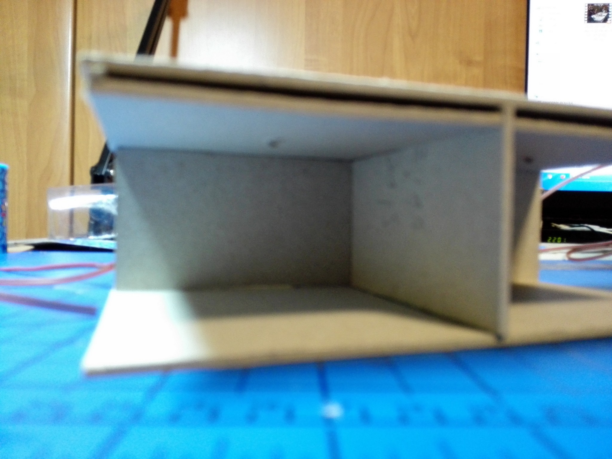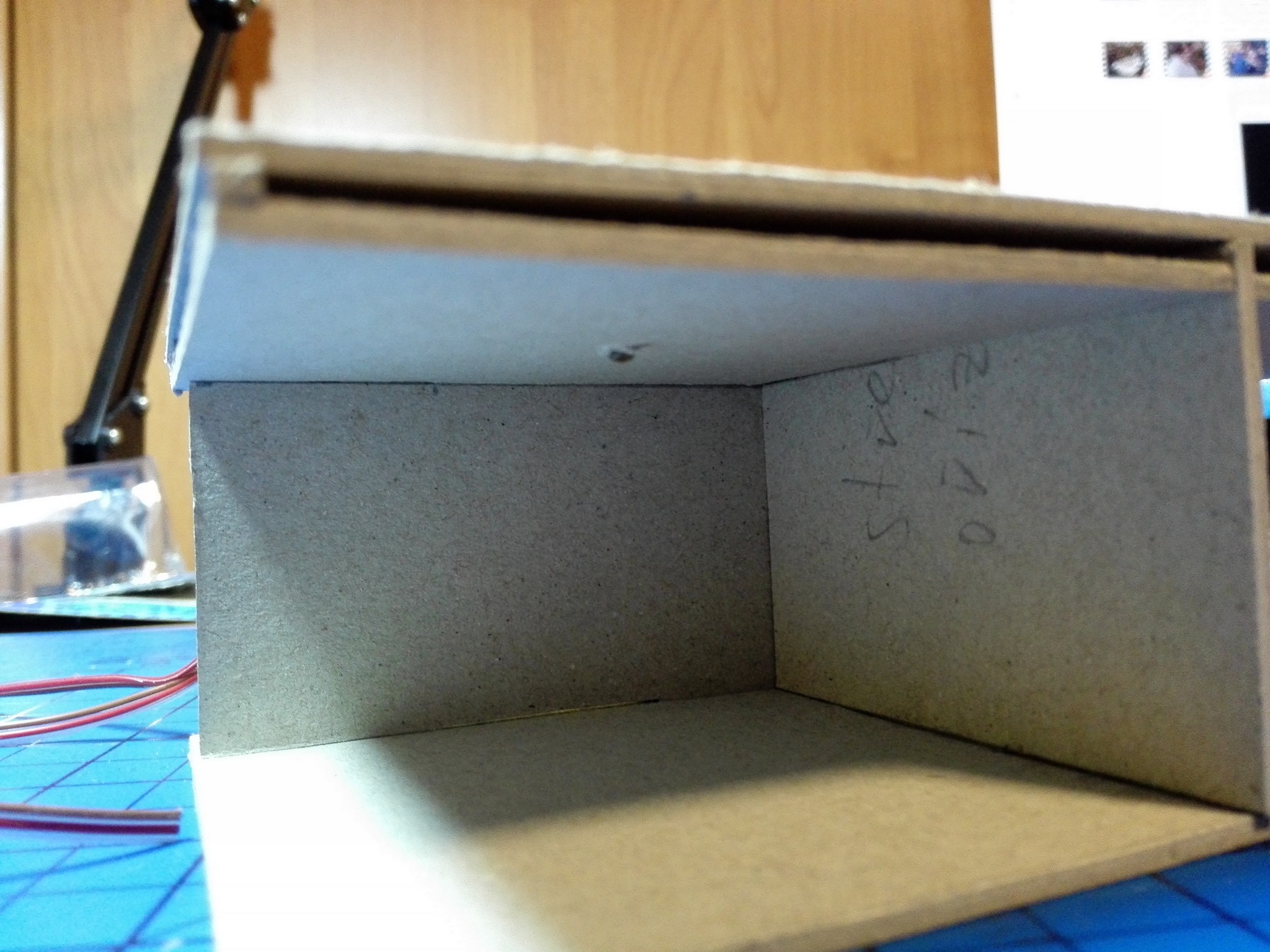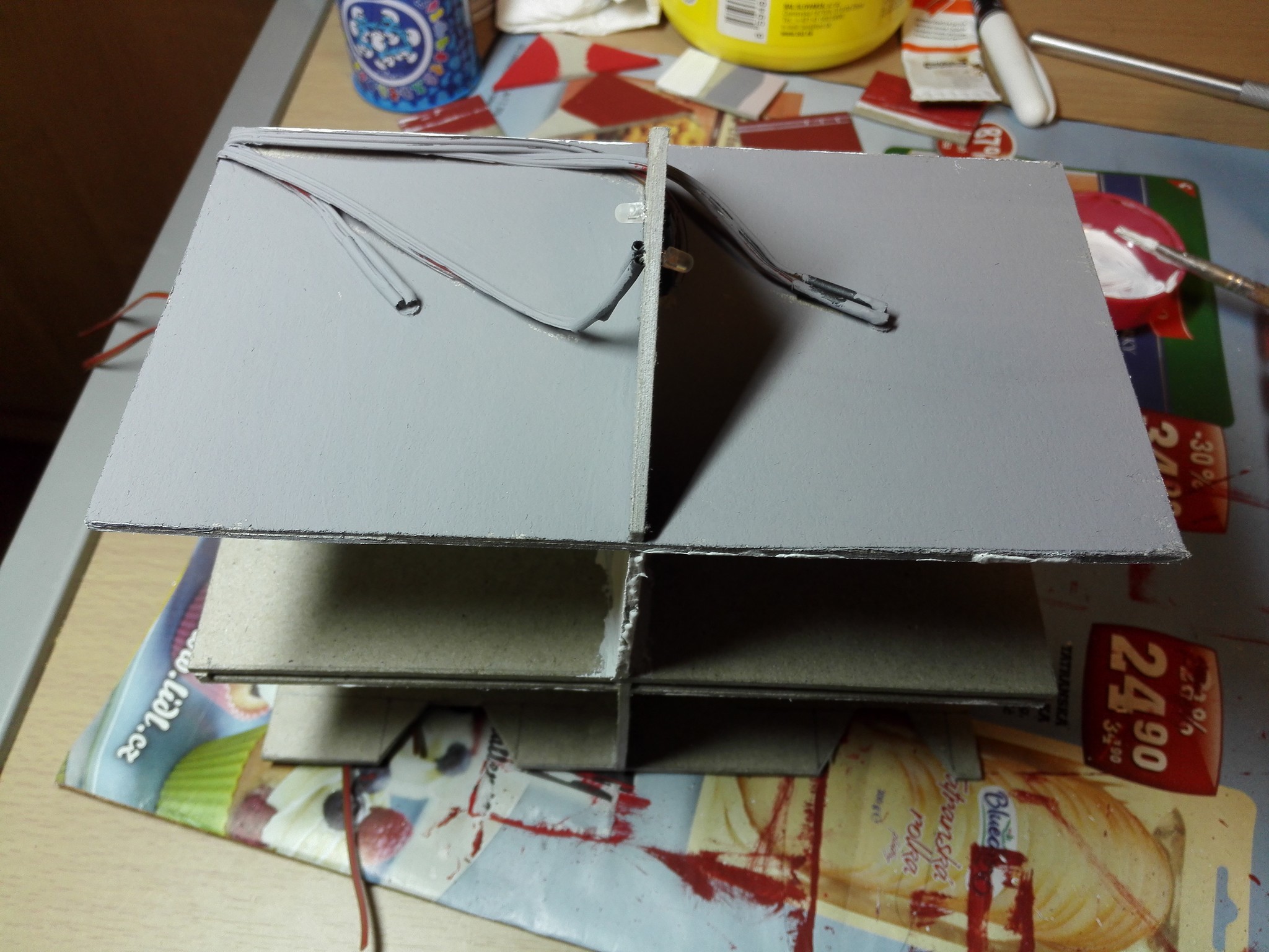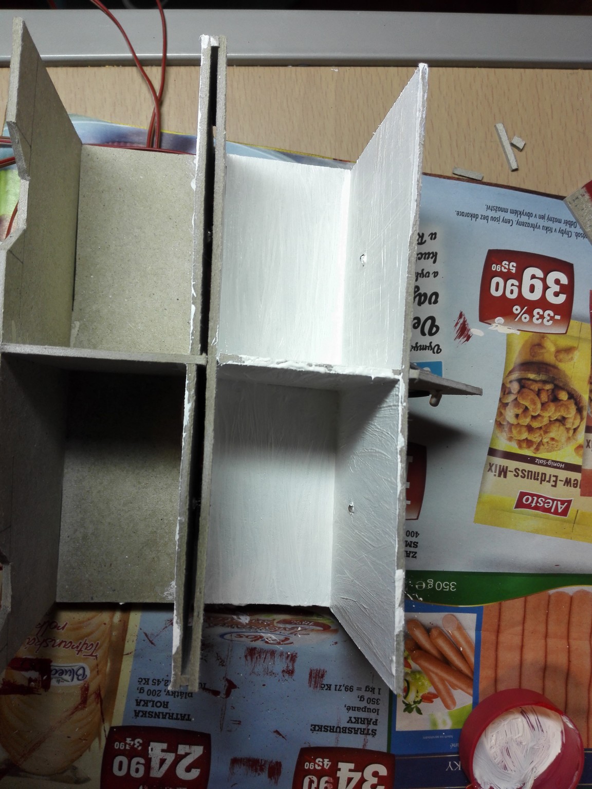 Poté jsem se nějakou dobu věnoval seskládání vnitřních stěn tak, aby tvořili místnosti. Zároveň s tím jsem si nachystal prostor pro LED diody na osvětlení. Diody jsem usadil vždy na stropě a udělal jsem dvojité stropy na vedení kabelů. Vše je patrné z obrázků níže.