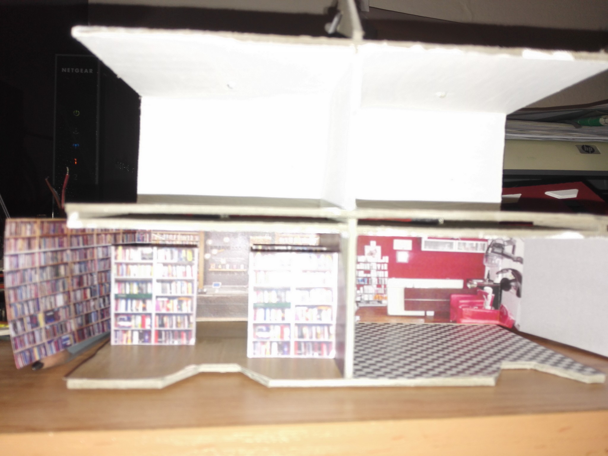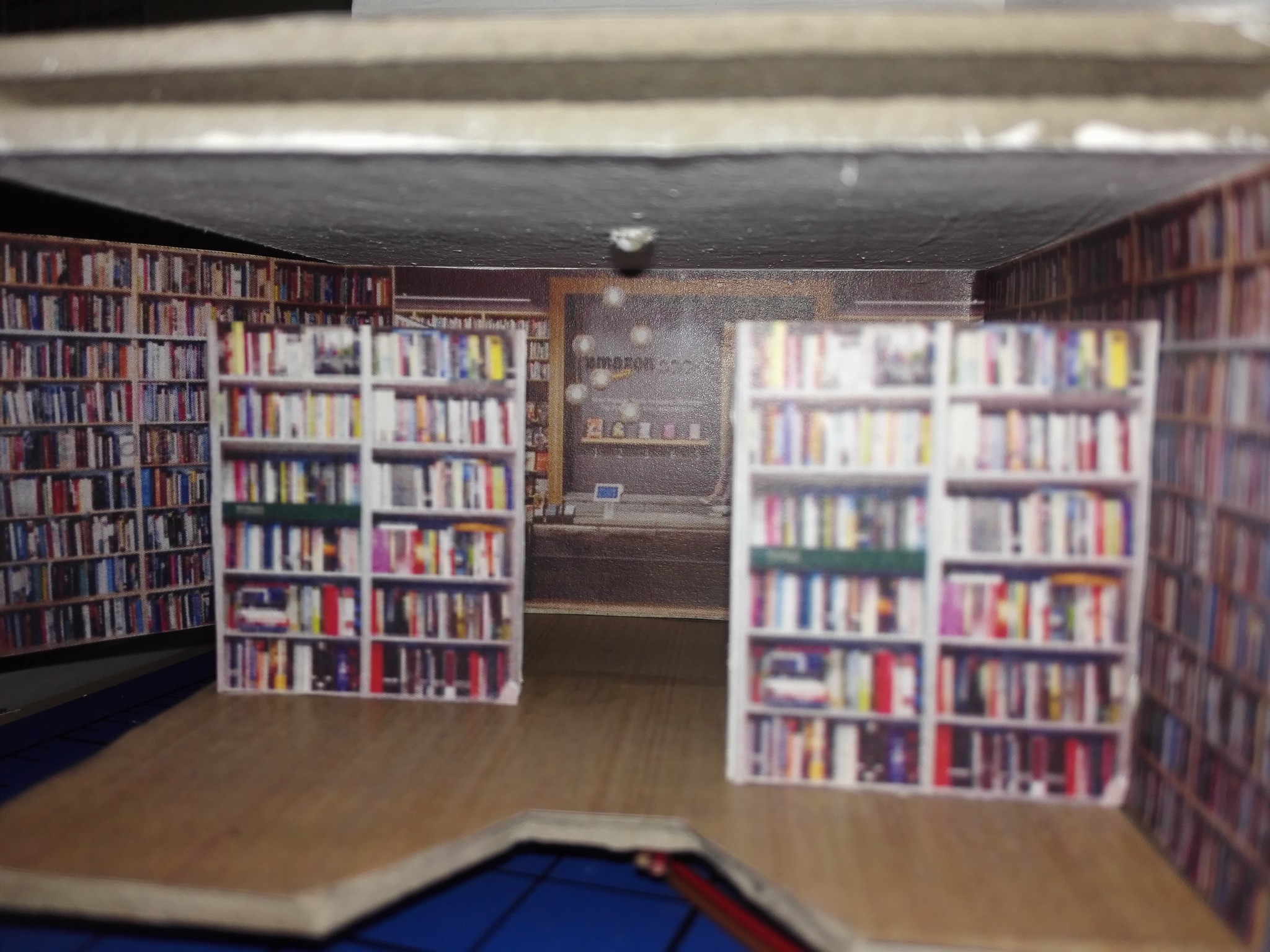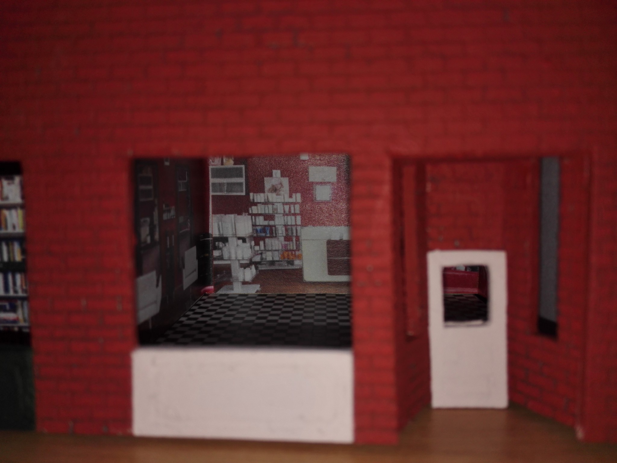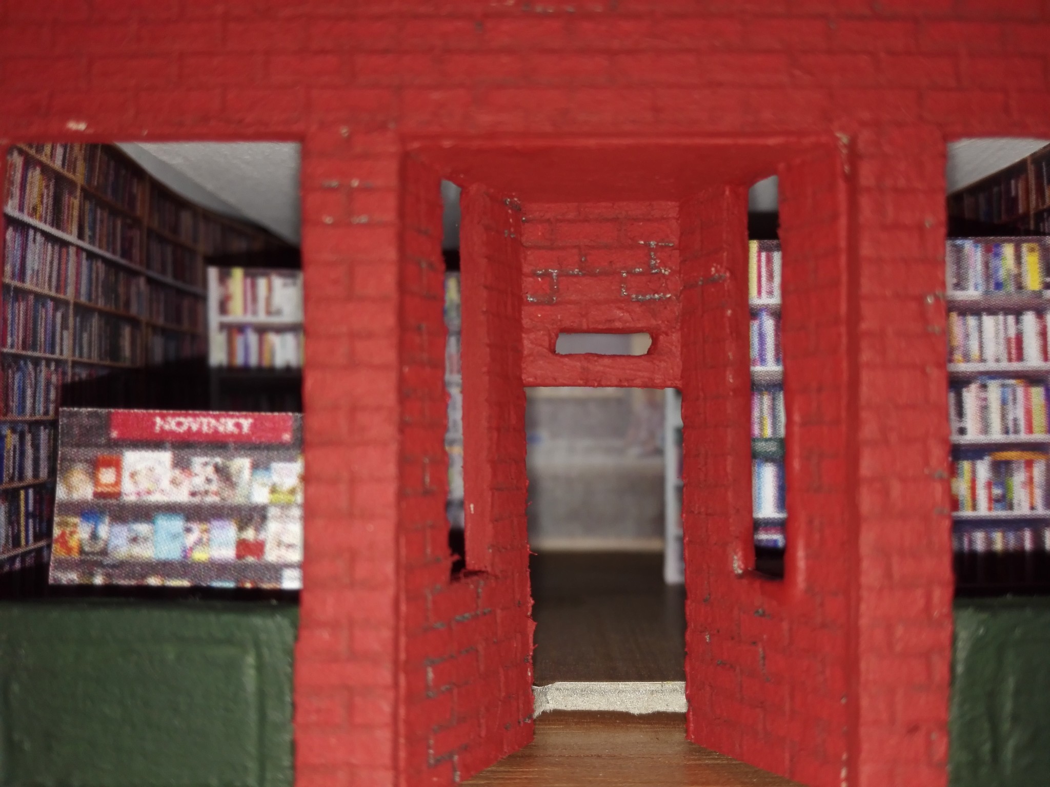 Aby dům měl, co nejvíce detailů, rozhodl jsem se vytvořit i vnitřek obchodů. Stáhl jsem si několik obrázků z internetu, které připomínali, co nejvíce moji představu a zkombinoval jsem je do patřičného rozměru. Poté vytiskl na barevné tiskárně a nalepil. Knihovny v knihkupectví jsem navíc podlepil lepenkou a postavil i doprostřed místnosti. No posuďte sami, skoro není poznat, že to není skutečný obchod. 🙂