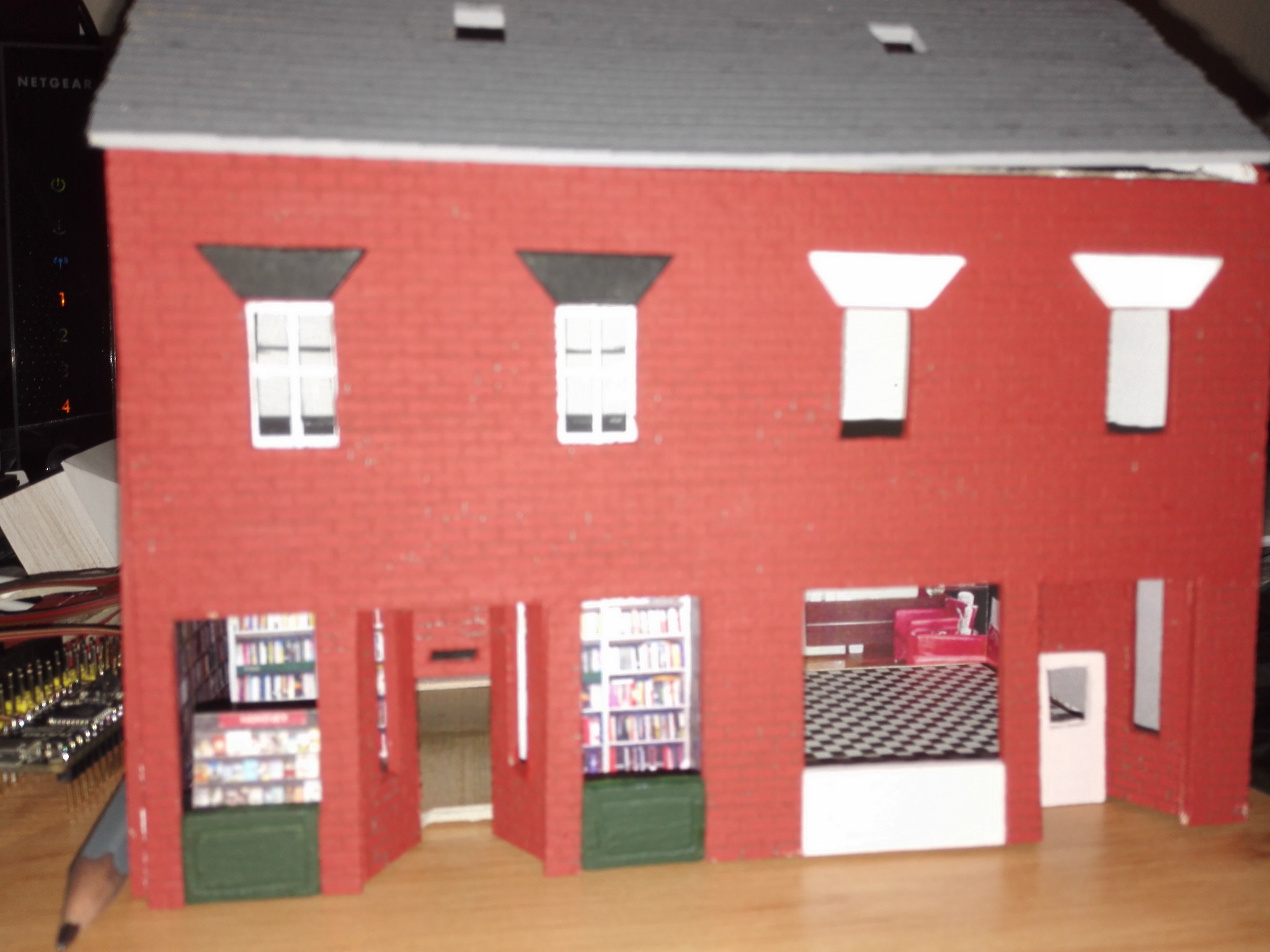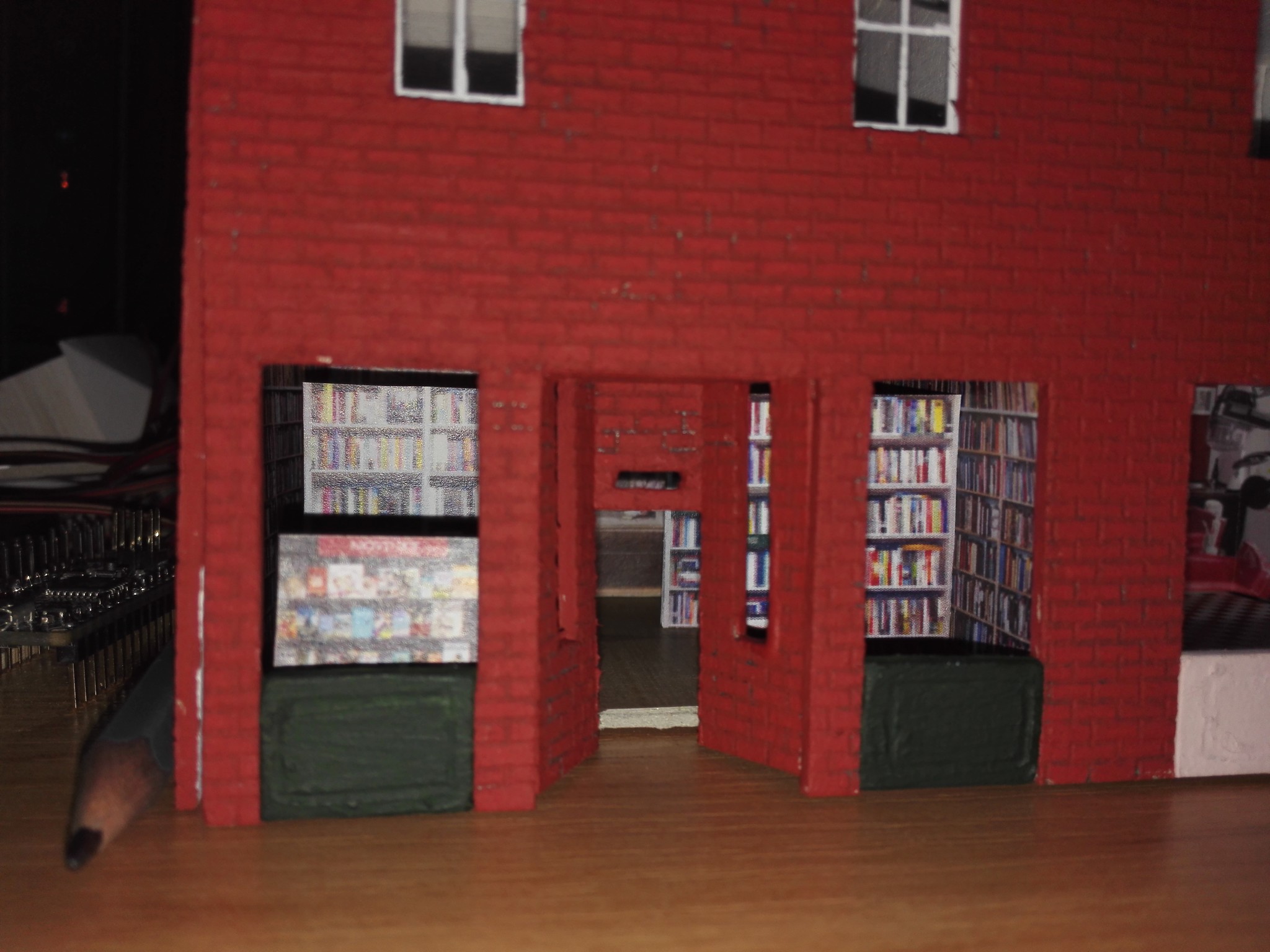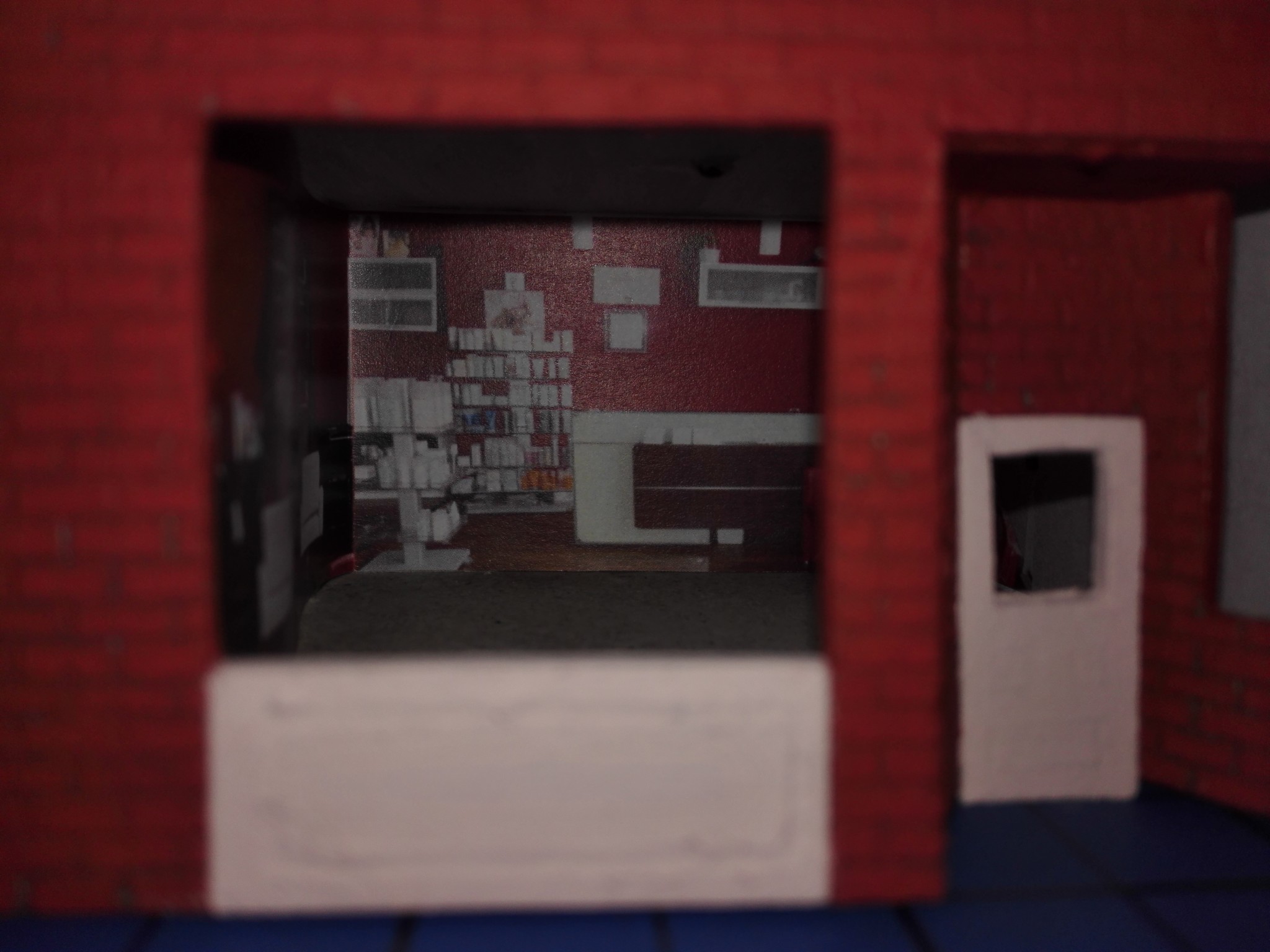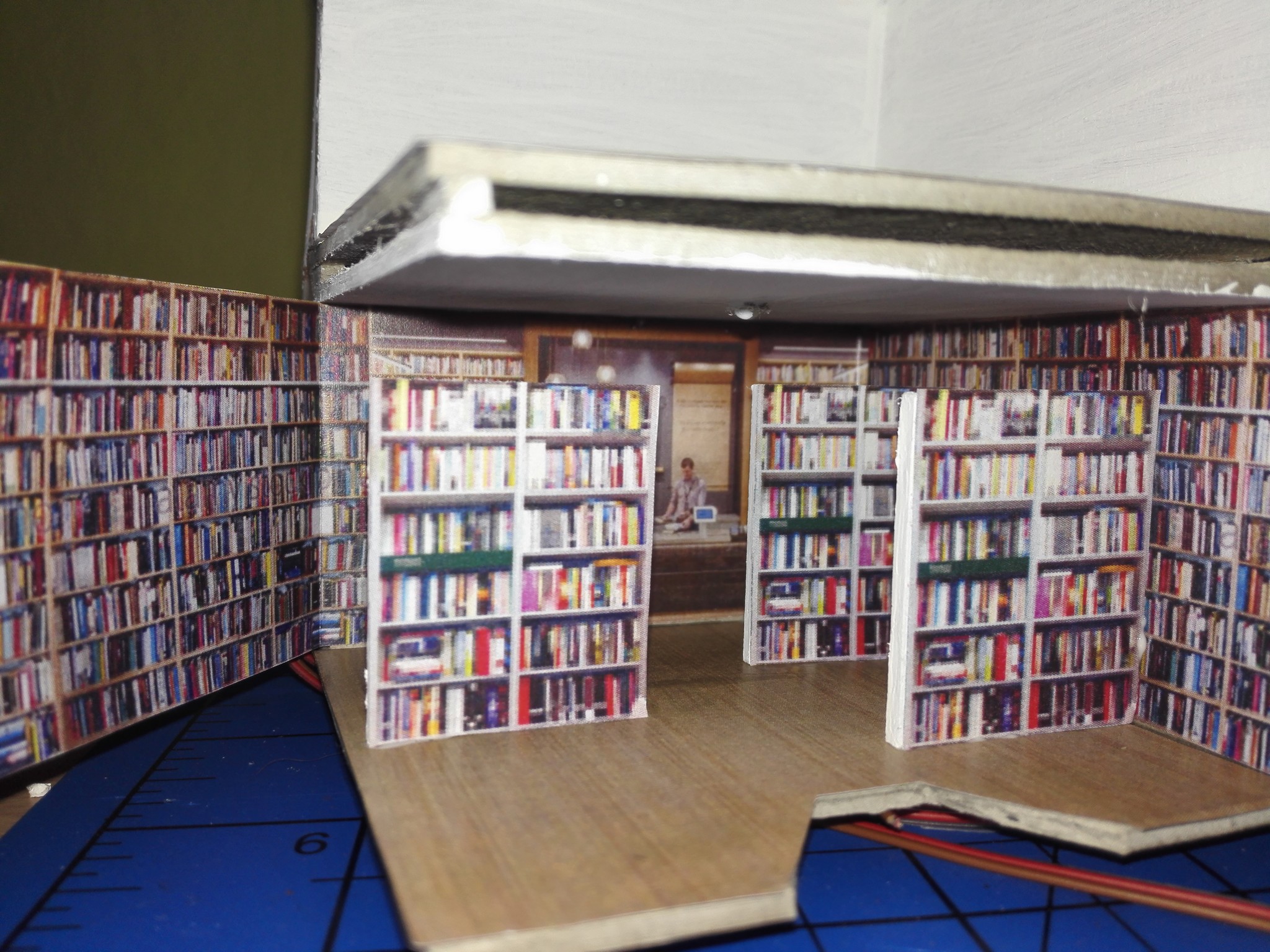 Aby dům měl, co nejvíce detailů, rozhodl jsem se vytvořit i vnitřek obchodů. Stáhl jsem si několik obrázků z internetu, které připomínali, co nejvíce moji představu a zkombinoval jsem je do patřičného rozměru. Poté vytiskl na barevné tiskárně a nalepil. Knihovny v knihkupectví jsem navíc podlepil lepenkou a postavil i doprostřed místnosti. No posuďte sami, skoro není poznat, že to není skutečný obchod. 🙂