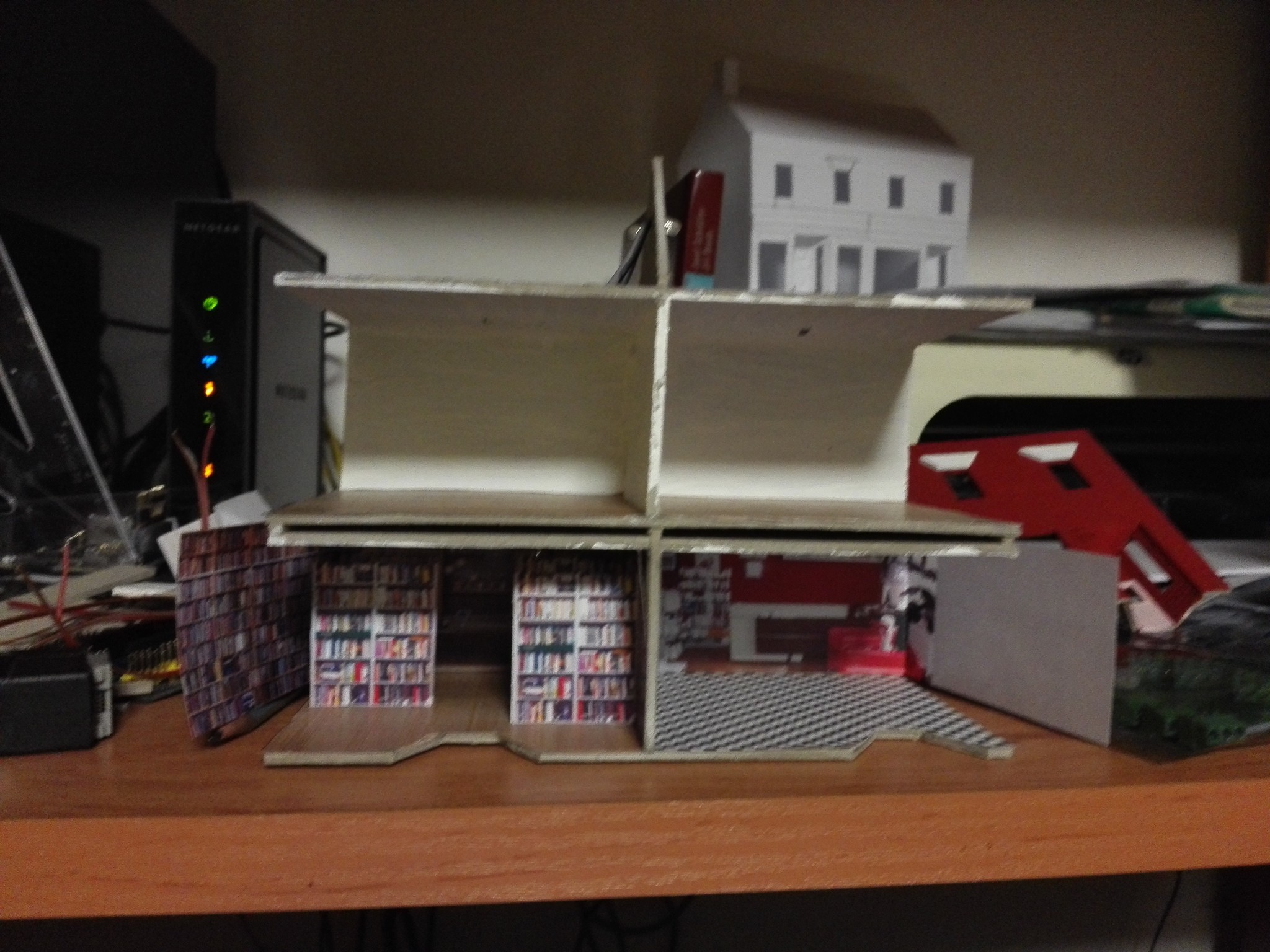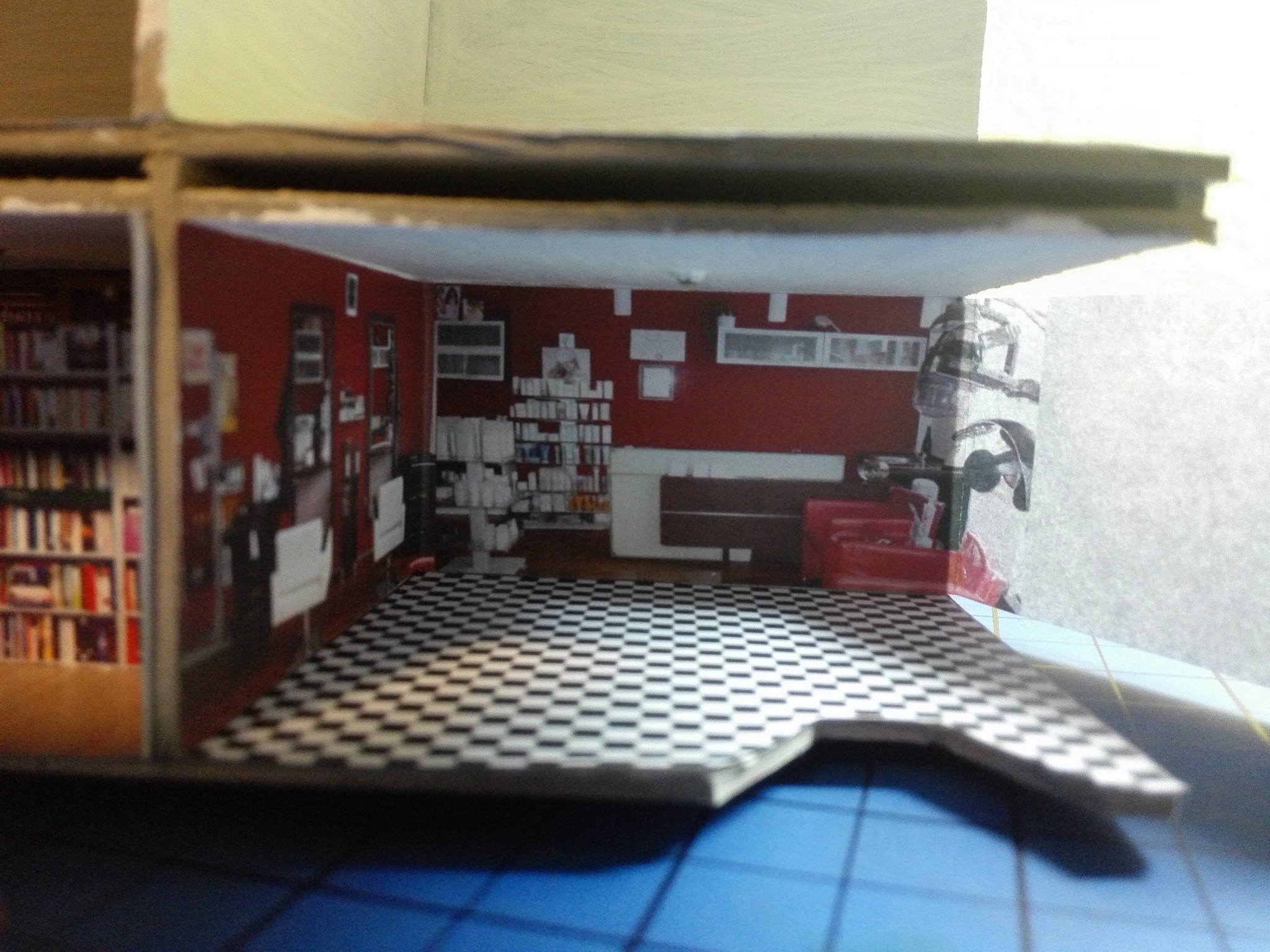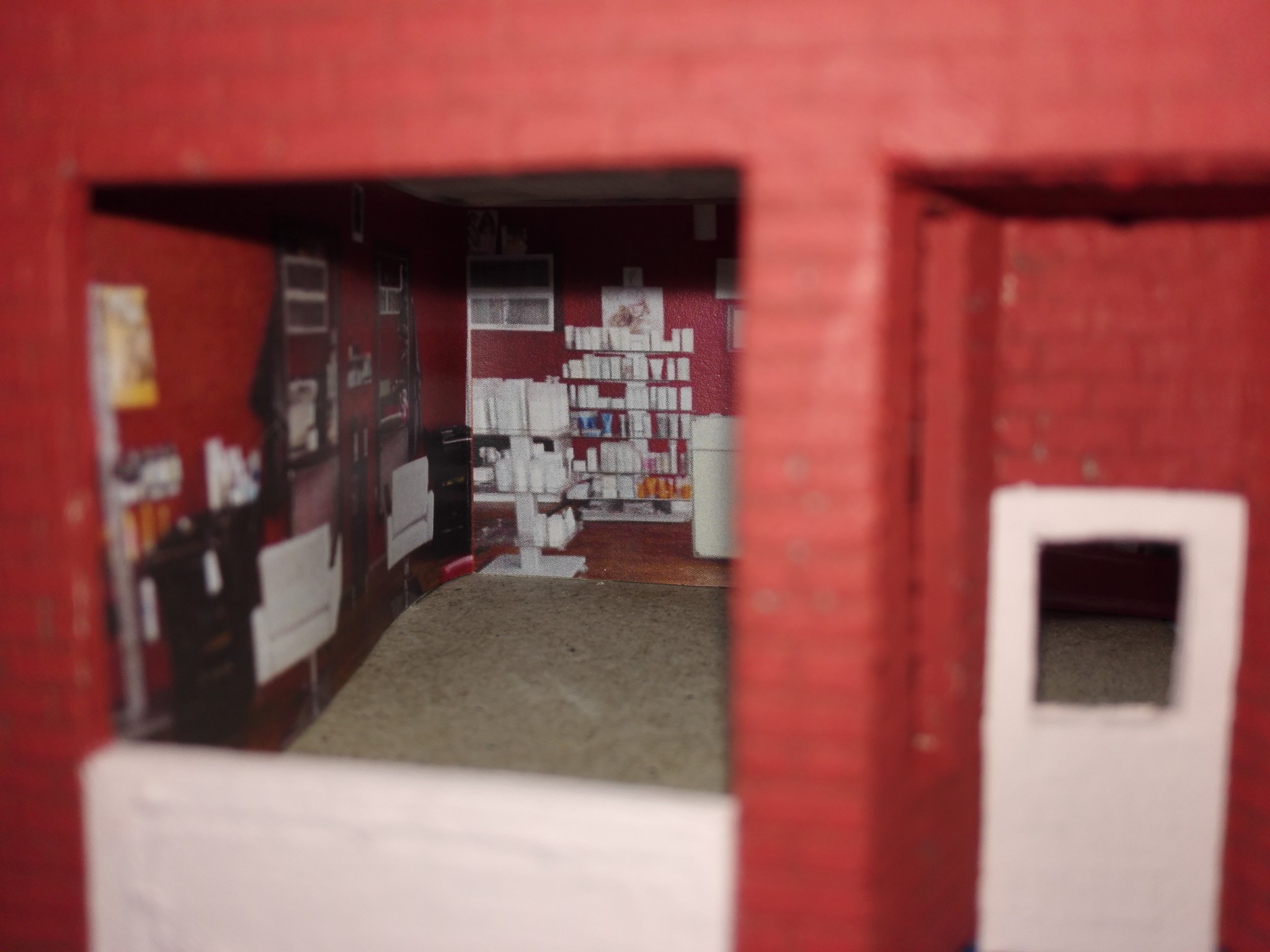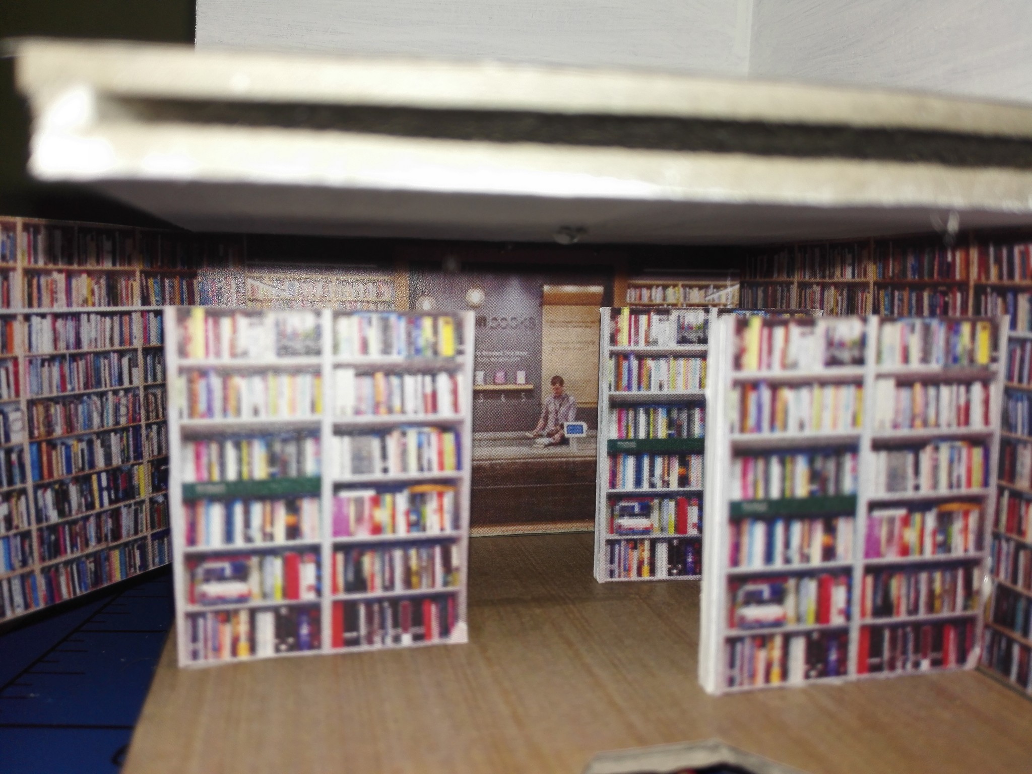 Aby dům měl, co nejvíce detailů, rozhodl jsem se vytvořit i vnitřek obchodů. Stáhl jsem si několik obrázků z internetu, které připomínali, co nejvíce moji představu a zkombinoval jsem je do patřičného rozměru. Poté vytiskl na barevné tiskárně a nalepil. Knihovny v knihkupectví jsem navíc podlepil lepenkou a postavil i doprostřed místnosti. No posuďte sami, skoro není poznat, že to není skutečný obchod. 🙂