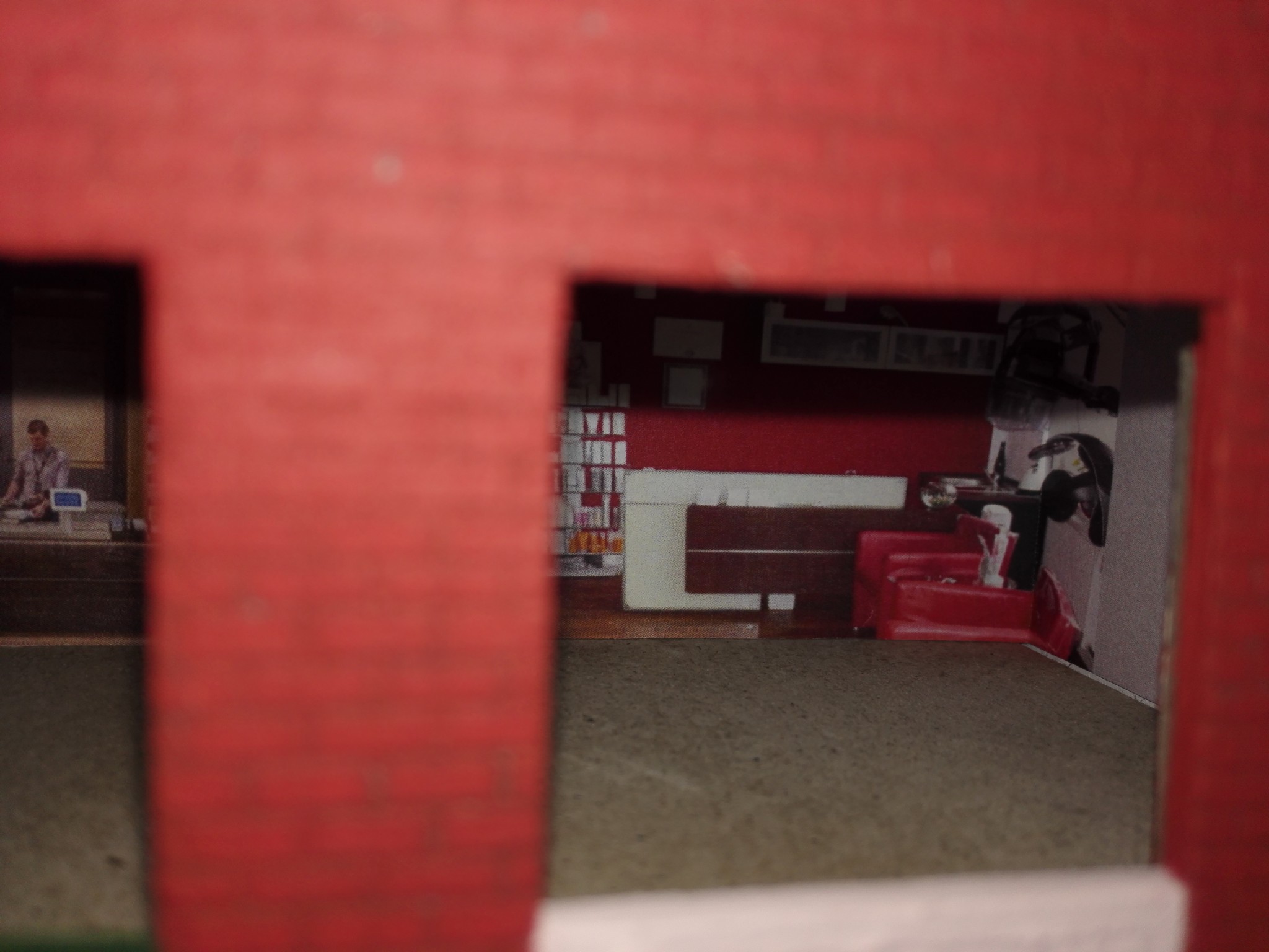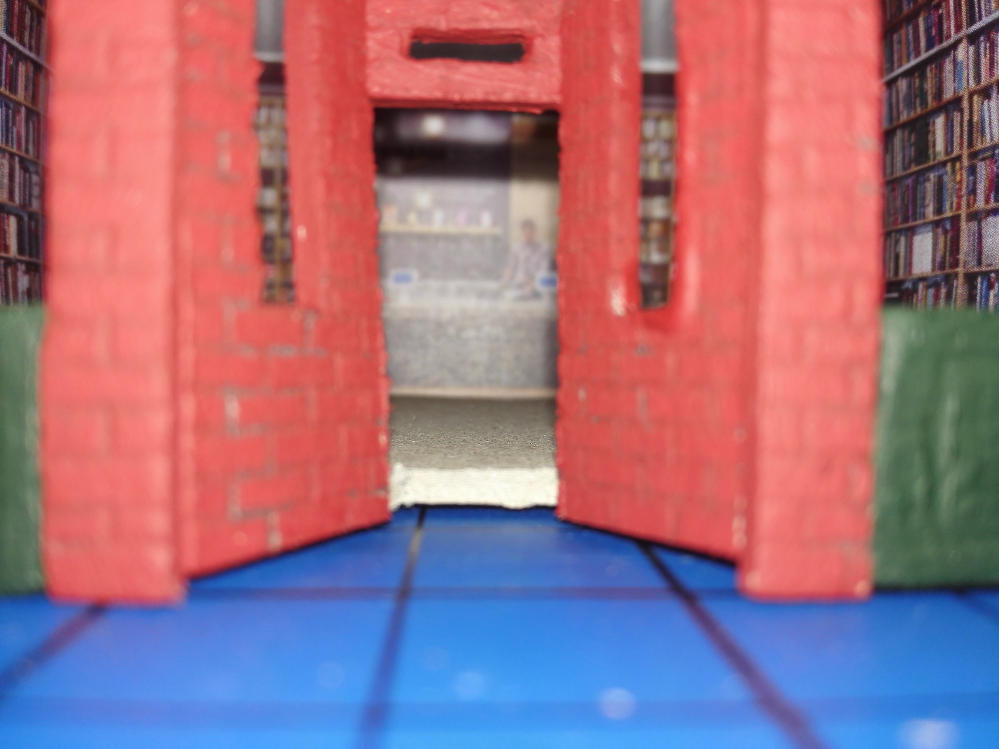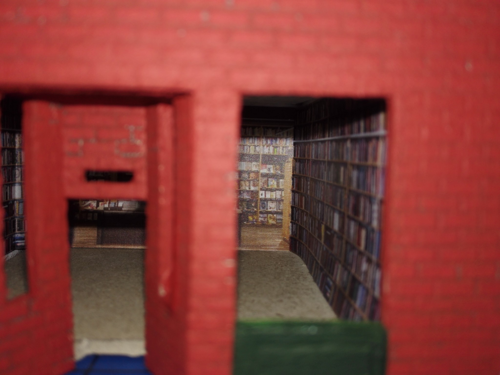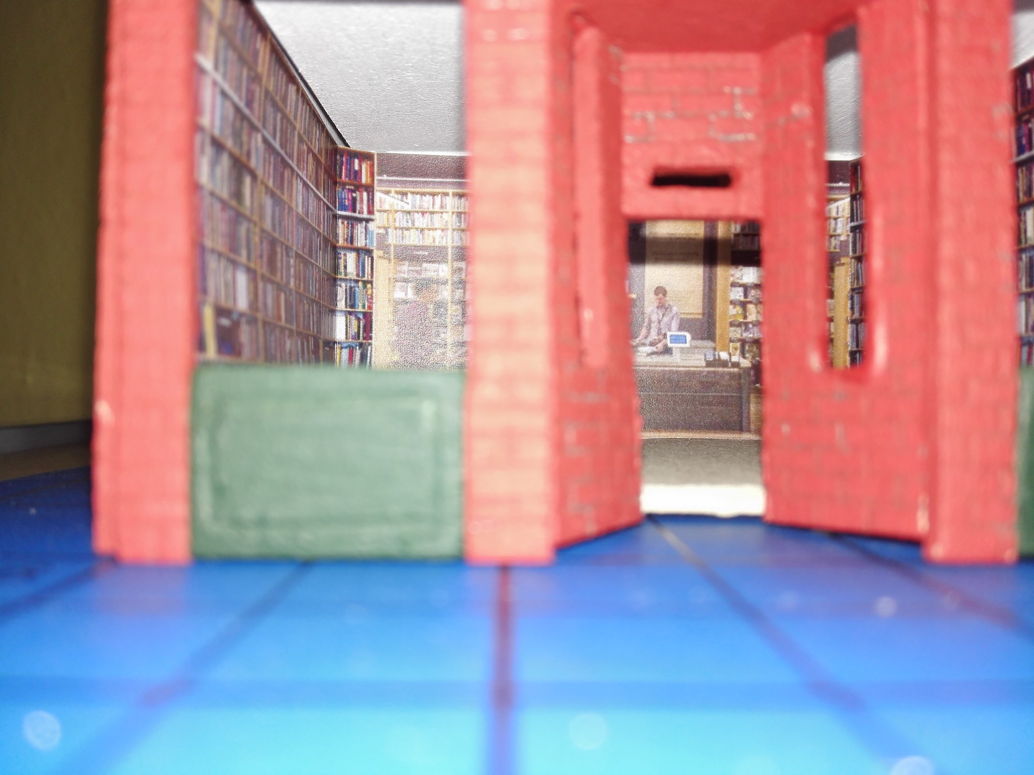Aby dům měl, co nejvíce detailů, rozhodl jsem se vytvořit i vnitřek obchodů. Stáhl jsem si několik obrázků z internetu, které připomínali, co nejvíce moji představu a zkombinoval jsem je do patřičného rozměru. Poté vytiskl na barevné tiskárně a nalepil. Knihovny v knihkupectví jsem navíc podlepil lepenkou a postavil i doprostřed místnosti. No posuďte sami, skoro není poznat, že to není skutečný obchod. 🙂