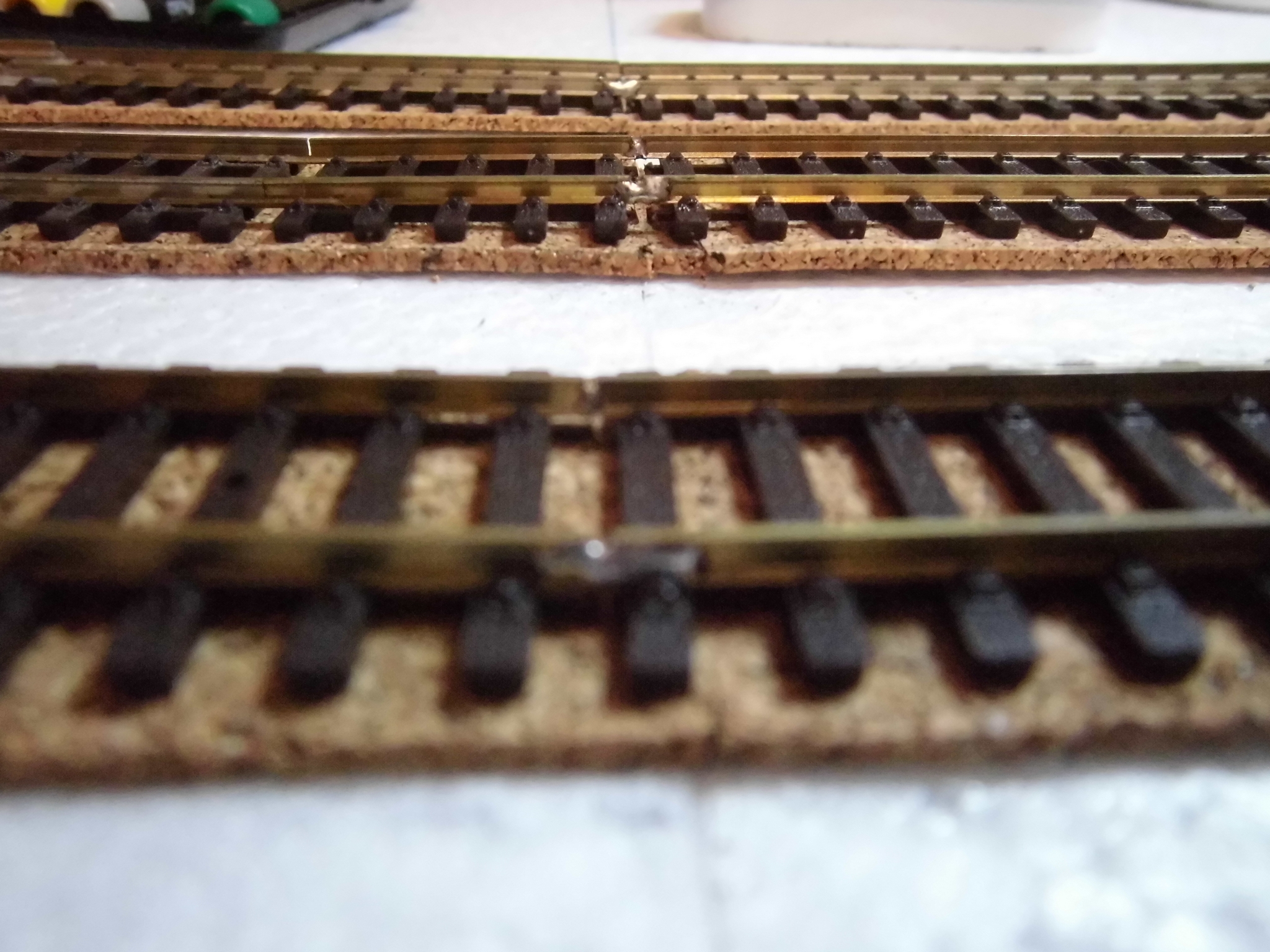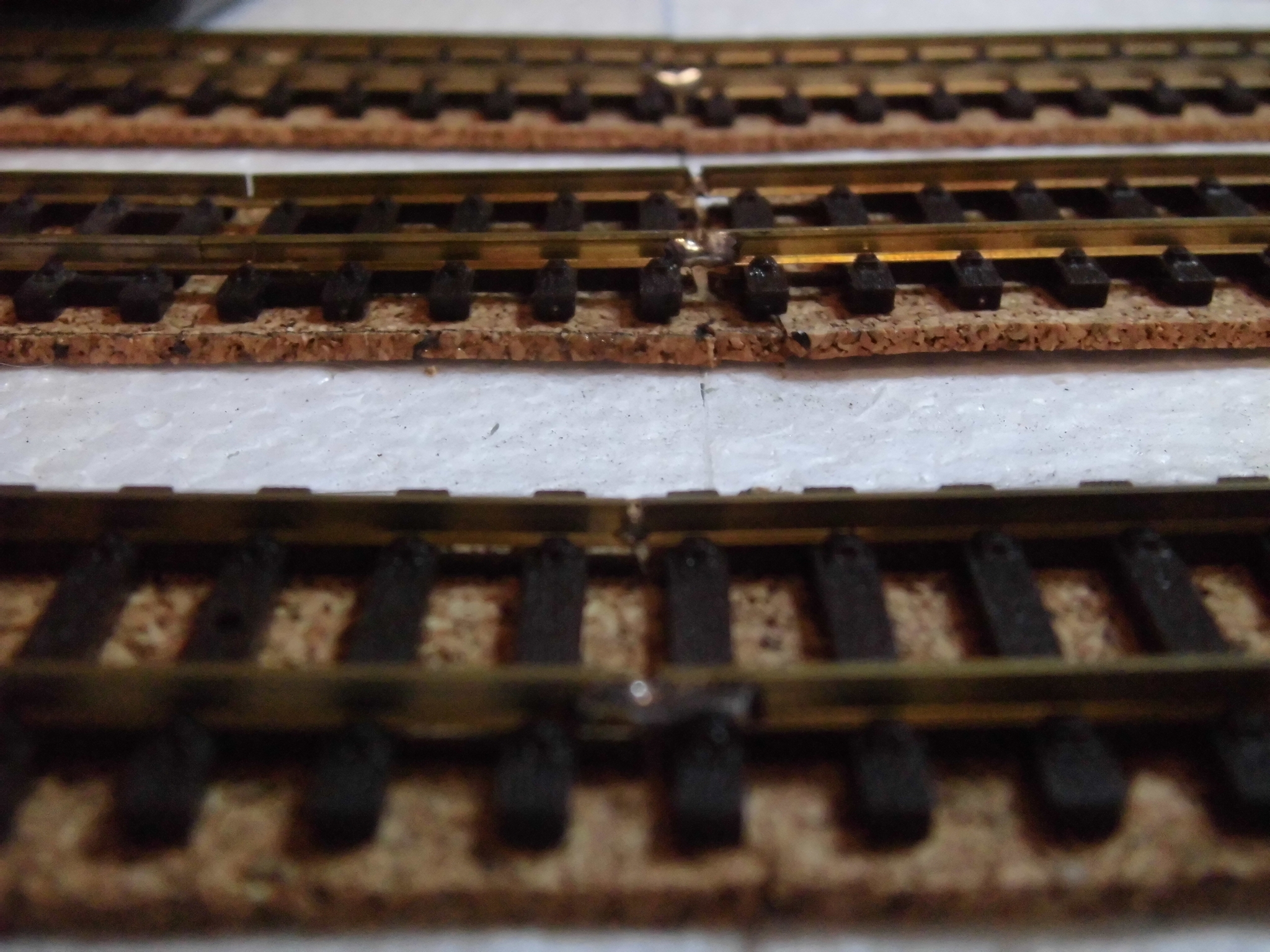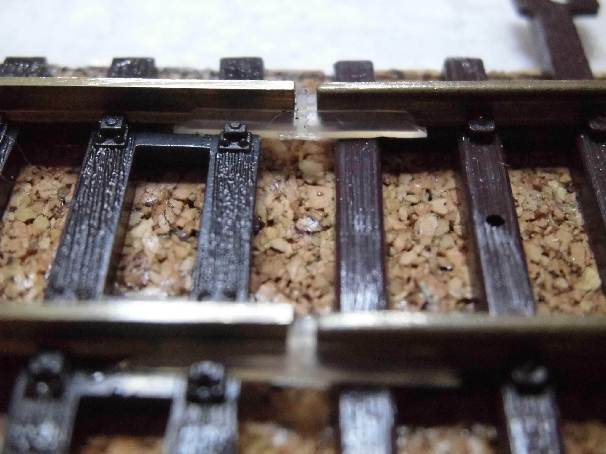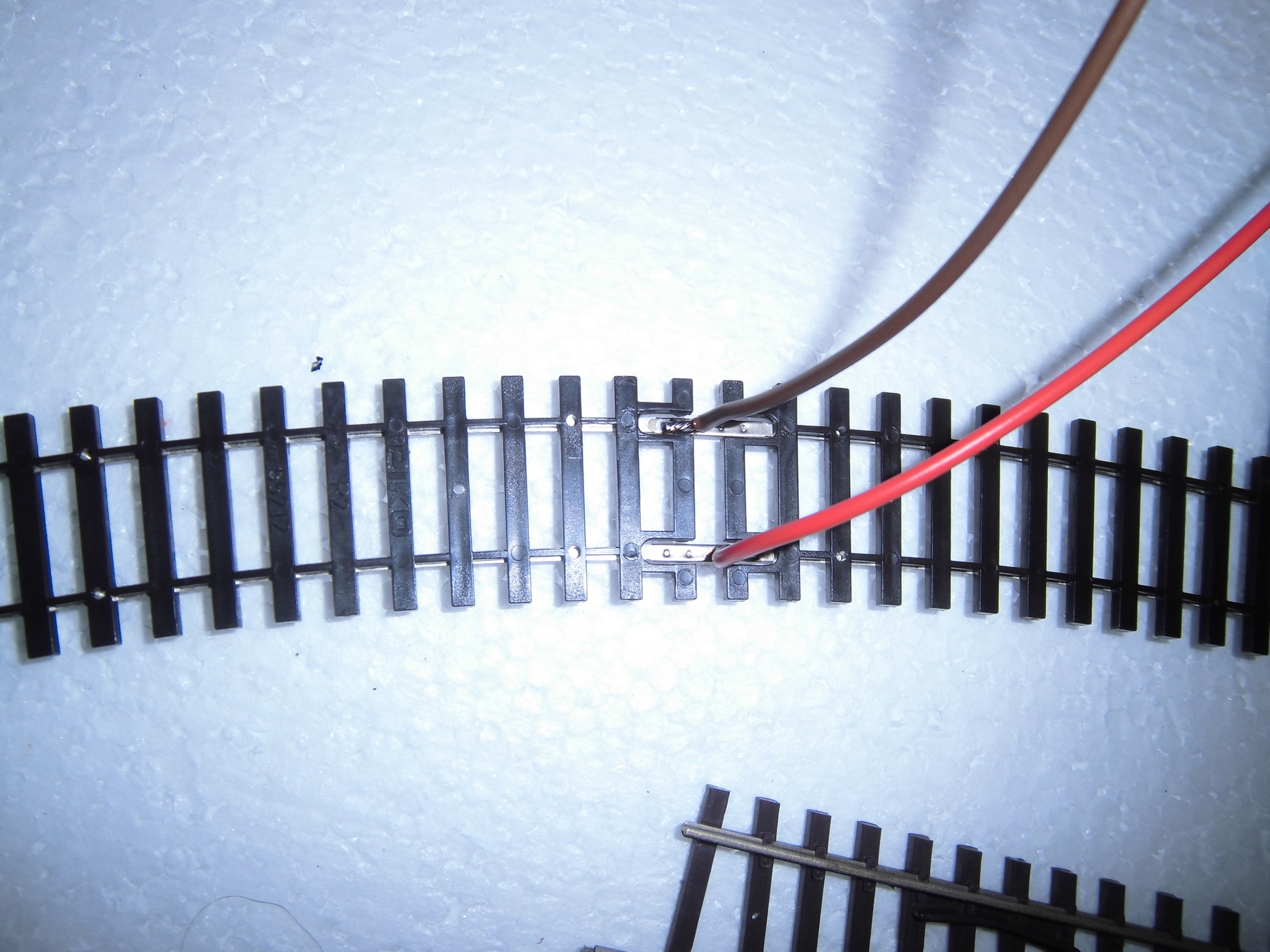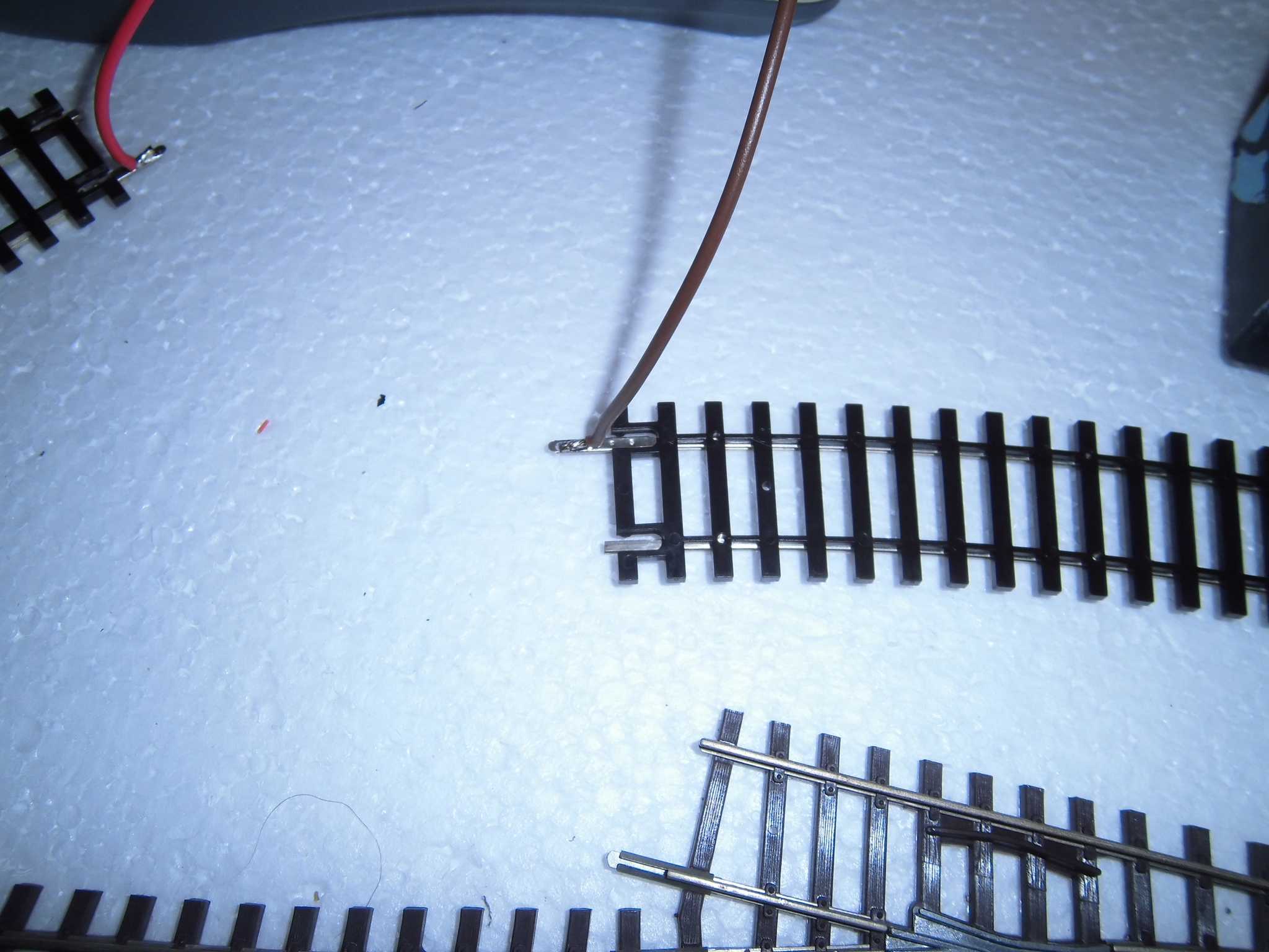 Ještě před nalepením kolejí je potřeba si rozvrhnout kudy povedou napájecí vodiče a vyvrtat na ně díry. Také připájet vodiče ke kolejím. Já jsem vodiče připájel na kolejové spojky (obrázky níže). Tím jsem zaručil to, že vodiče nebudou téměř vůbec vidět.