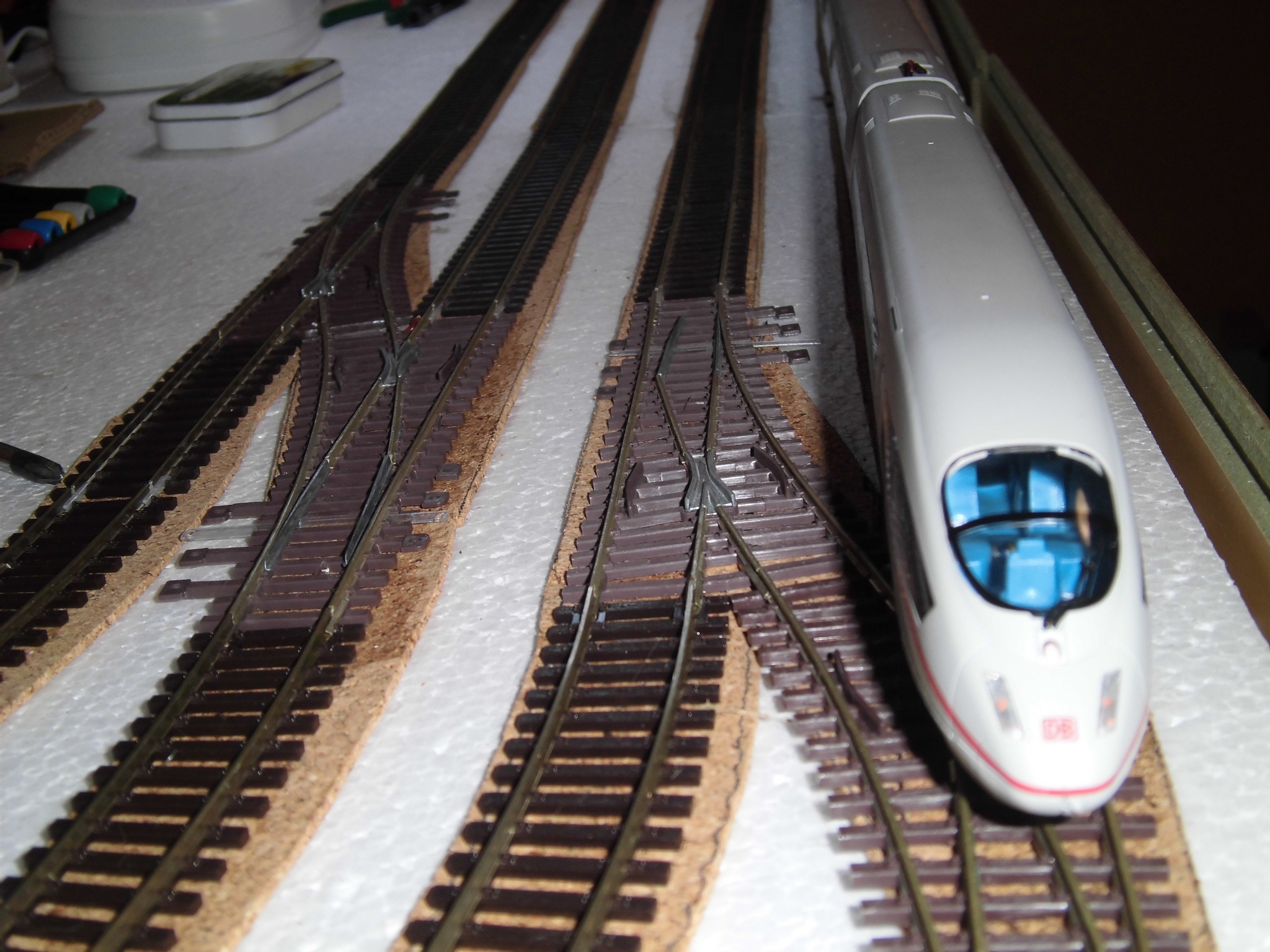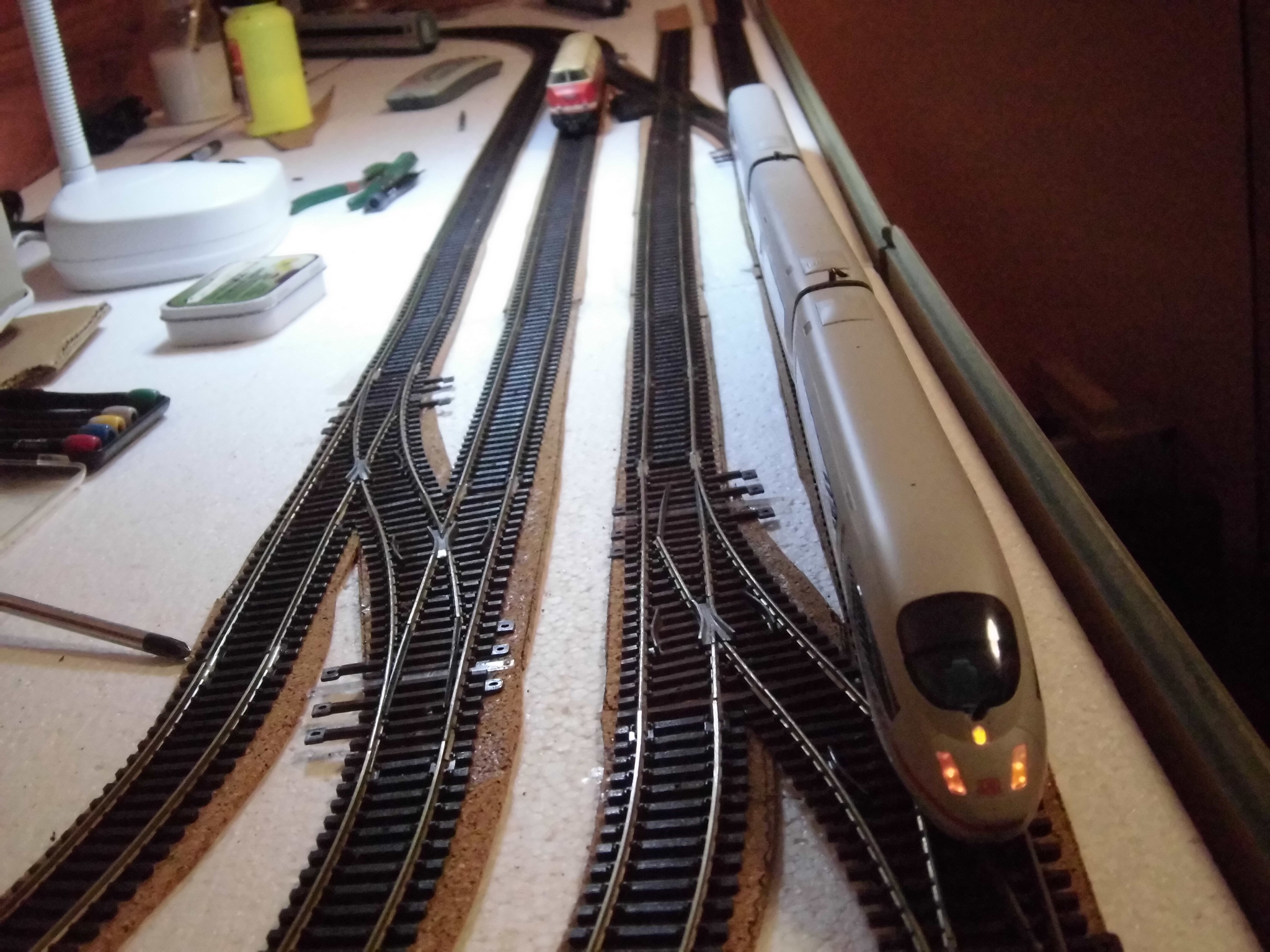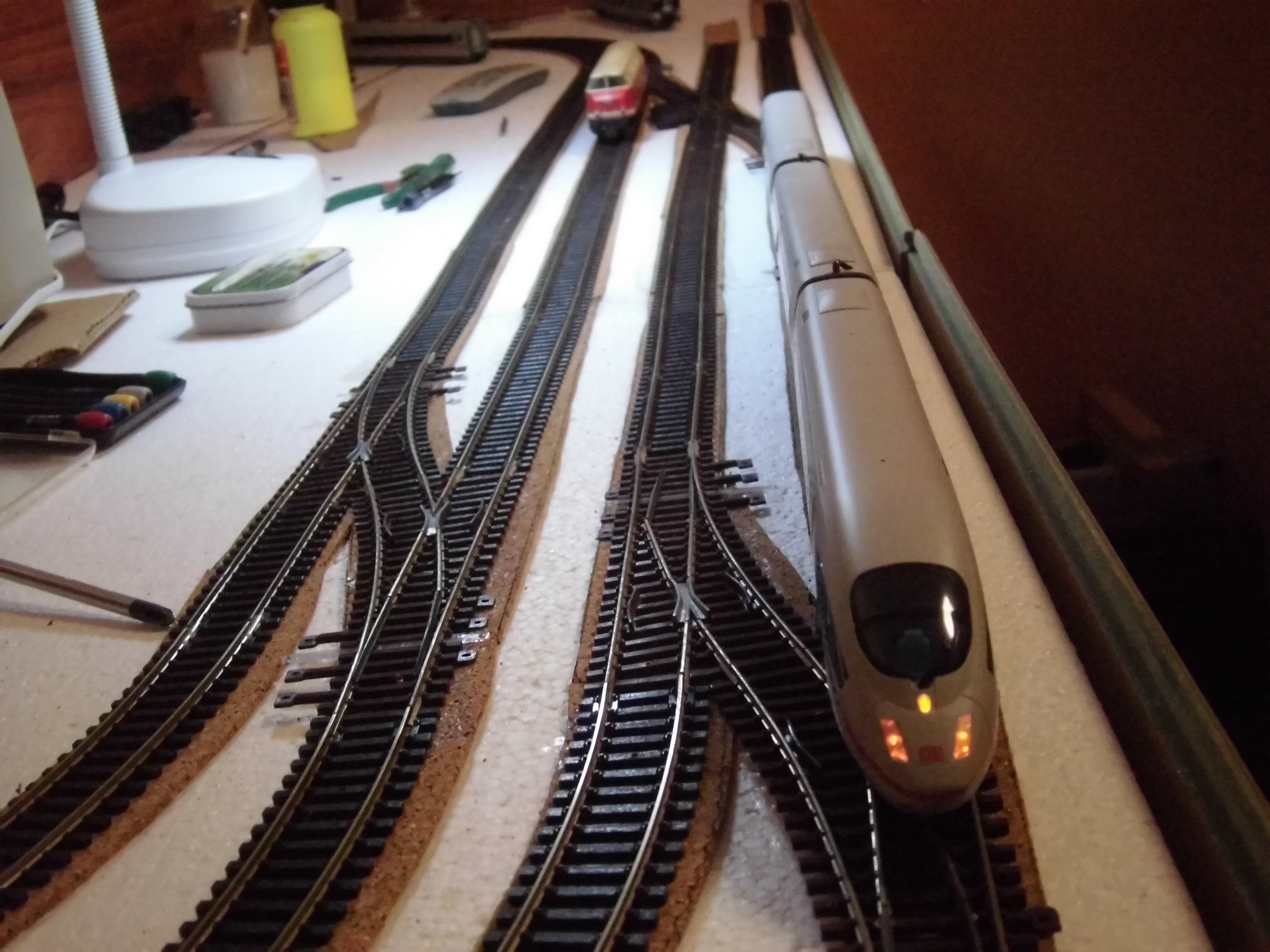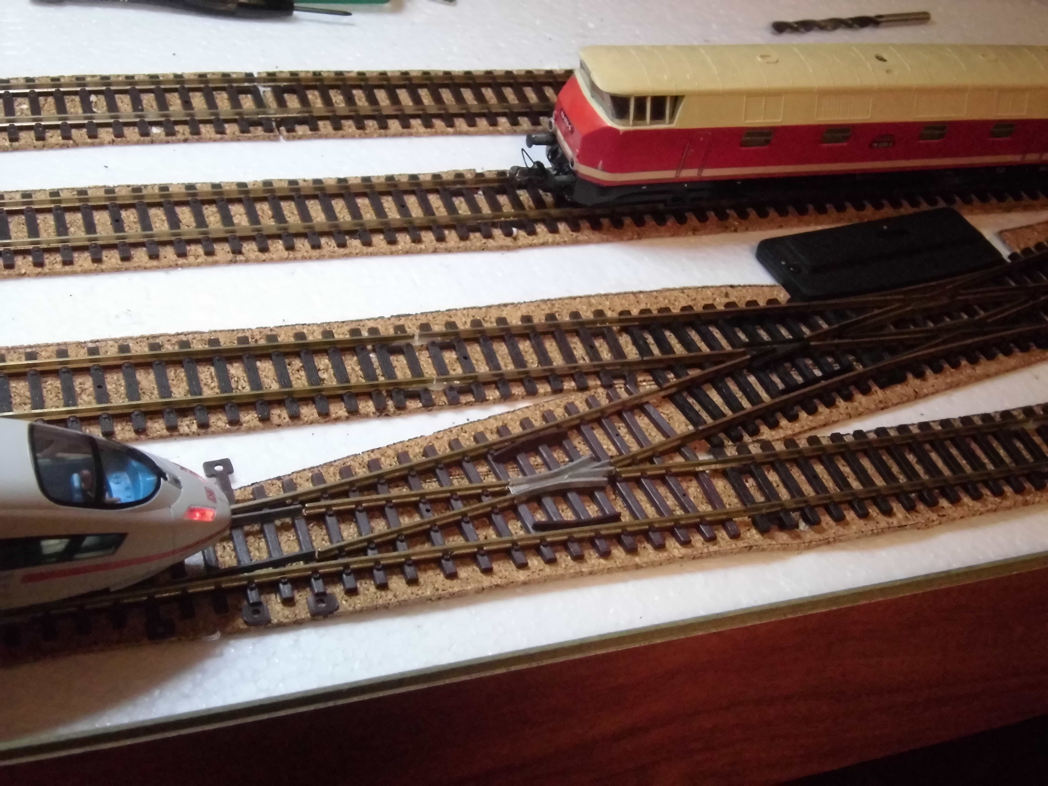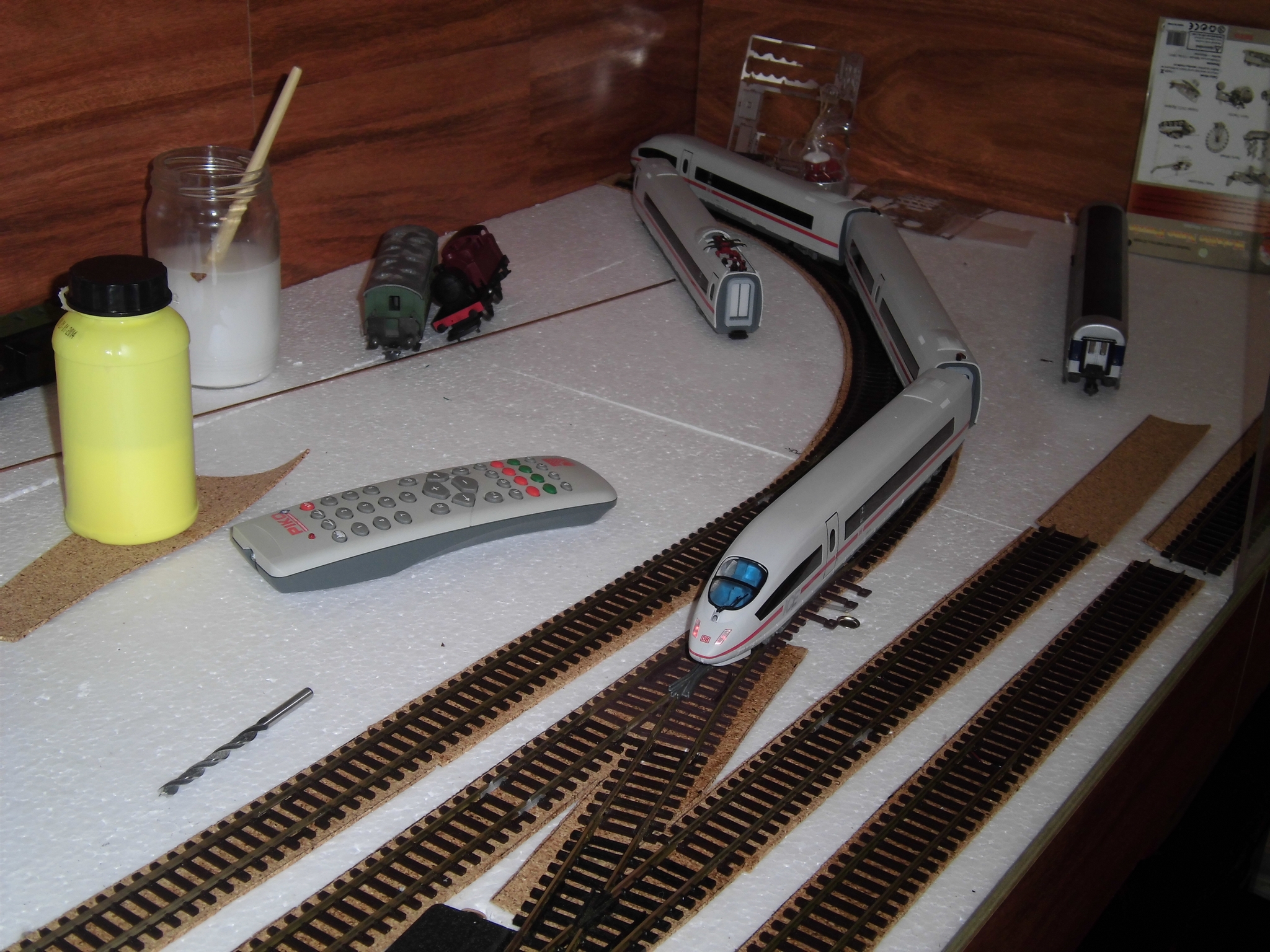 Poté, co jsem měl všechny koleje nachystané, nařezané, vyzkoušené a natahané kabely, tak jsem mohl začít lepit. Nejprve jsem nalepil korkové podloží, nechal zaschnout zatížené a poté jsem teprve lepil koleje. Ty jsem lepil postupně a zkoušel každý nalepený úsek. Obzvlášť problém je se změnou výšky, aby nebyly koleje na nějakém místě “zlomené”. Tyto místa jsem podkládal polystyrenem a korkem.